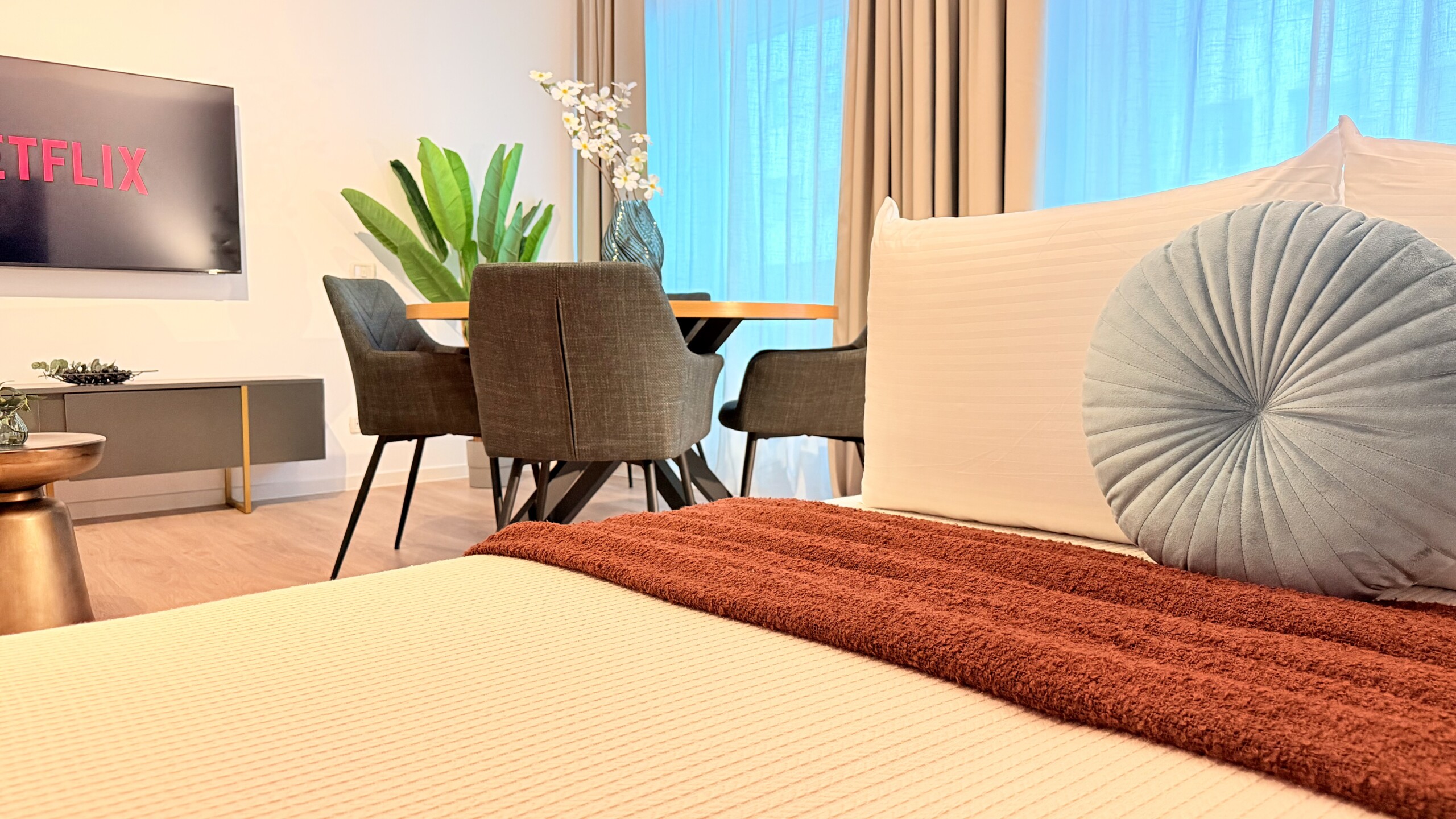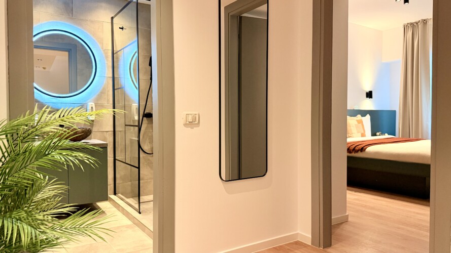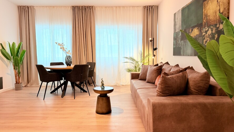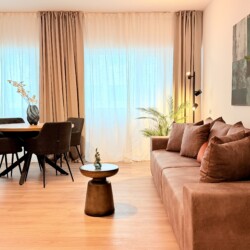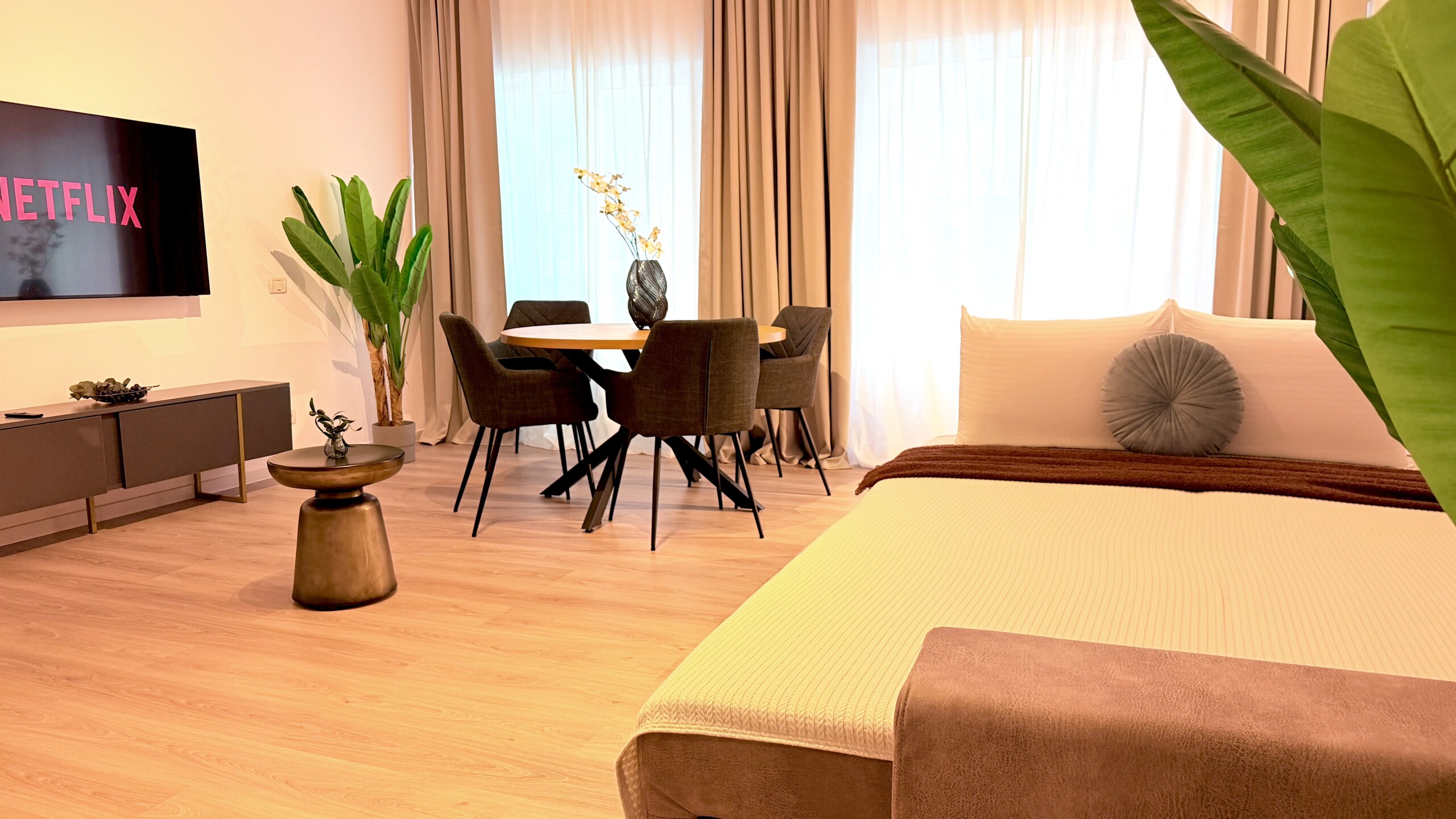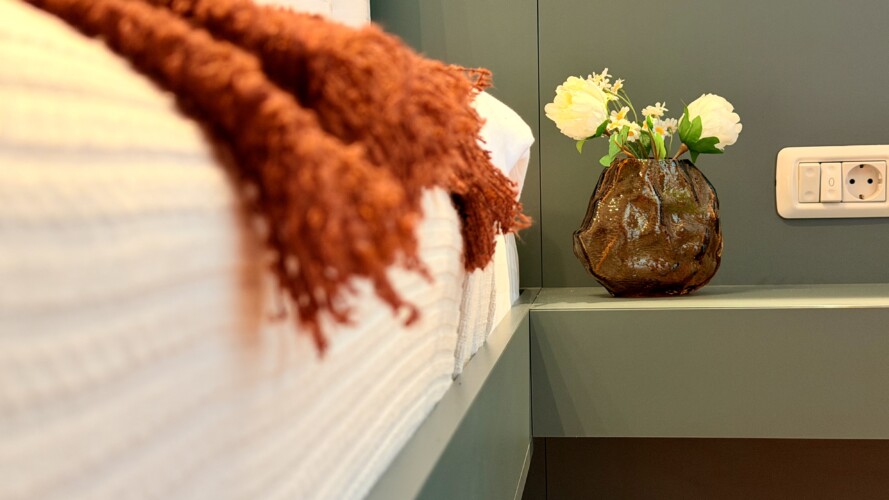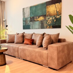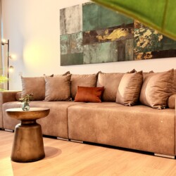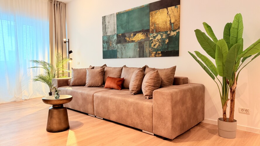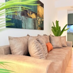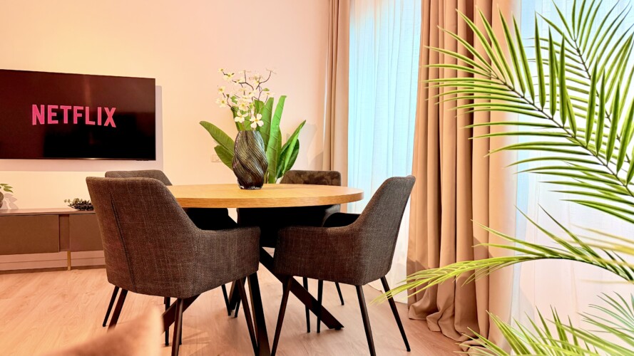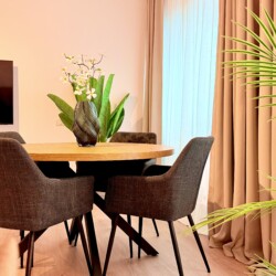 Step into a space where comfort meets charm in our elegant, light-filled apartment. Relax in the inviting living room and enjoy a true cinema-style experience, or retreat to the bedroom where a unique suspended chair creates a cozy and memorable atmosphere.