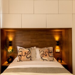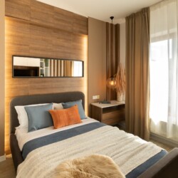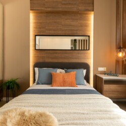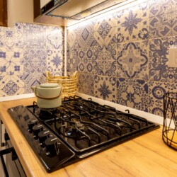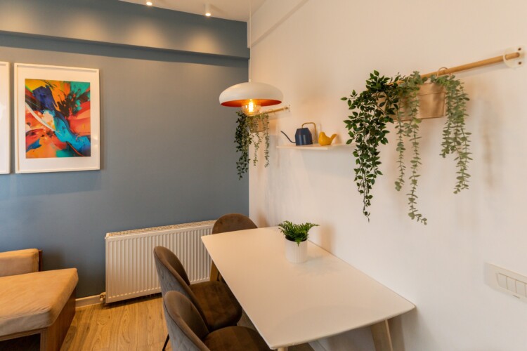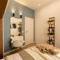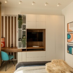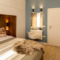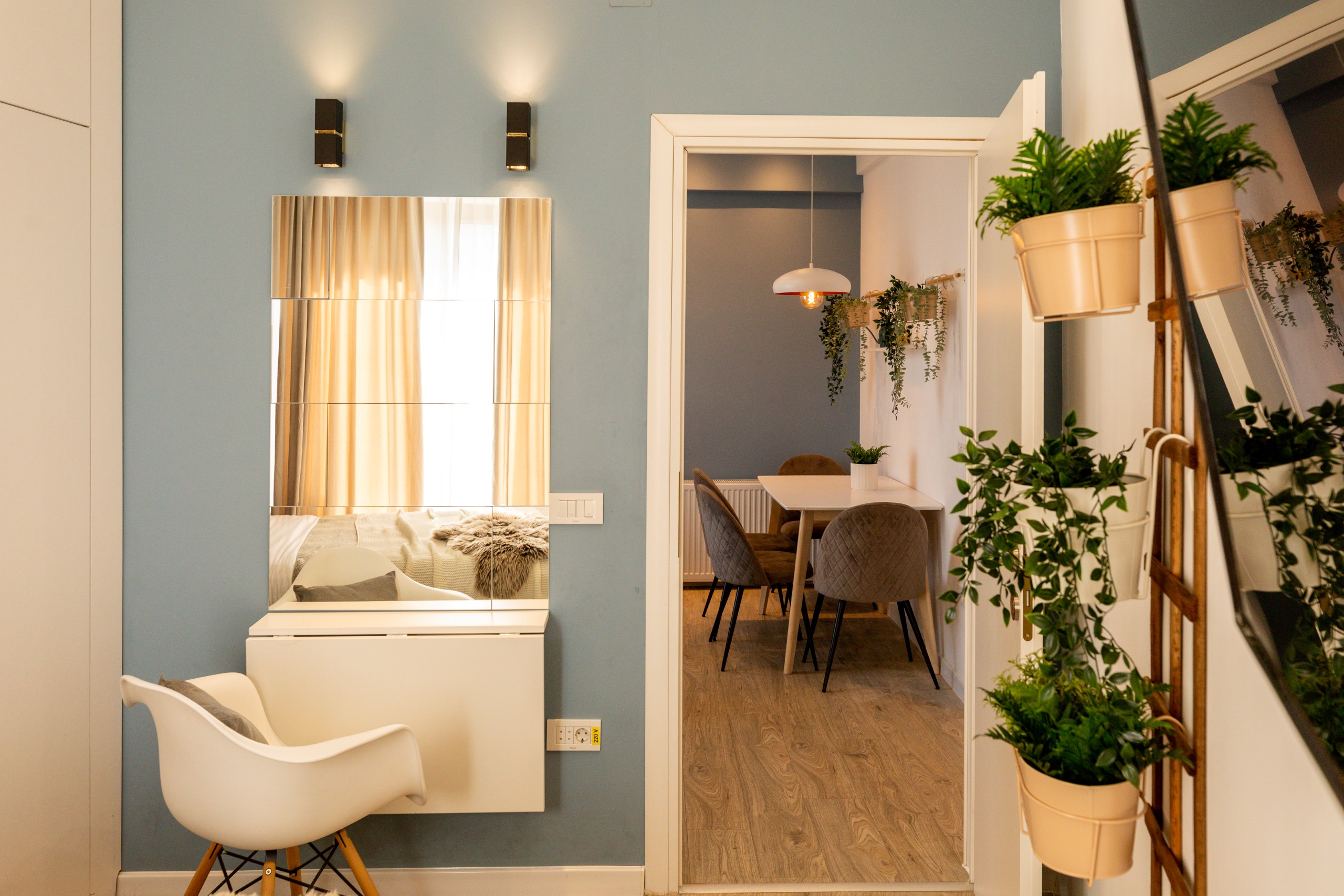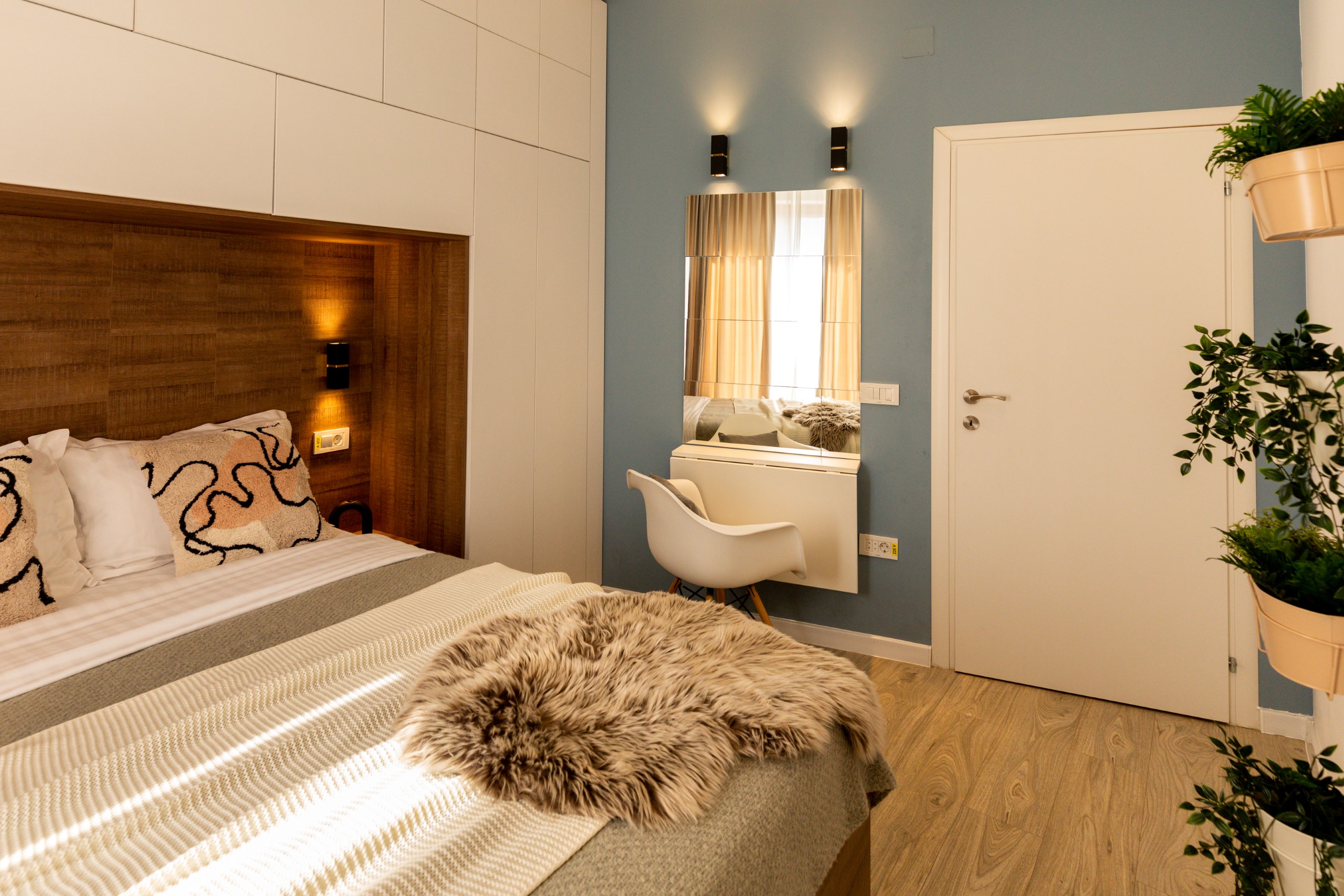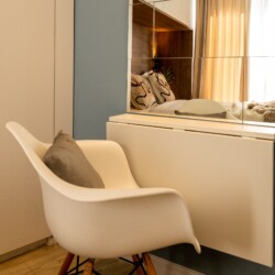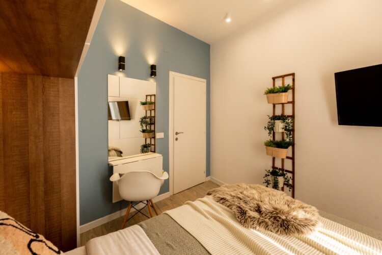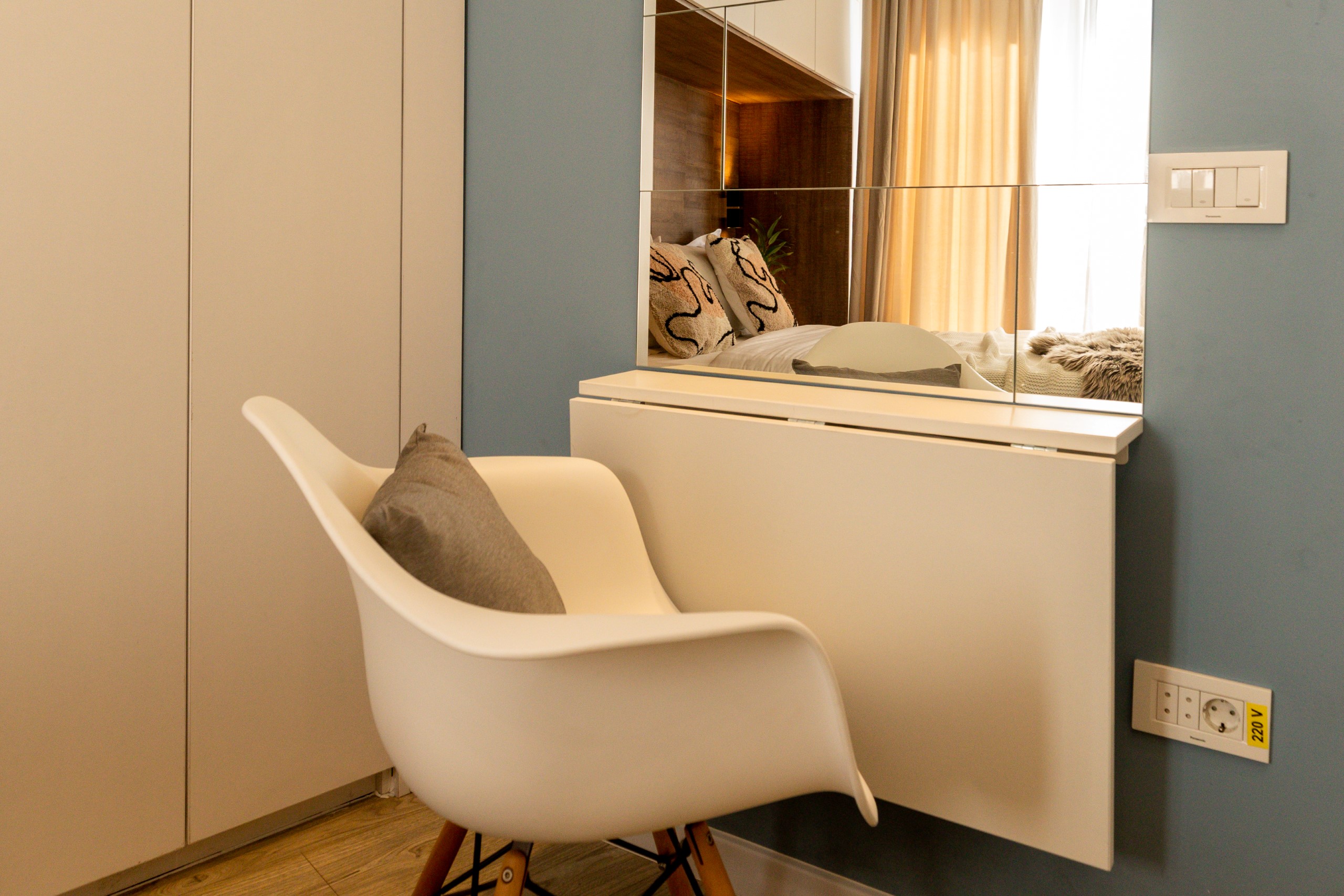 You’ll be surrounded by beautiful wood details and chic white furniture, perfectly complementing the abundance of natural light that floods the space. The blue accents on the walls add a pop of color to the otherwise neutral palette, creating a calming and stylish atmosphere.