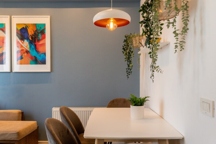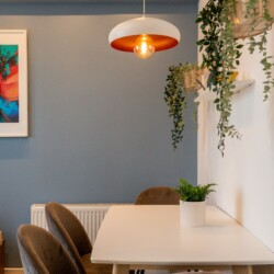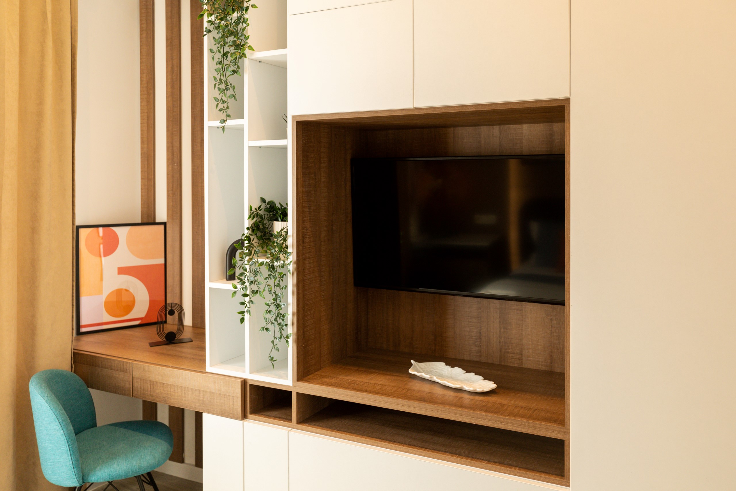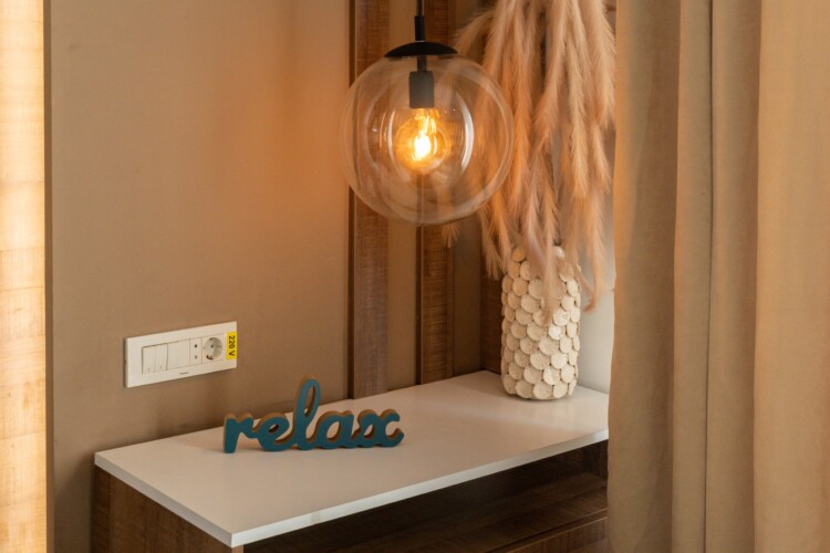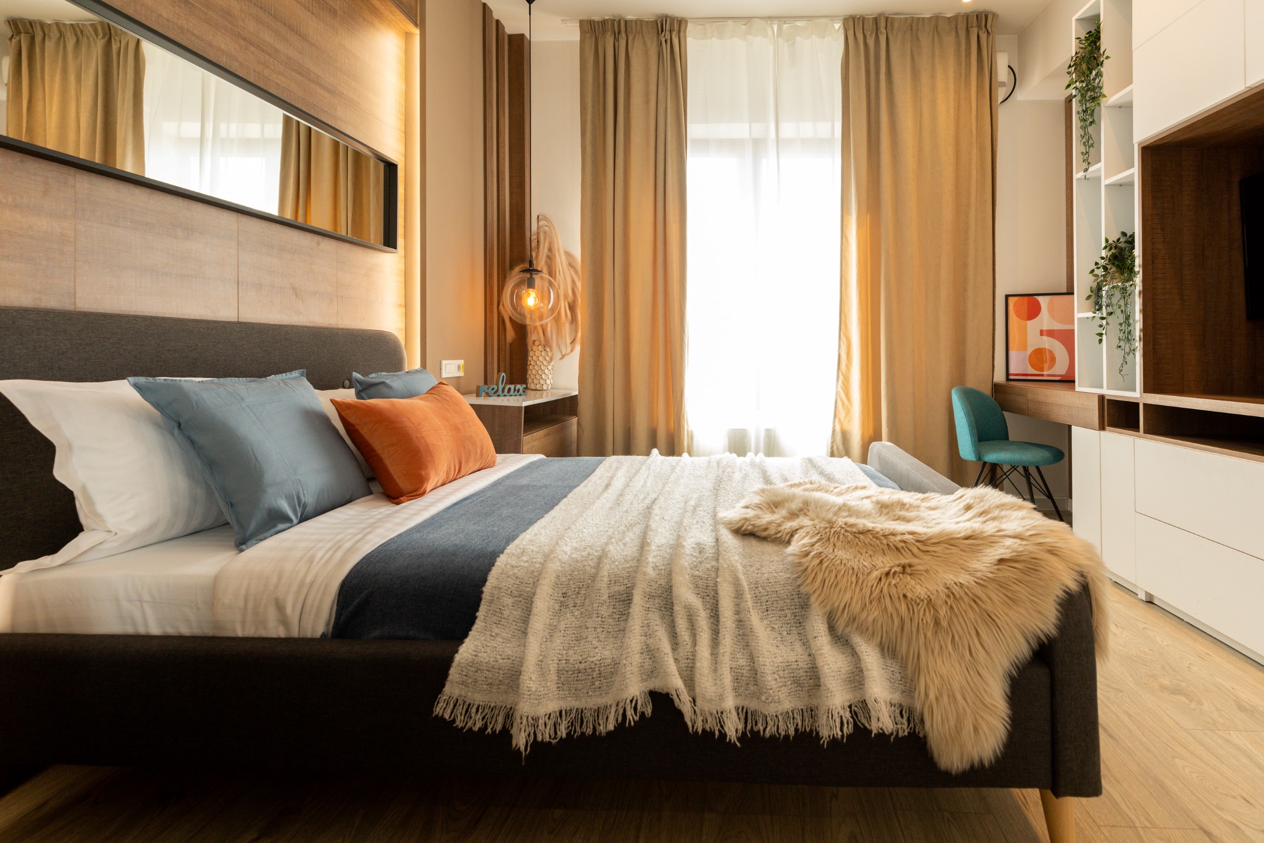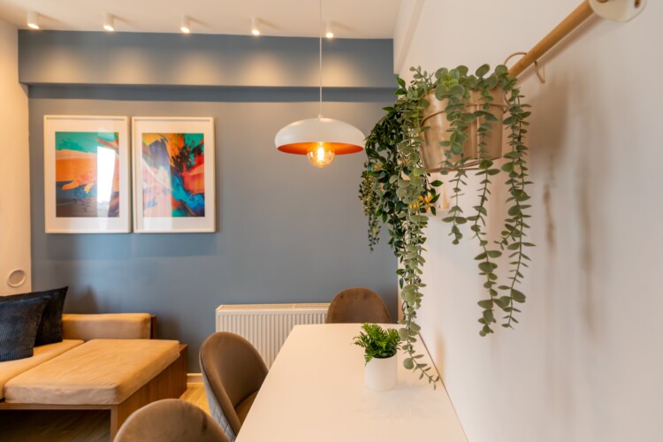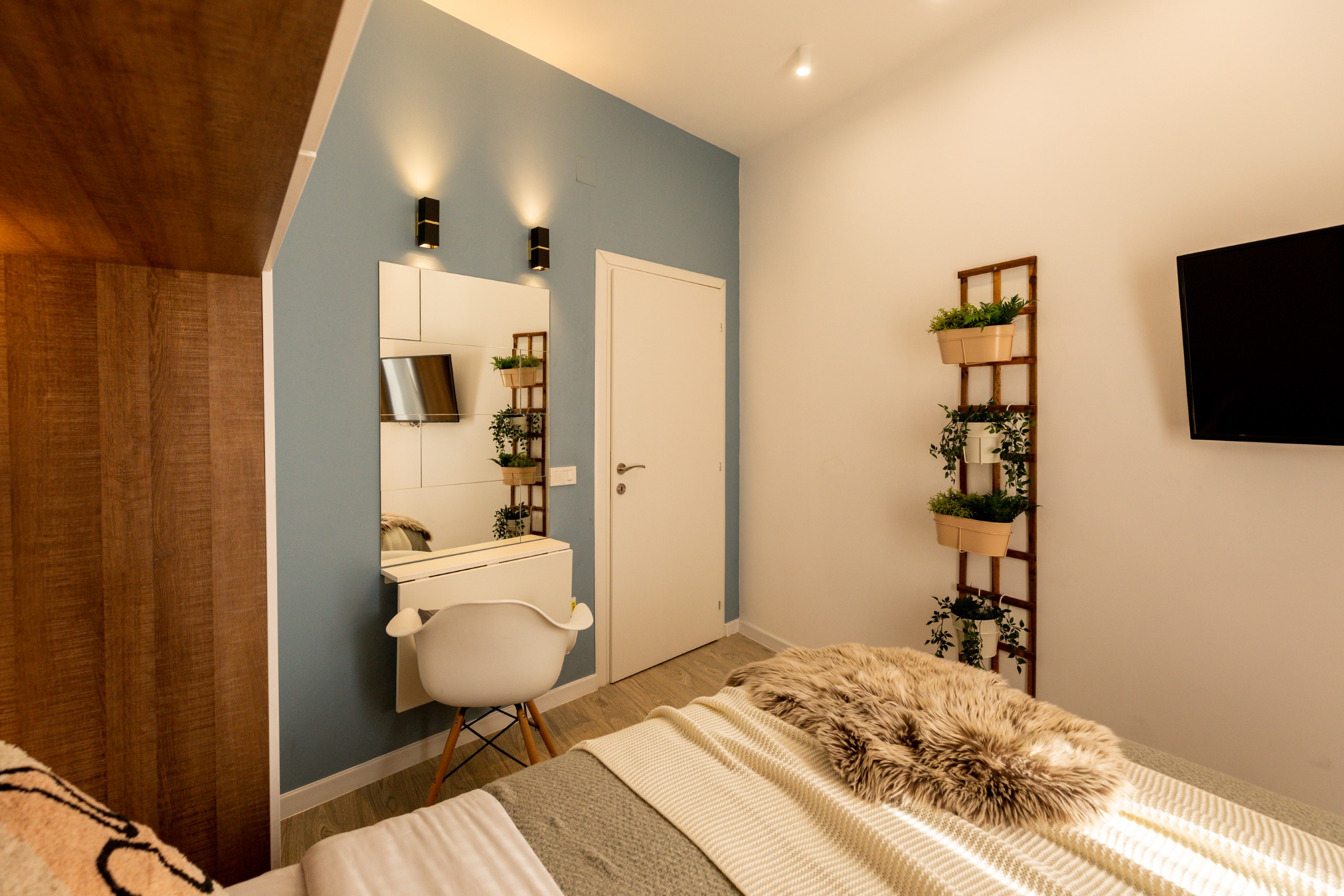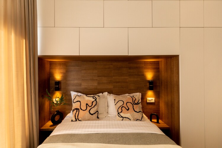 You’ll be surrounded by beautiful wood details and chic white furniture, perfectly complementing the abundance of natural light that floods the space. The blue accents on the walls add a pop of color to the otherwise neutral palette, creating a calming and stylish atmosphere.