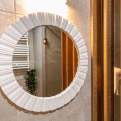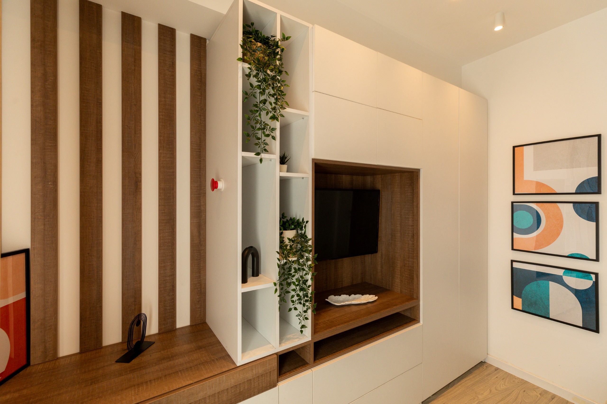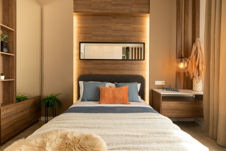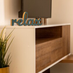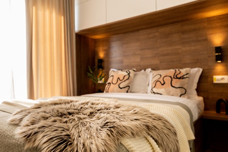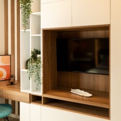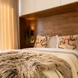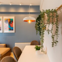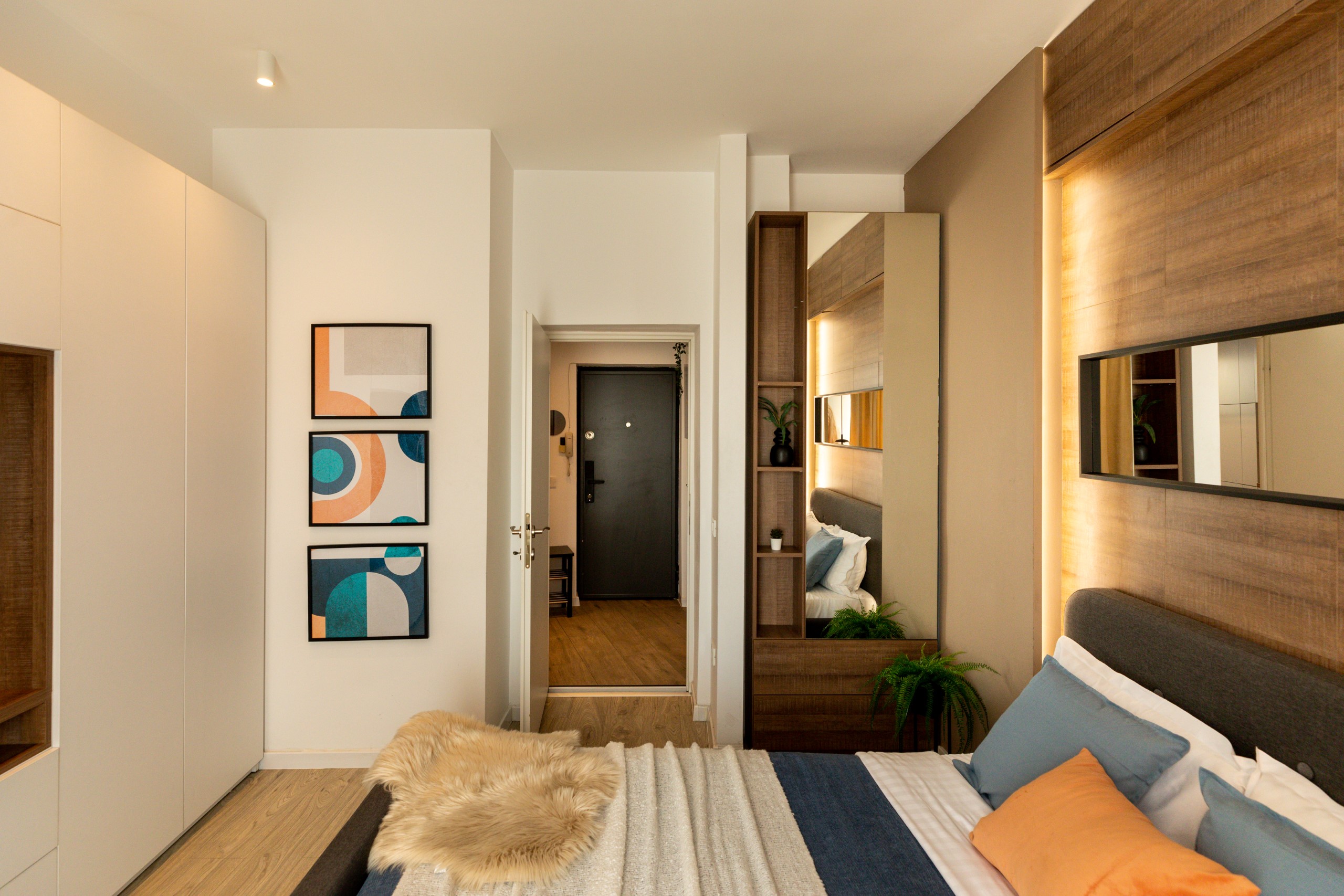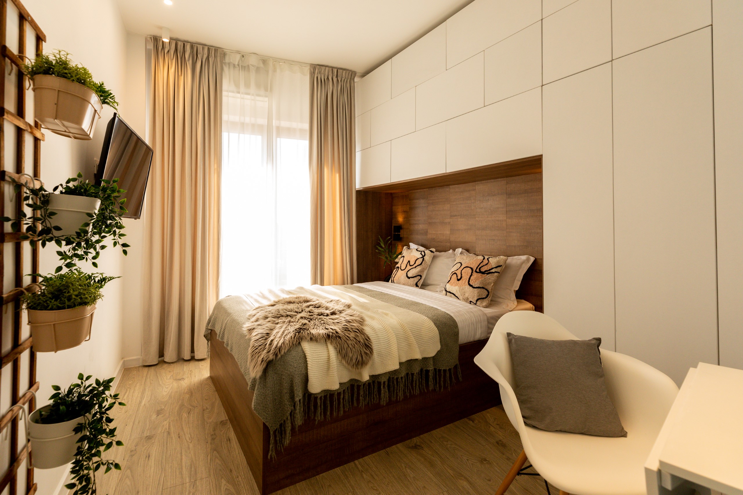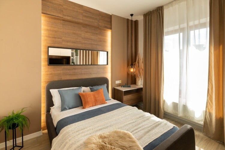You’ll be surrounded by beautiful wood details and chic white furniture, perfectly complementing the abundance of natural light that floods the space. The blue accents on the walls add a pop of color to the otherwise neutral palette, creating a calming and stylish atmosphere.