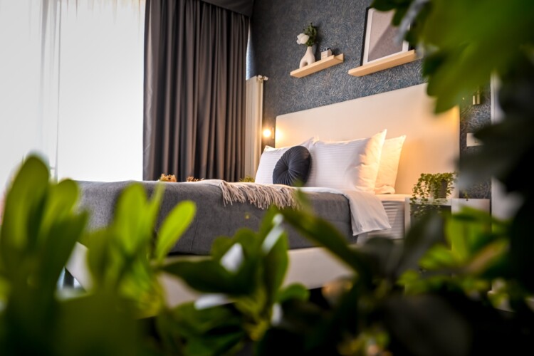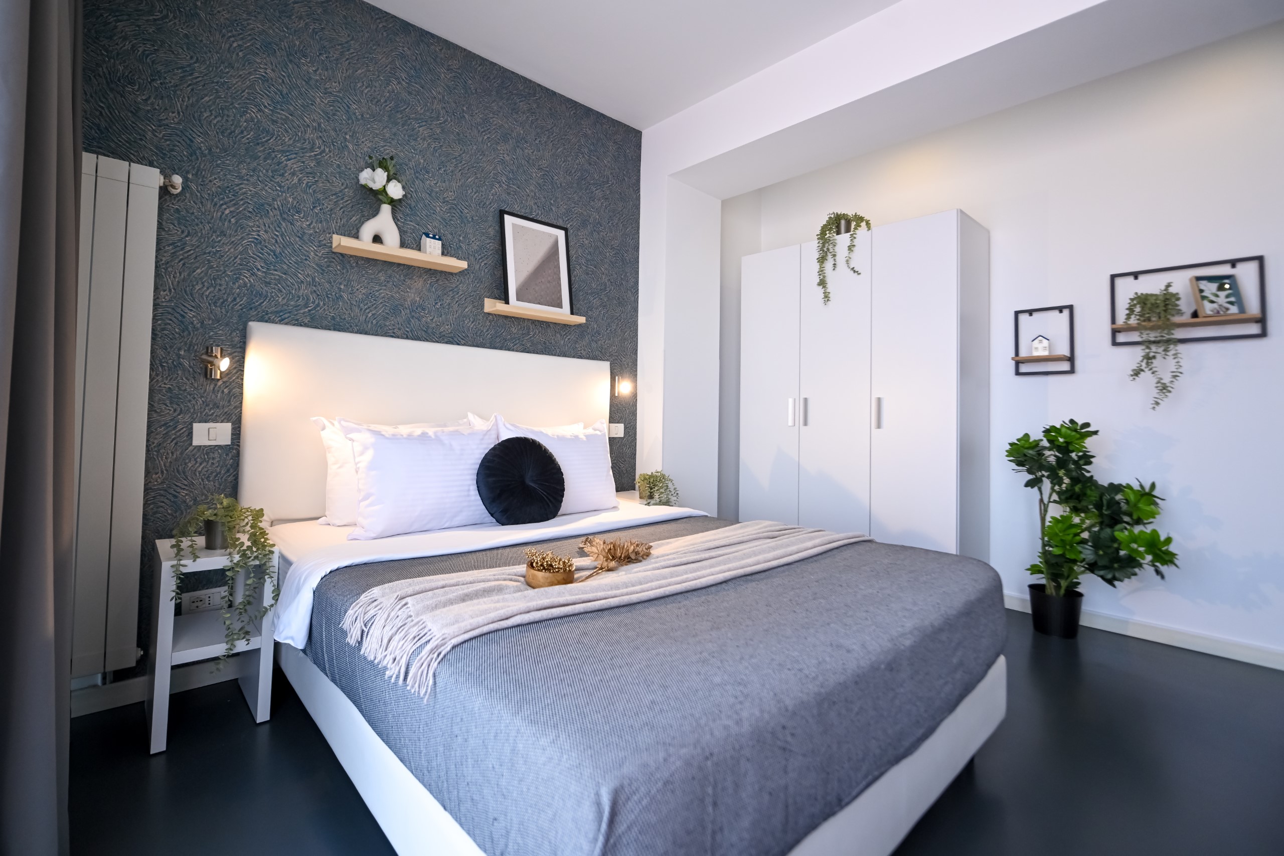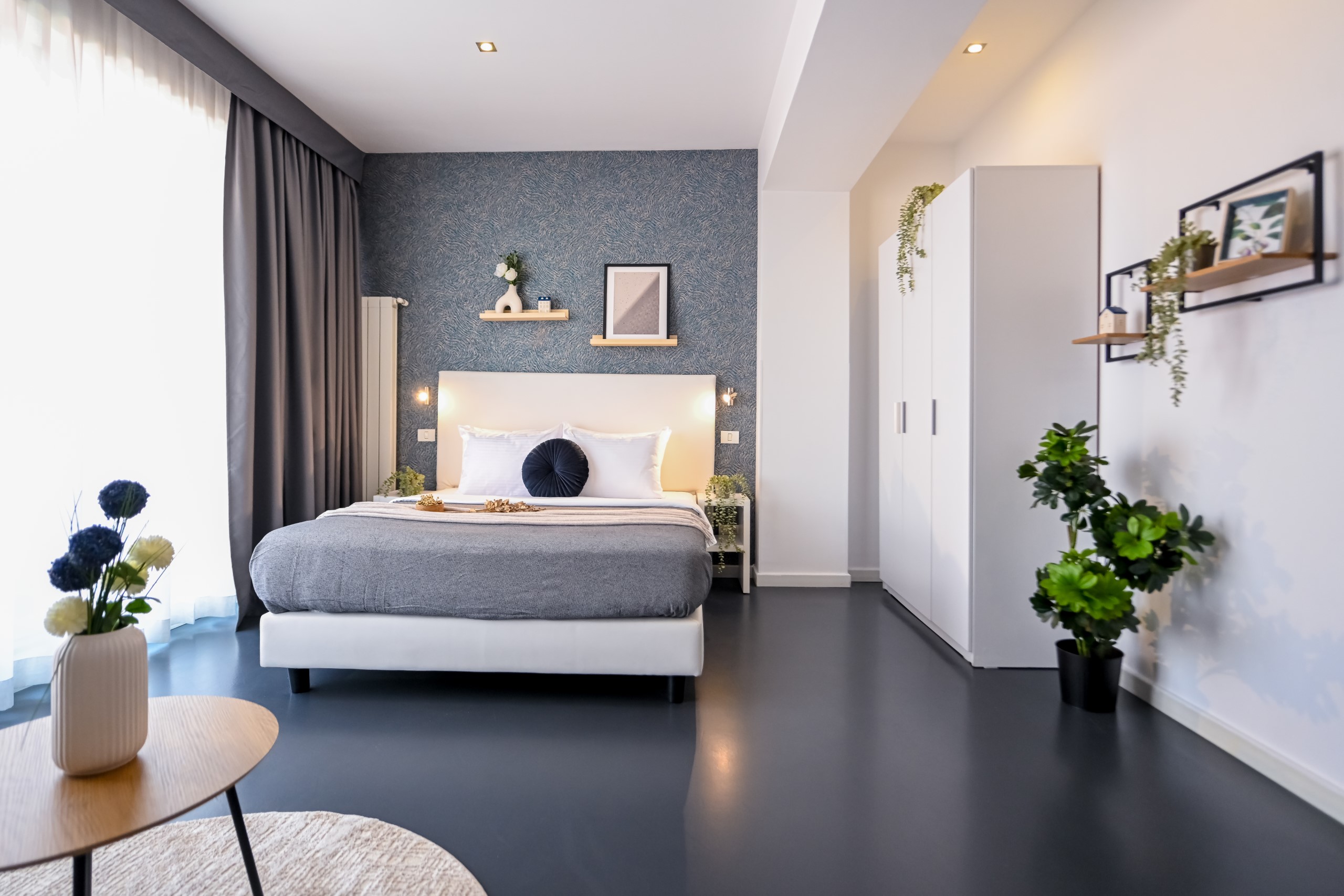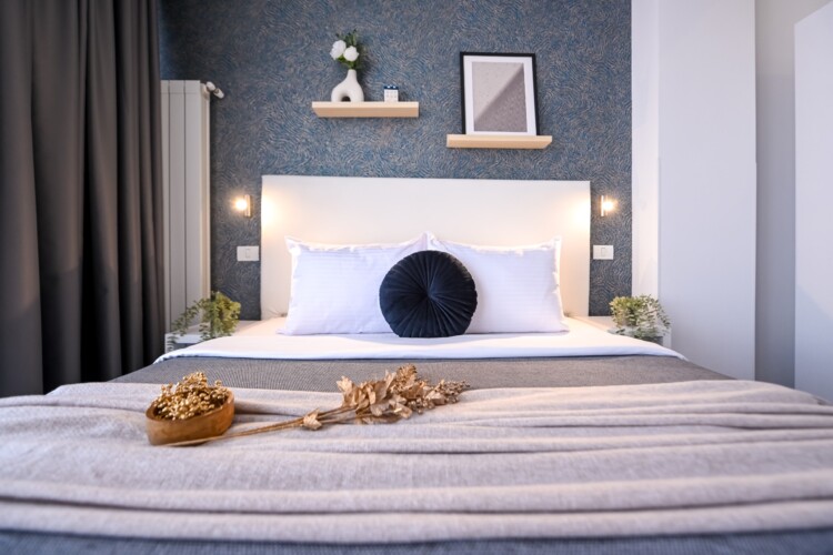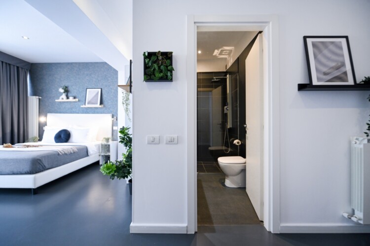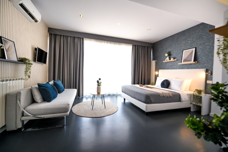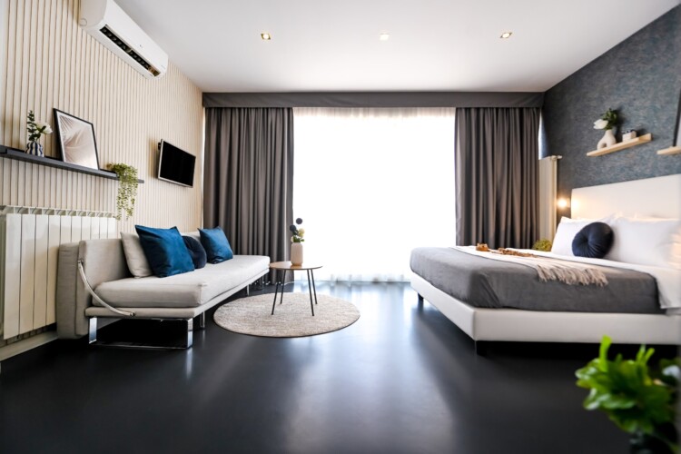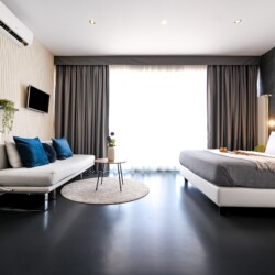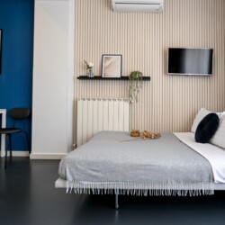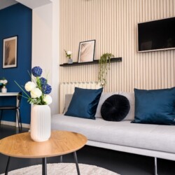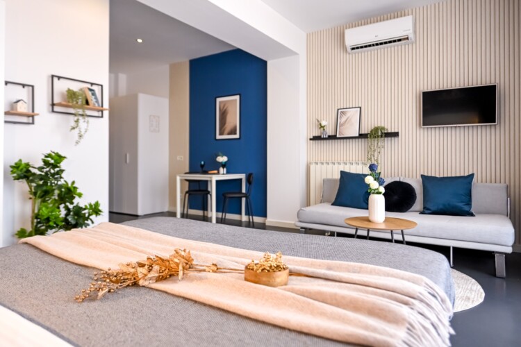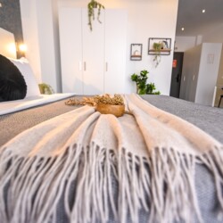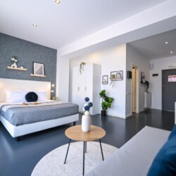 This contemporary studio features a modern kitchen, high-speed Wi-Fi, and a comfortable sleeping area, offering both comfort and convenience.