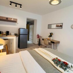 This compact yet functional space features a cozy bed, a fully equipped kitchenette, and a sleek bathroom, all designed to make your stay relaxing and hassle-free.