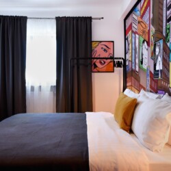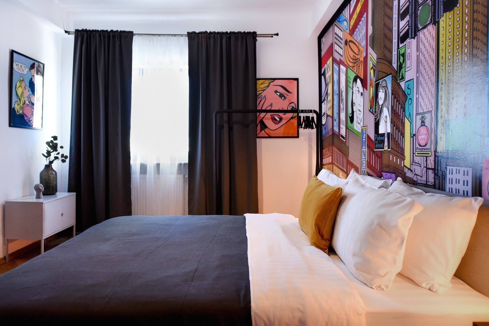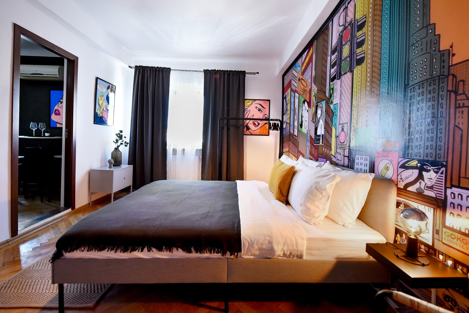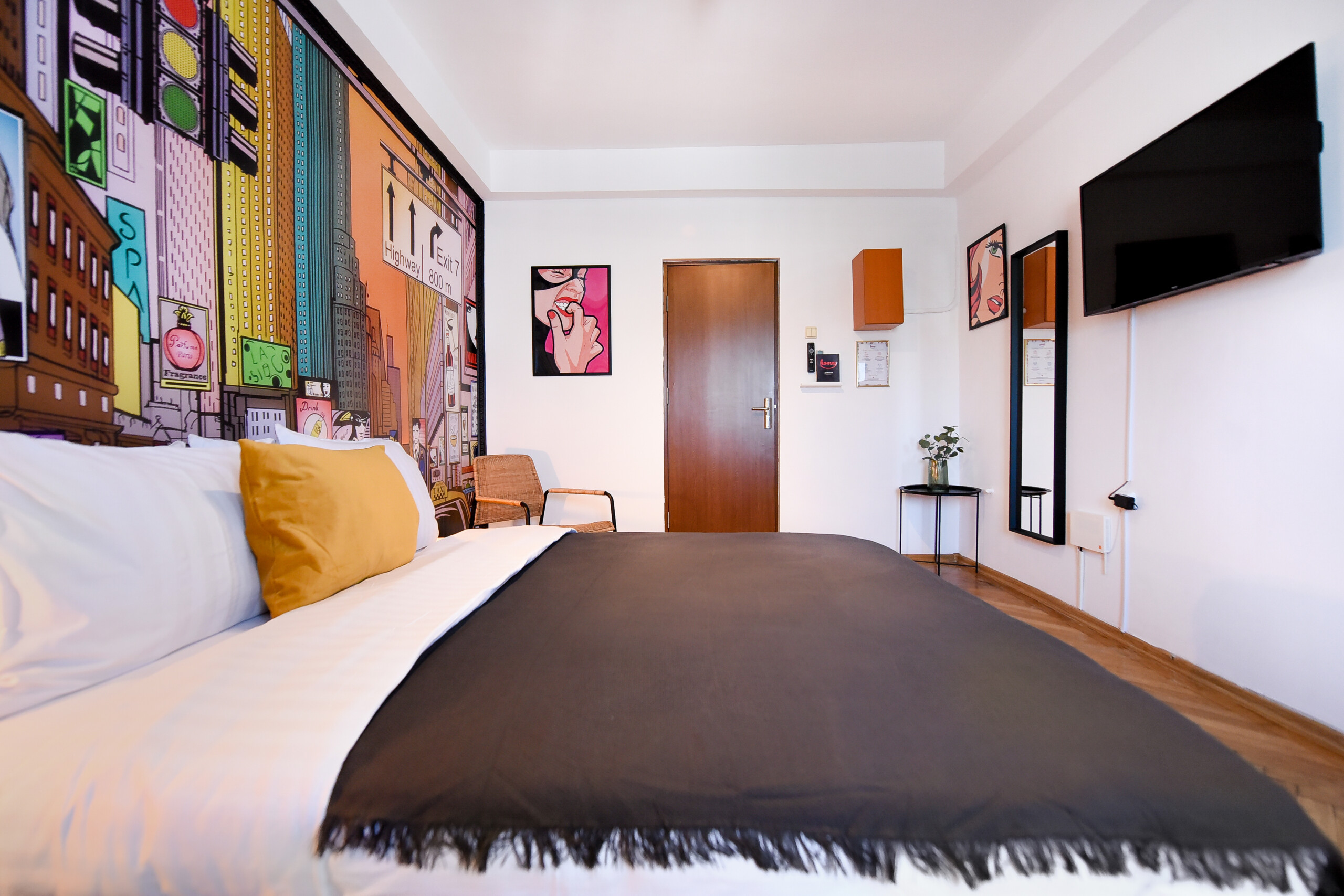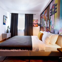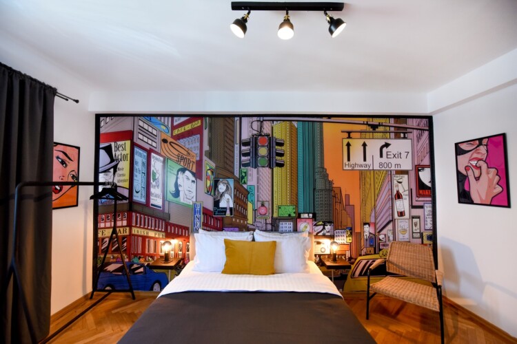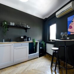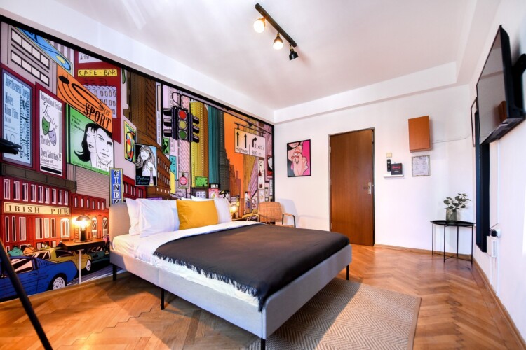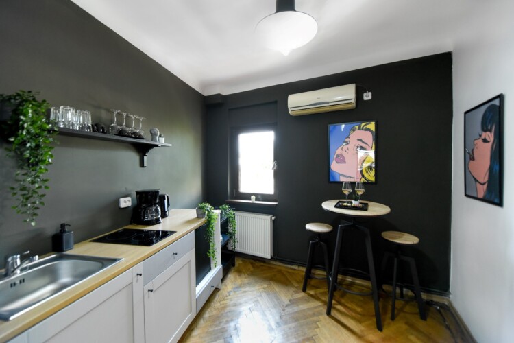Steps away from the famous Old Town streets and located in the heart of Bucharest. This home is all about color contrasts with its white walls, eye-catching wall art, and vibrant furniture. This homey apartment is the ideal choice for those looking to explore all that the city has to offer.