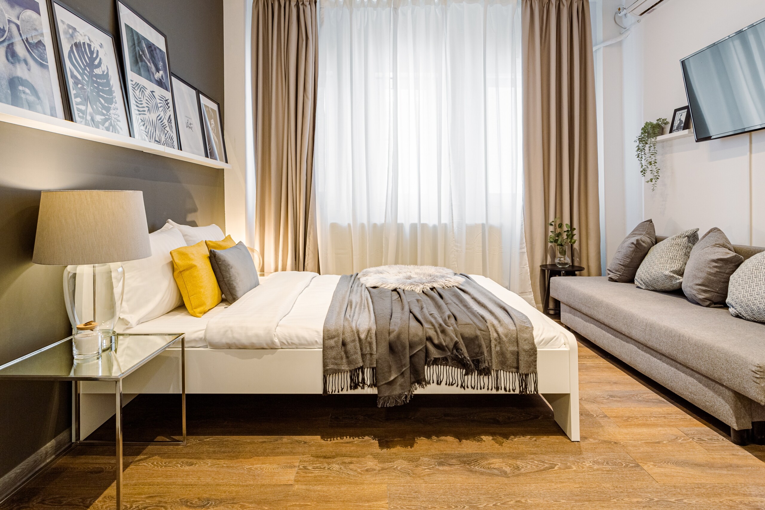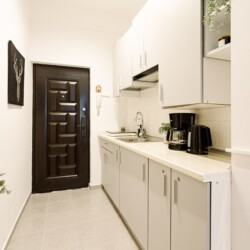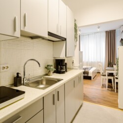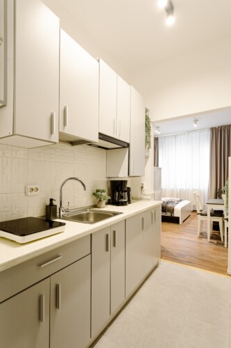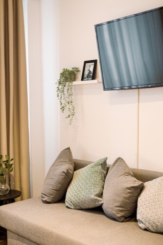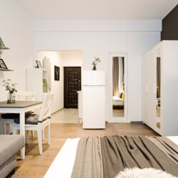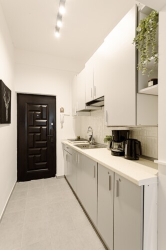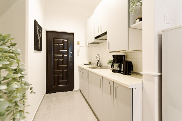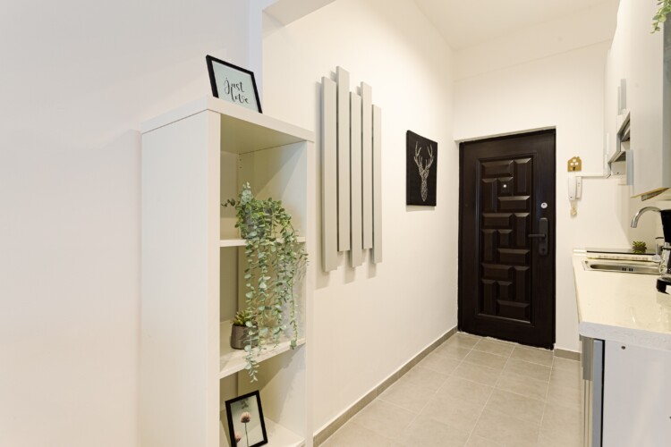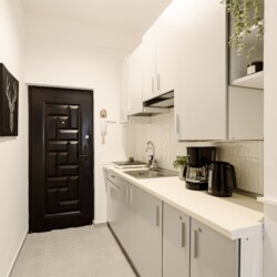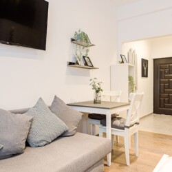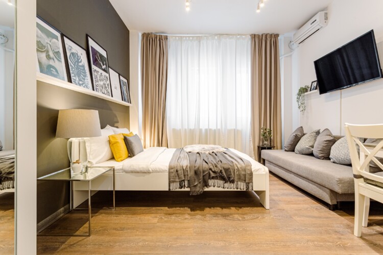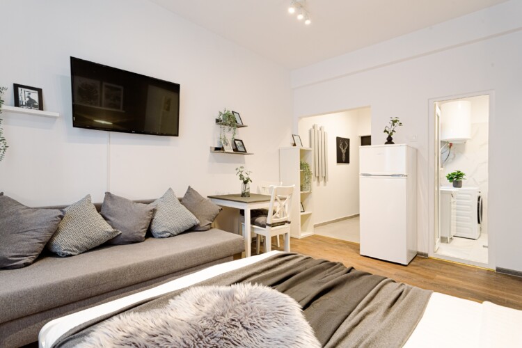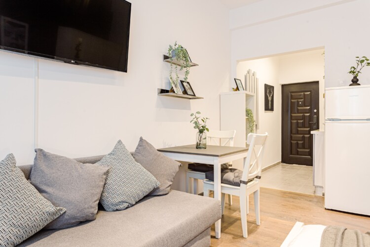 You will enjoy the modern design based on minimalist elements, but offering a warm feeling at the same time, with calming wood and grey tones. More, the studio is offering a comfortable bed and a sofa that will help you sink into the cozy feeling of your new home.