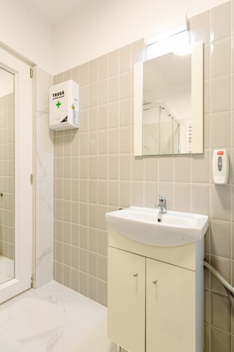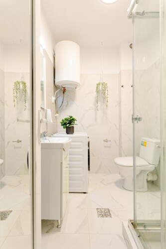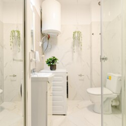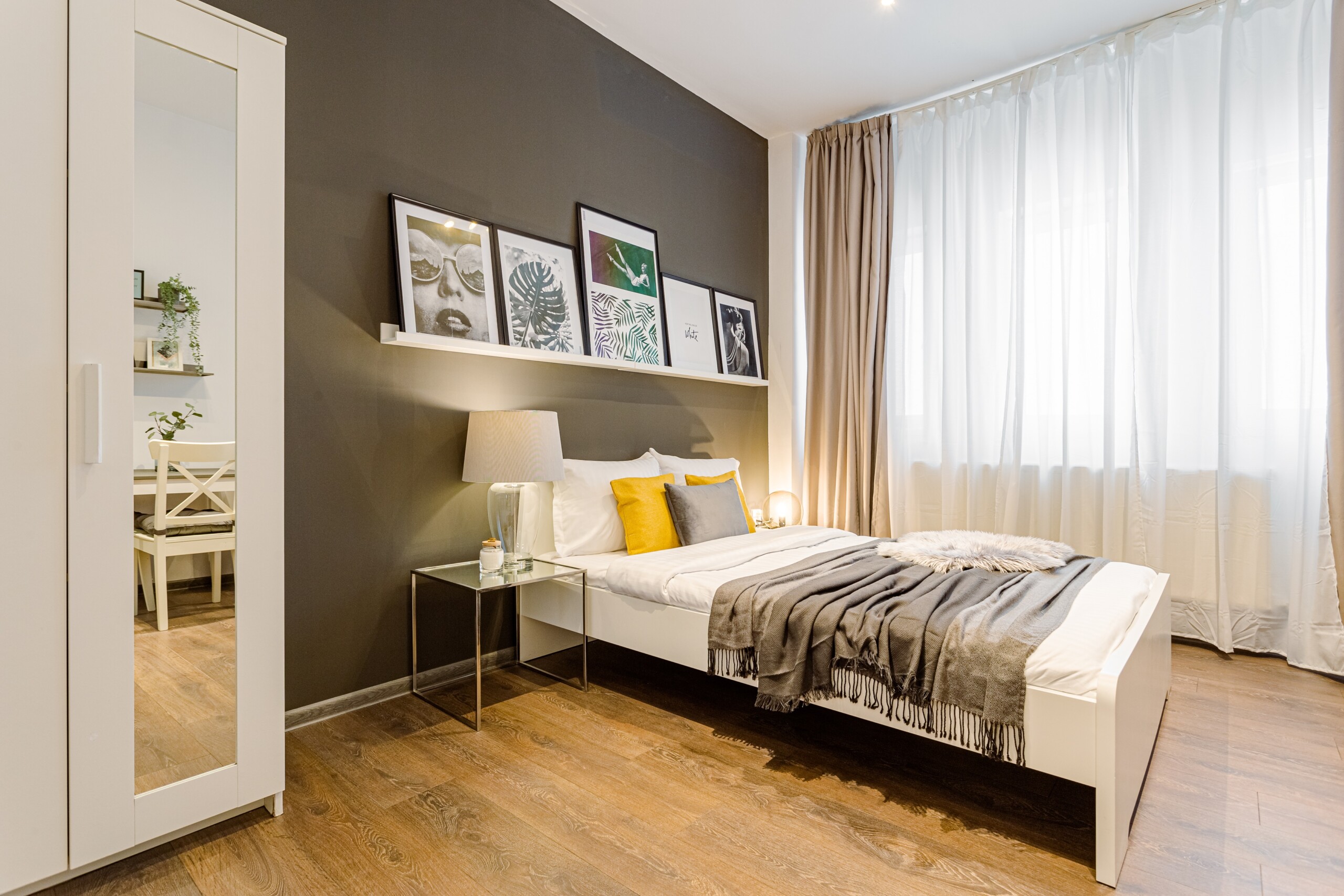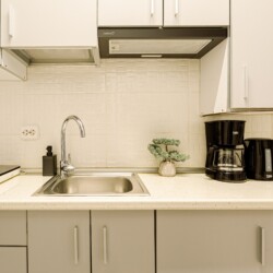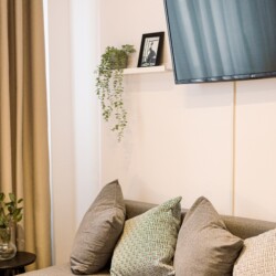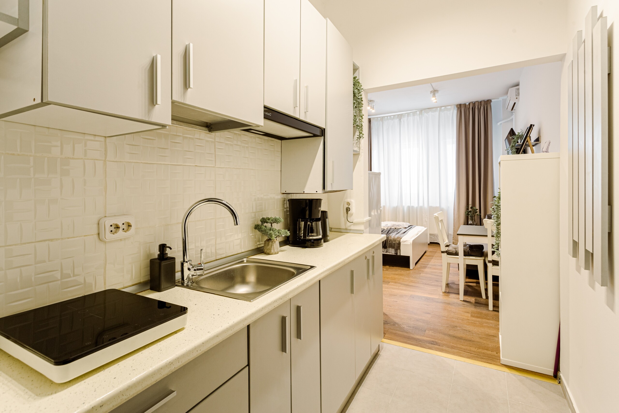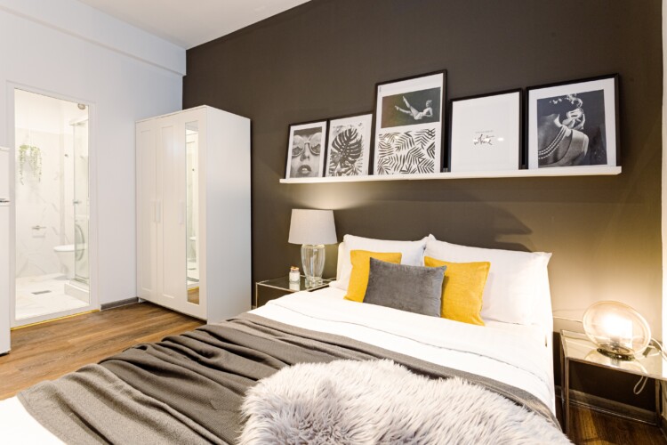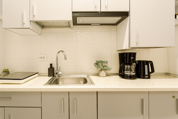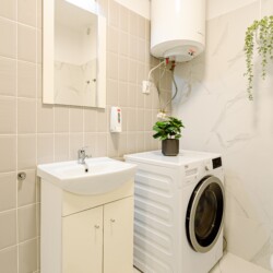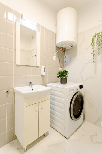 You will enjoy the modern design based on minimalist elements, but offering a warm feeling at the same time, with calming wood and grey tones. More, the studio is offering a comfortable bed and a sofa that will help you sink into the cozy feeling of your new home.