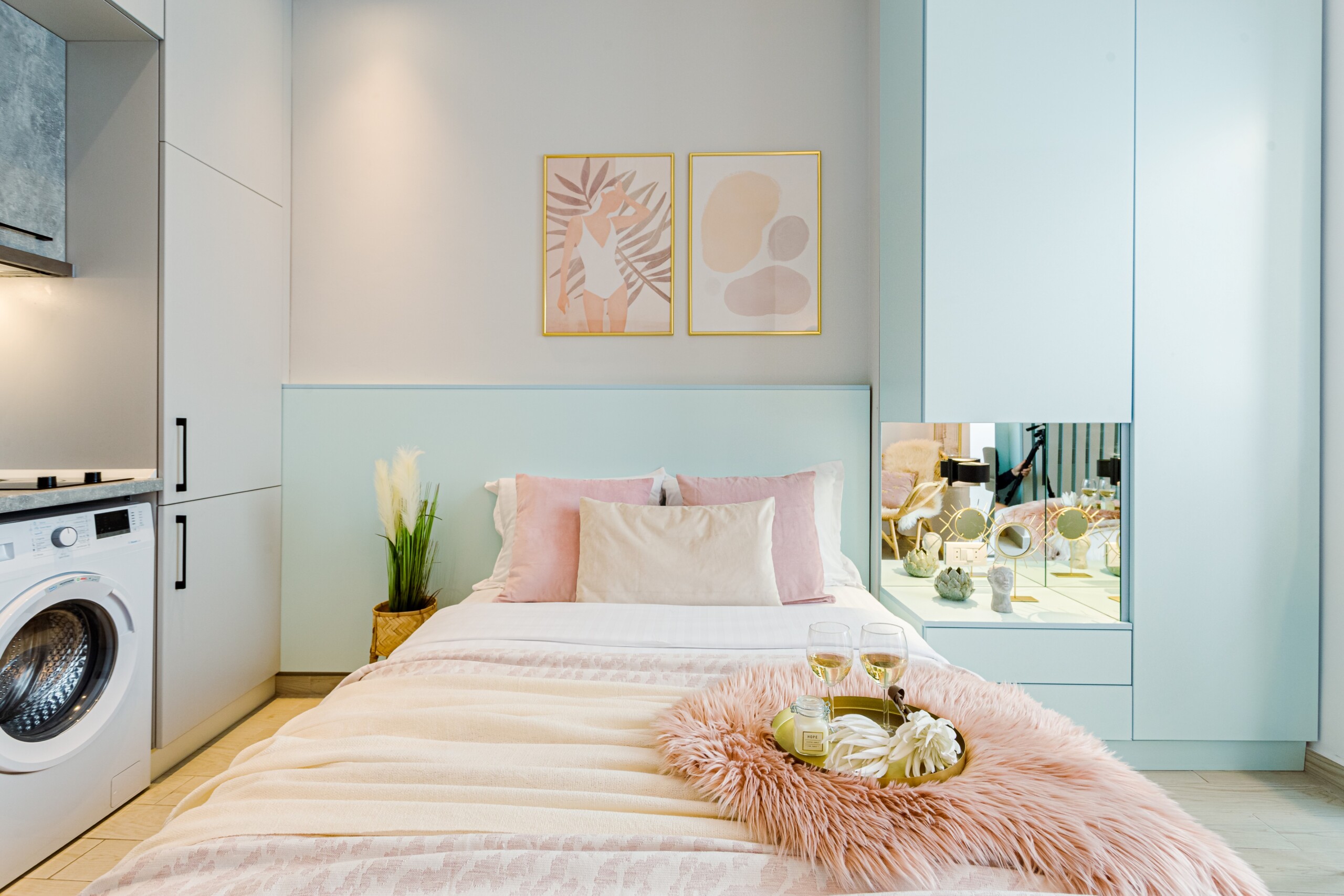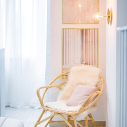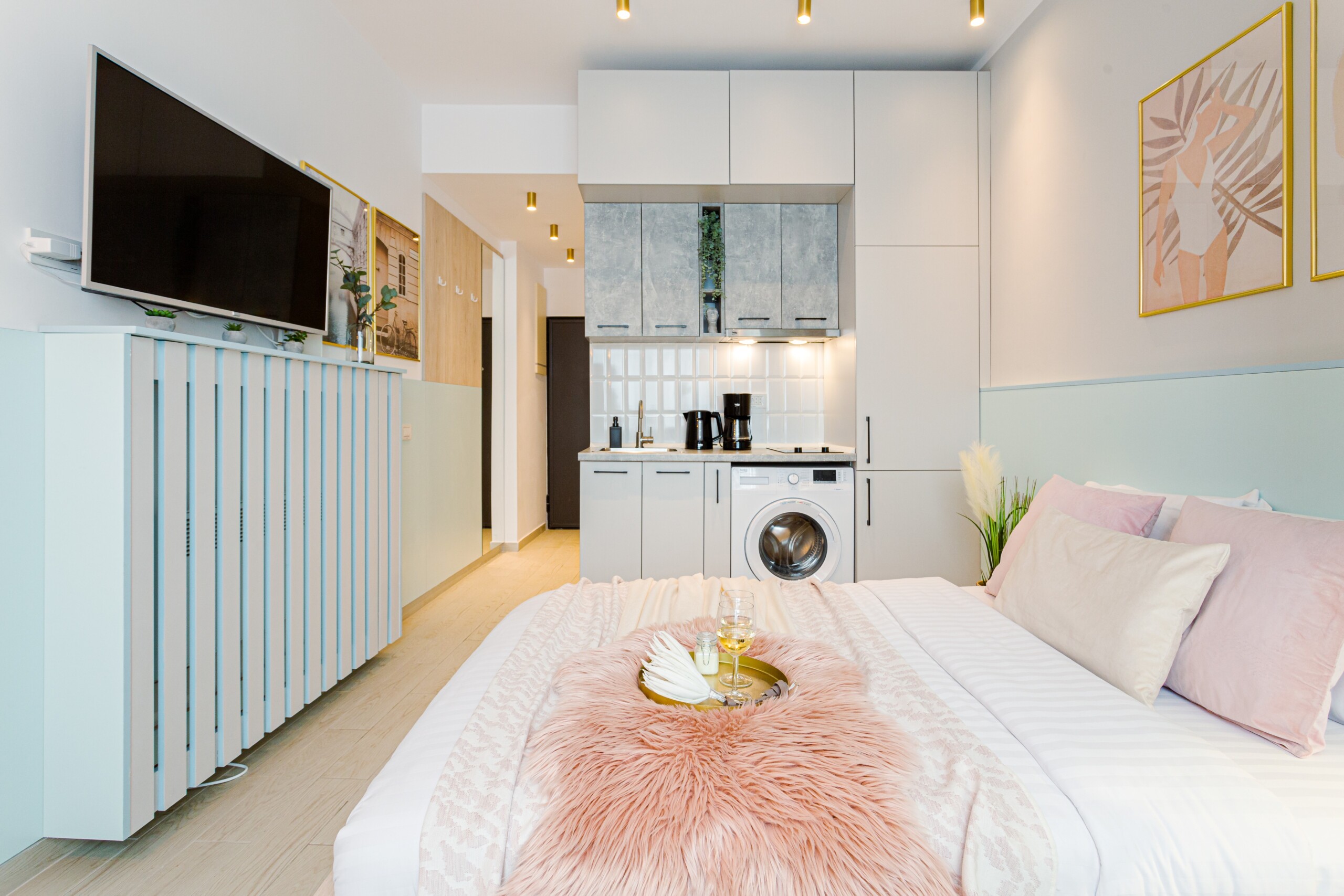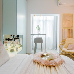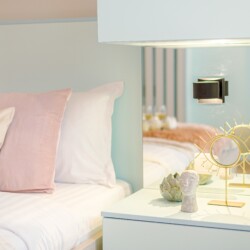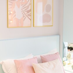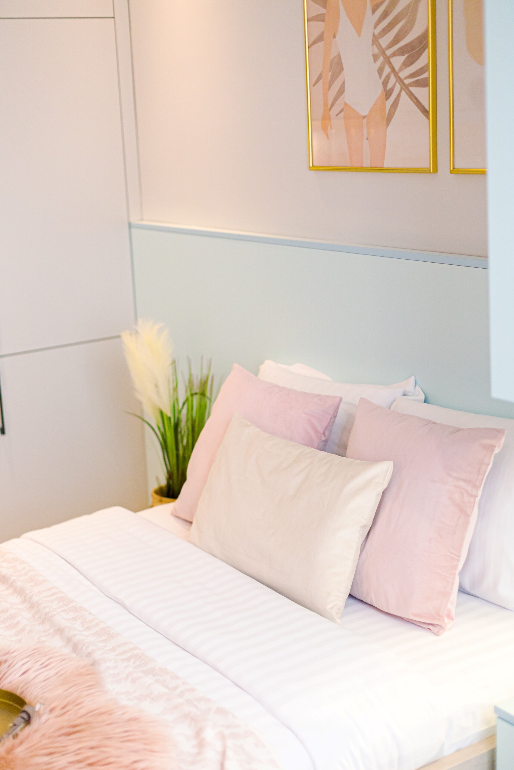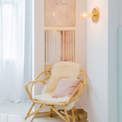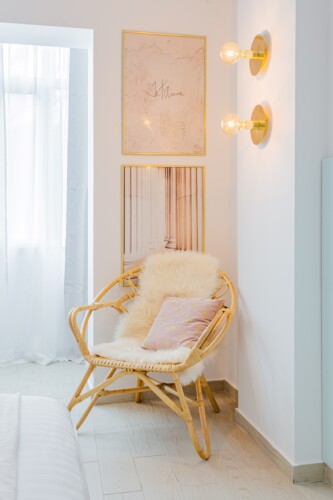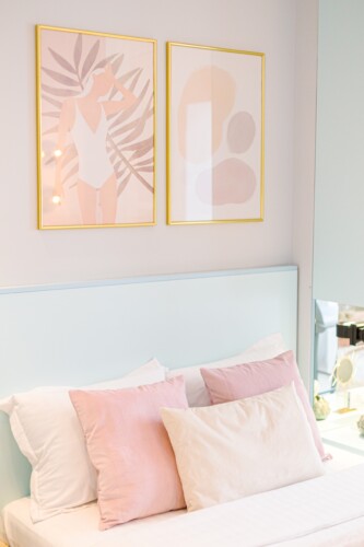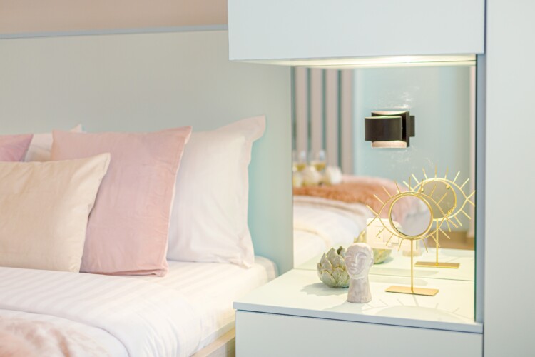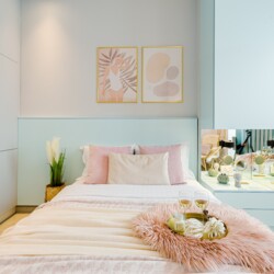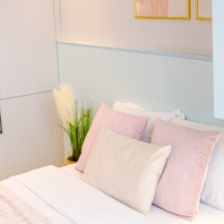 The design uses warm tones, making a very calming and elegant effect. It is perfectly highlighted by warm pink details which offer a note of elegance to the space.