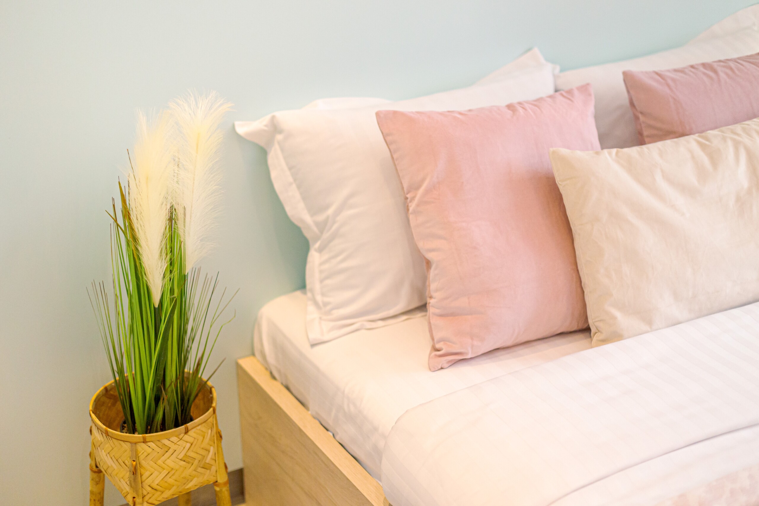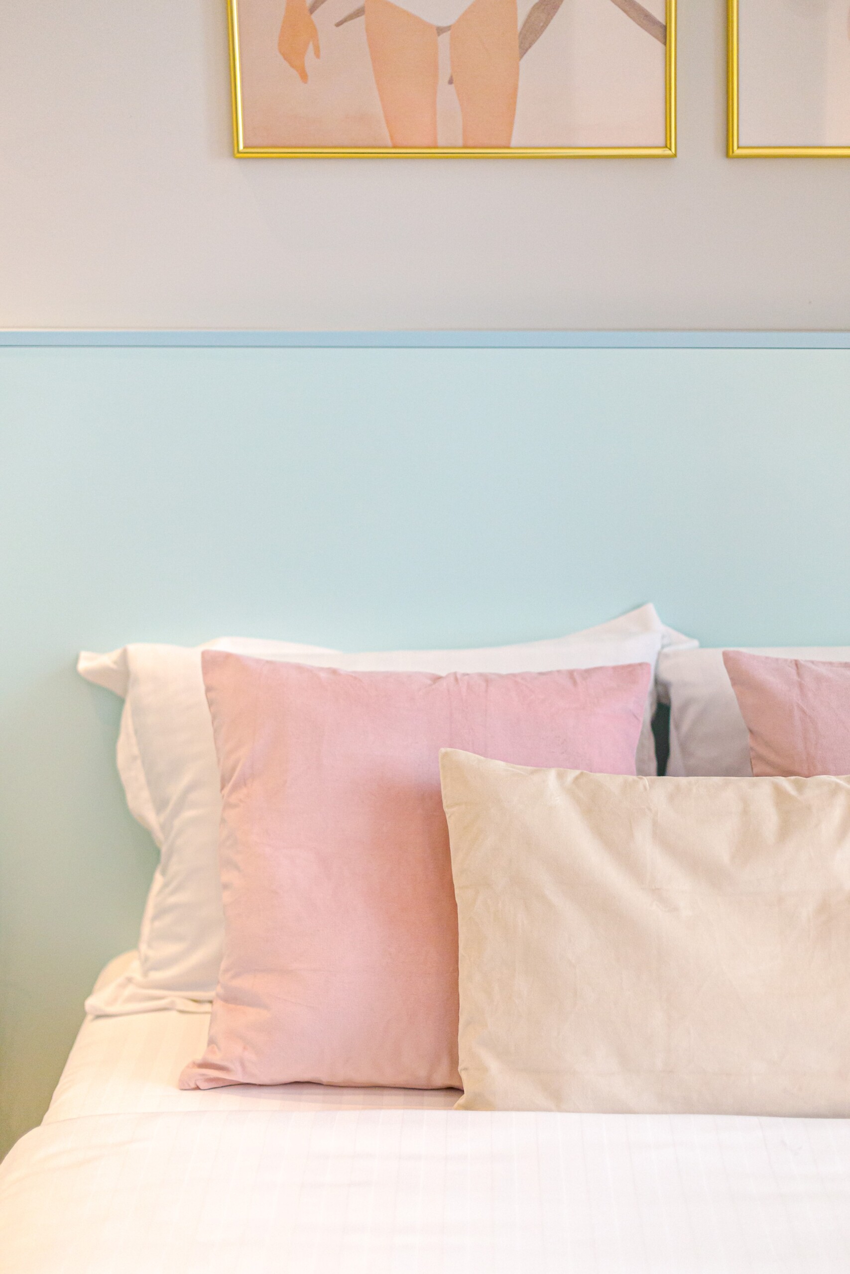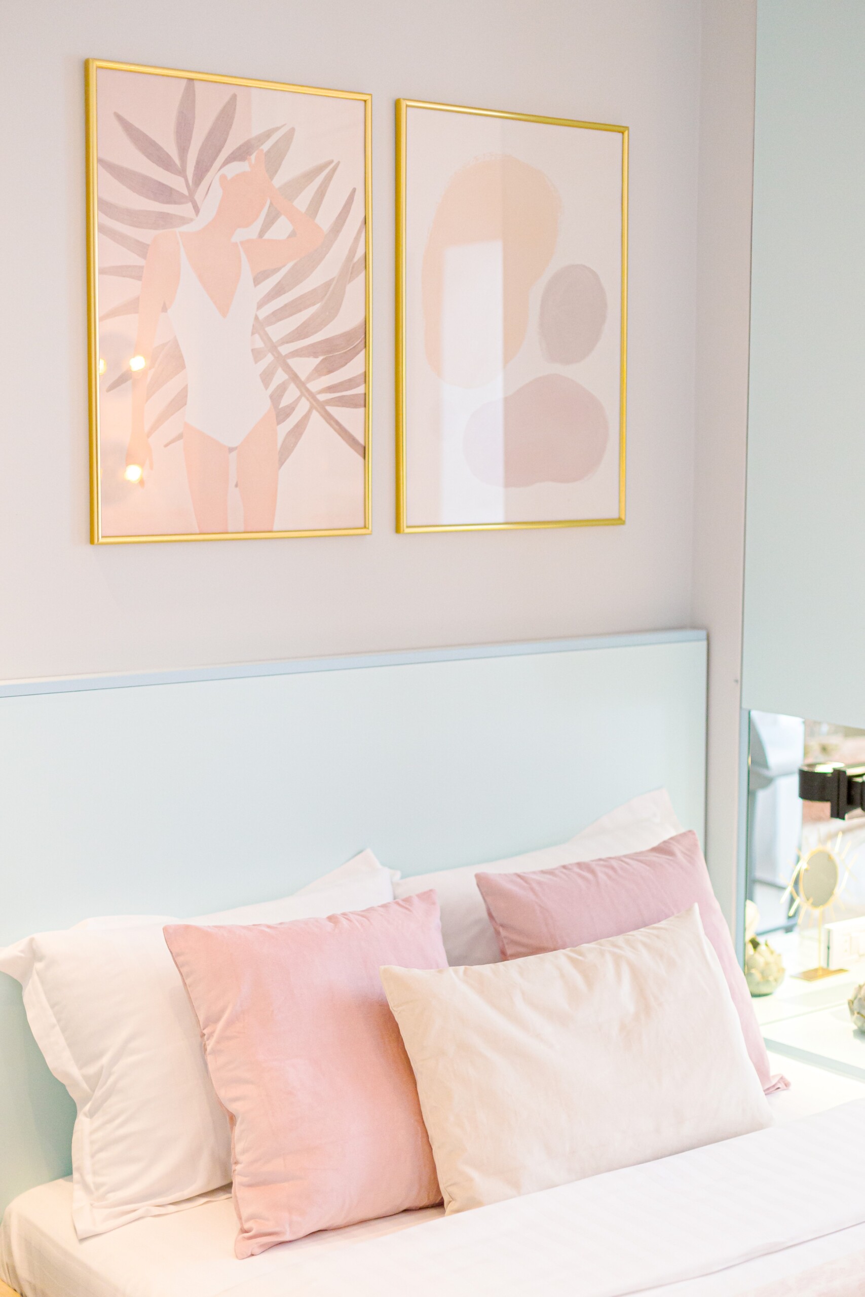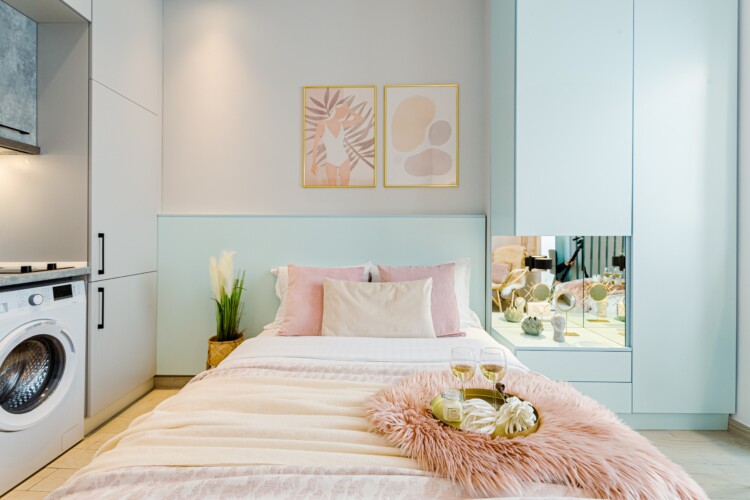 The design uses warm tones, making a very calming and elegant effect. It is perfectly highlighted by warm pink details which offer a note of elegance to the space.