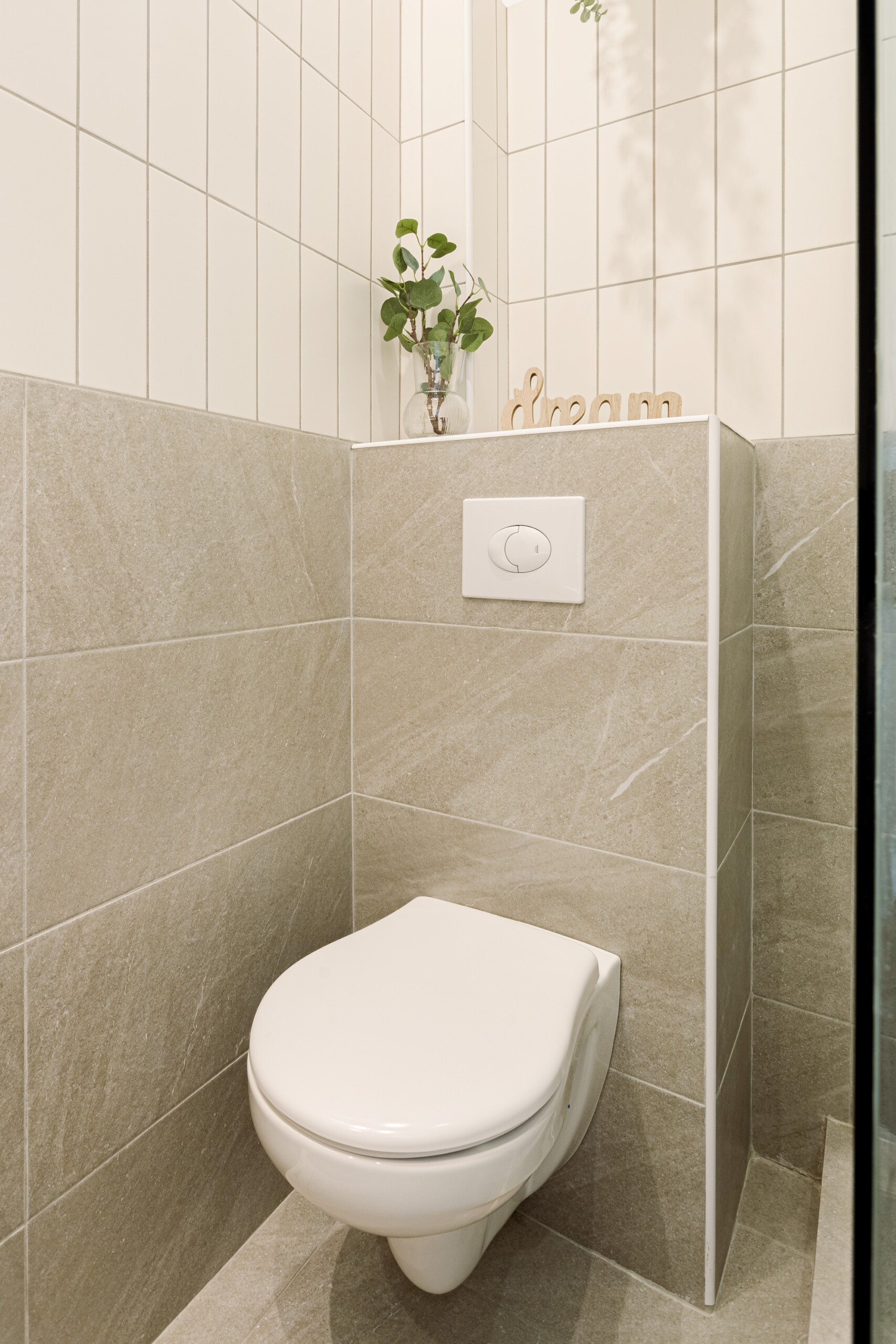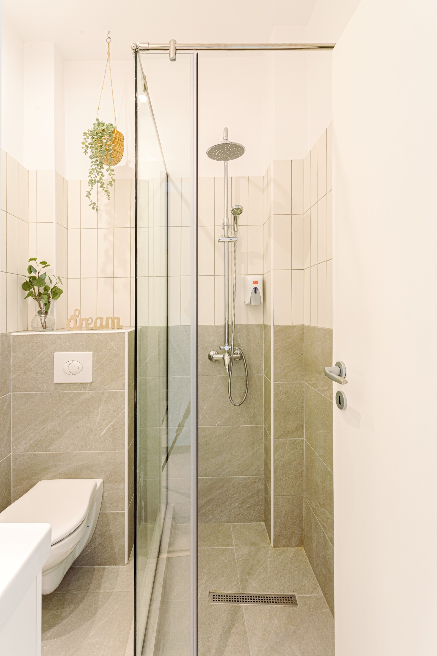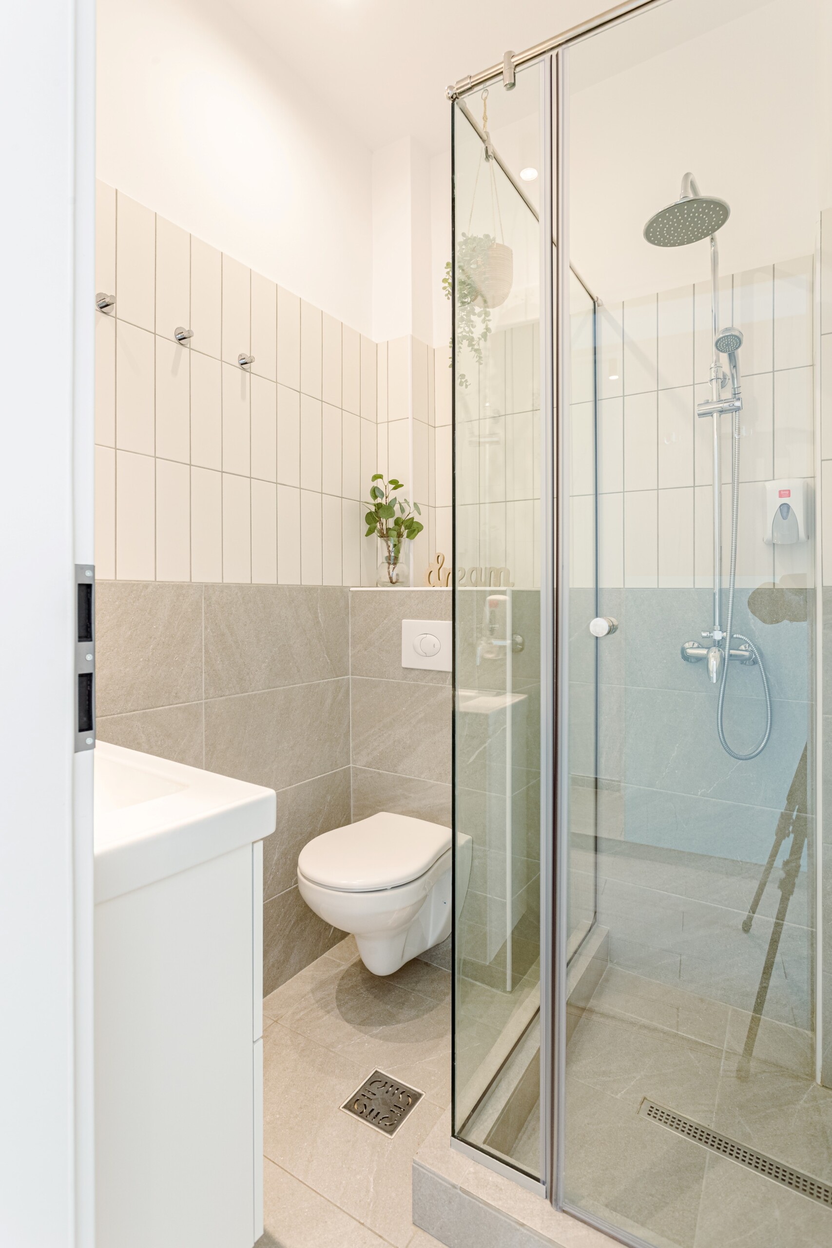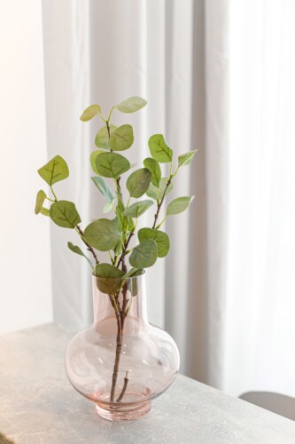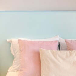 The design uses warm tones, making a very calming and elegant effect. It is perfectly highlighted by warm pink details which offer a note of elegance to the space.