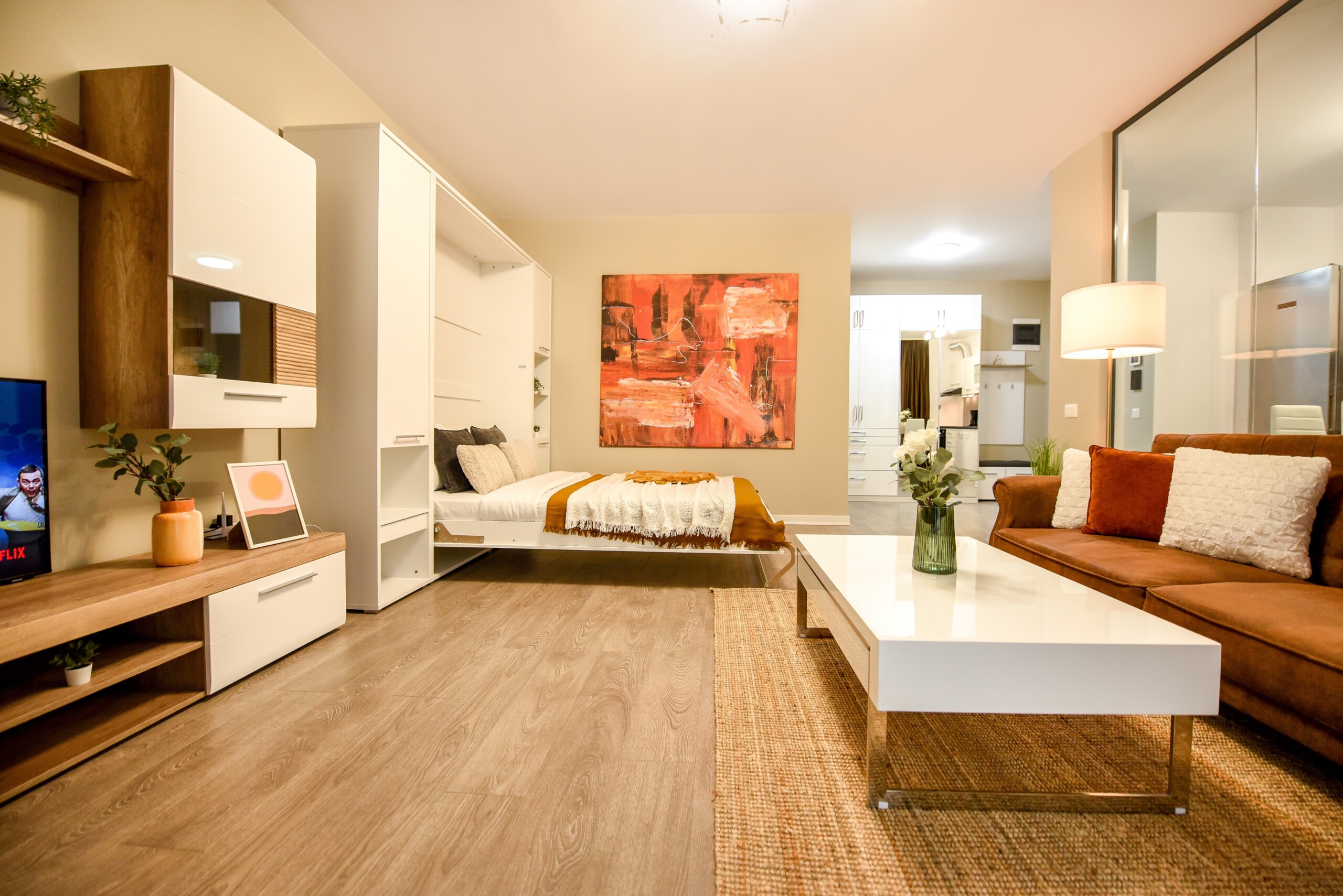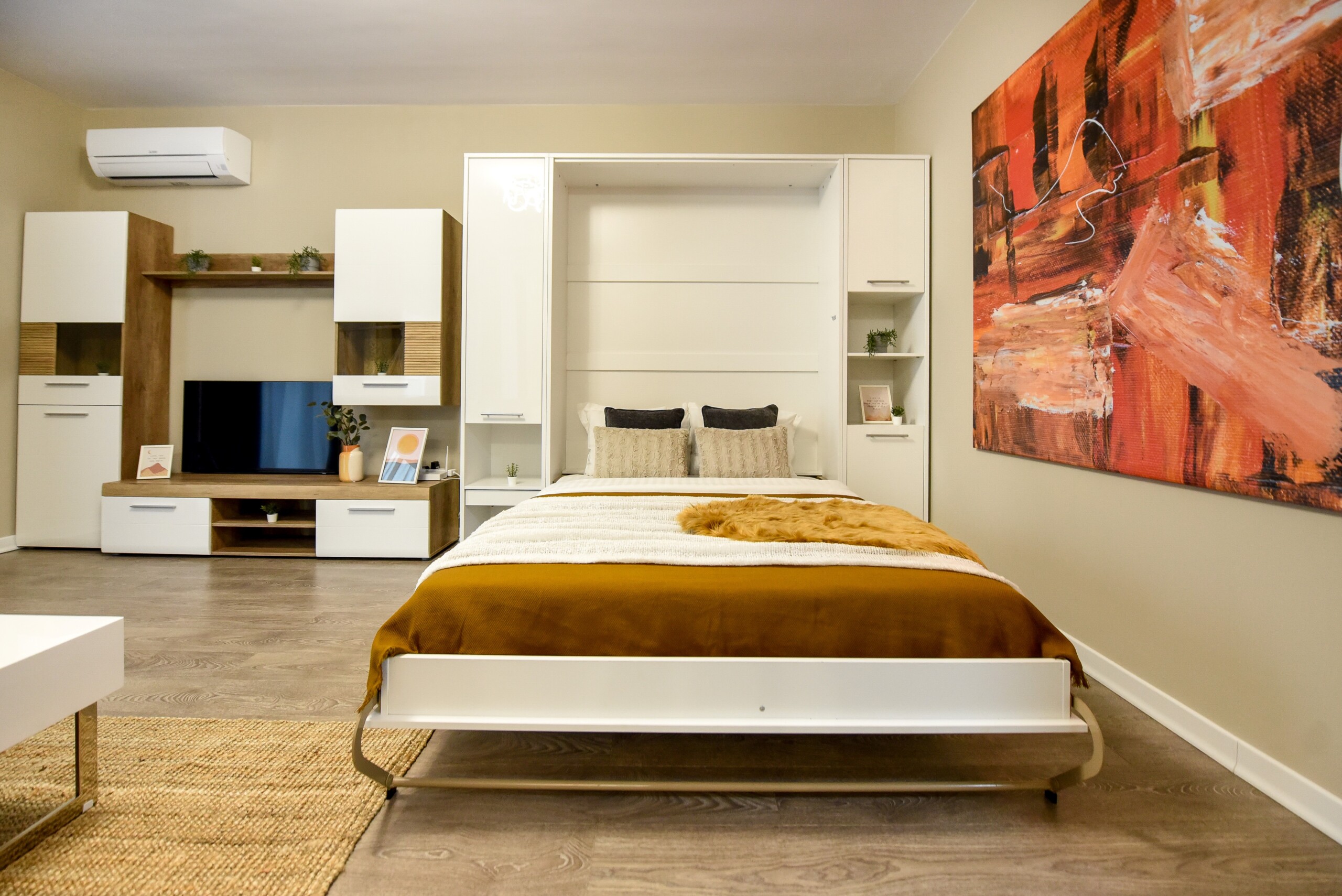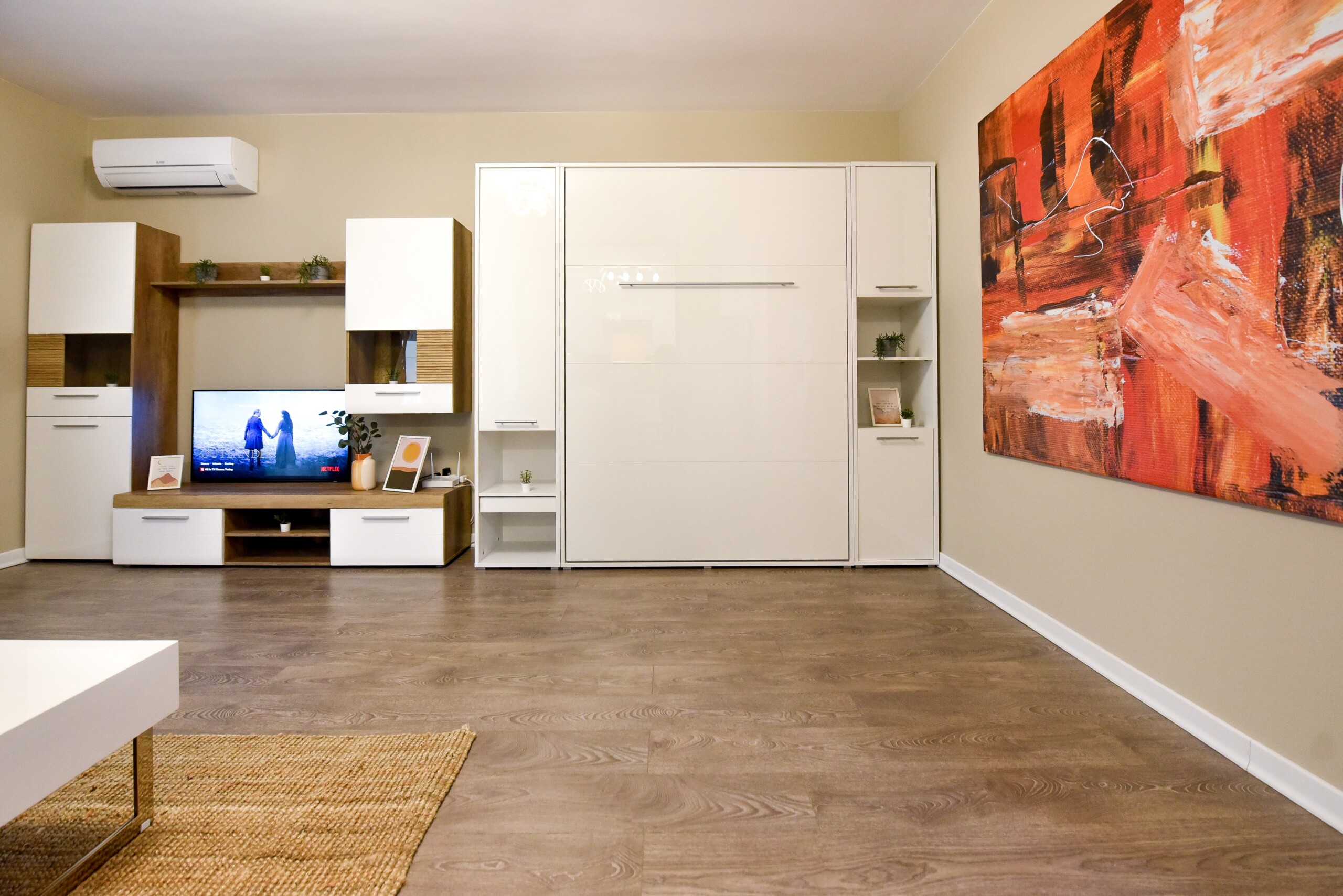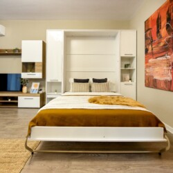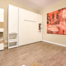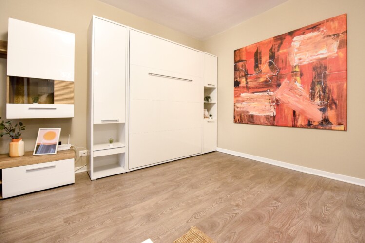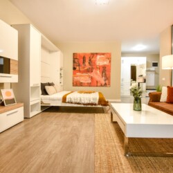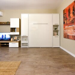 Its modern design ingeniously mixes the functions of the space, using the room as a living space and as a sleeping space, at the same time, but without interfering one with another. Using a retractable bed, the sleeping area disappears during the day, to the detriment of a spacious living.