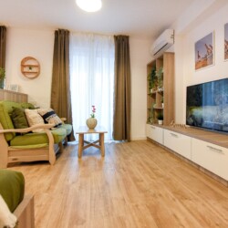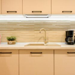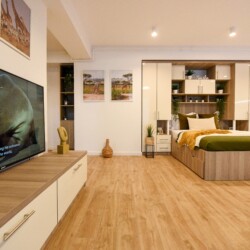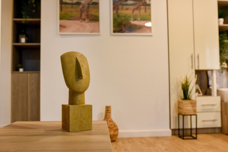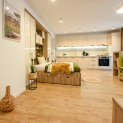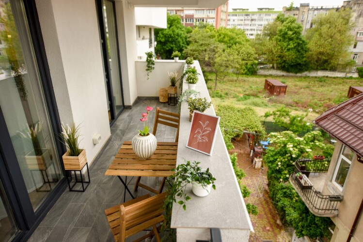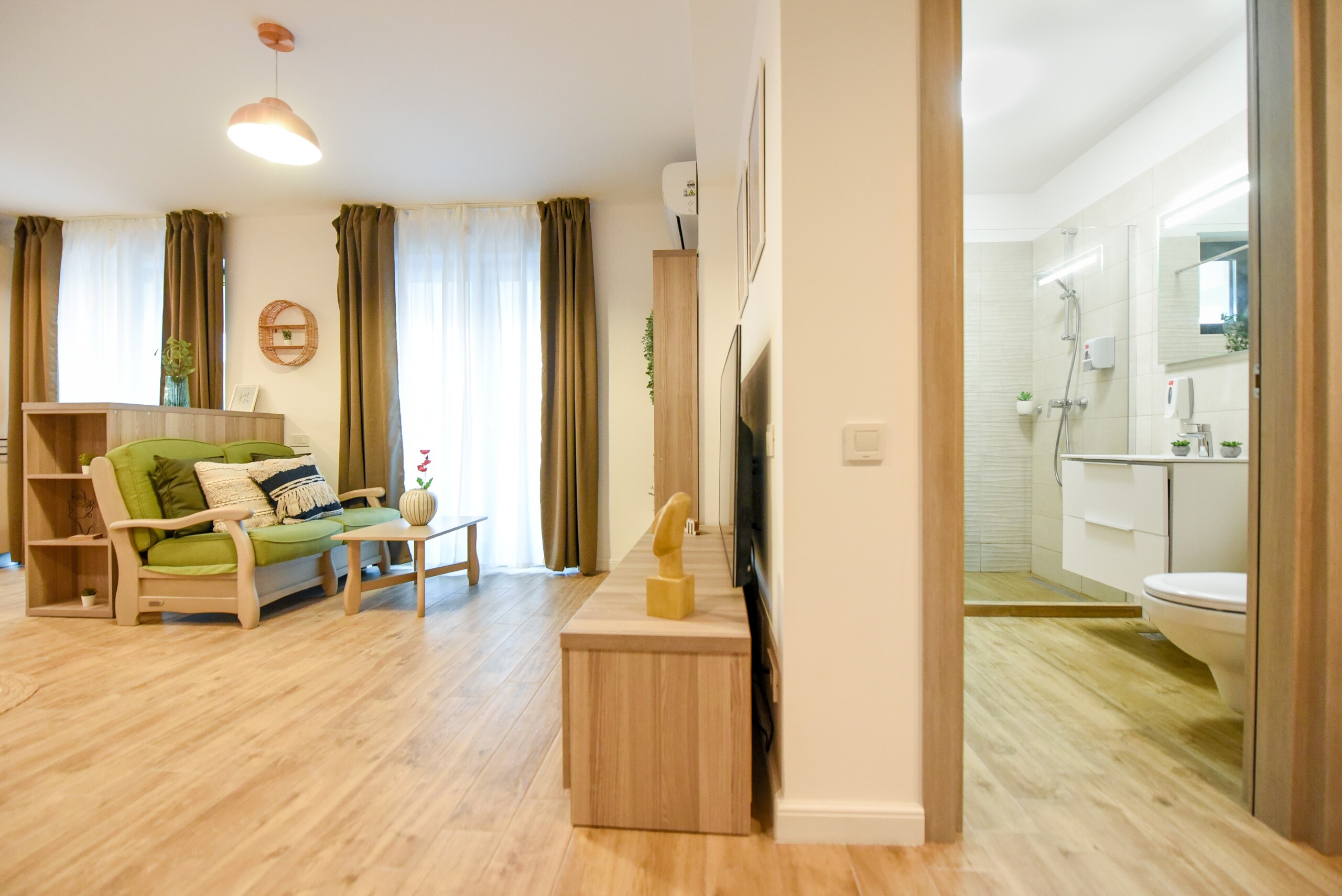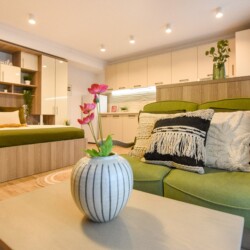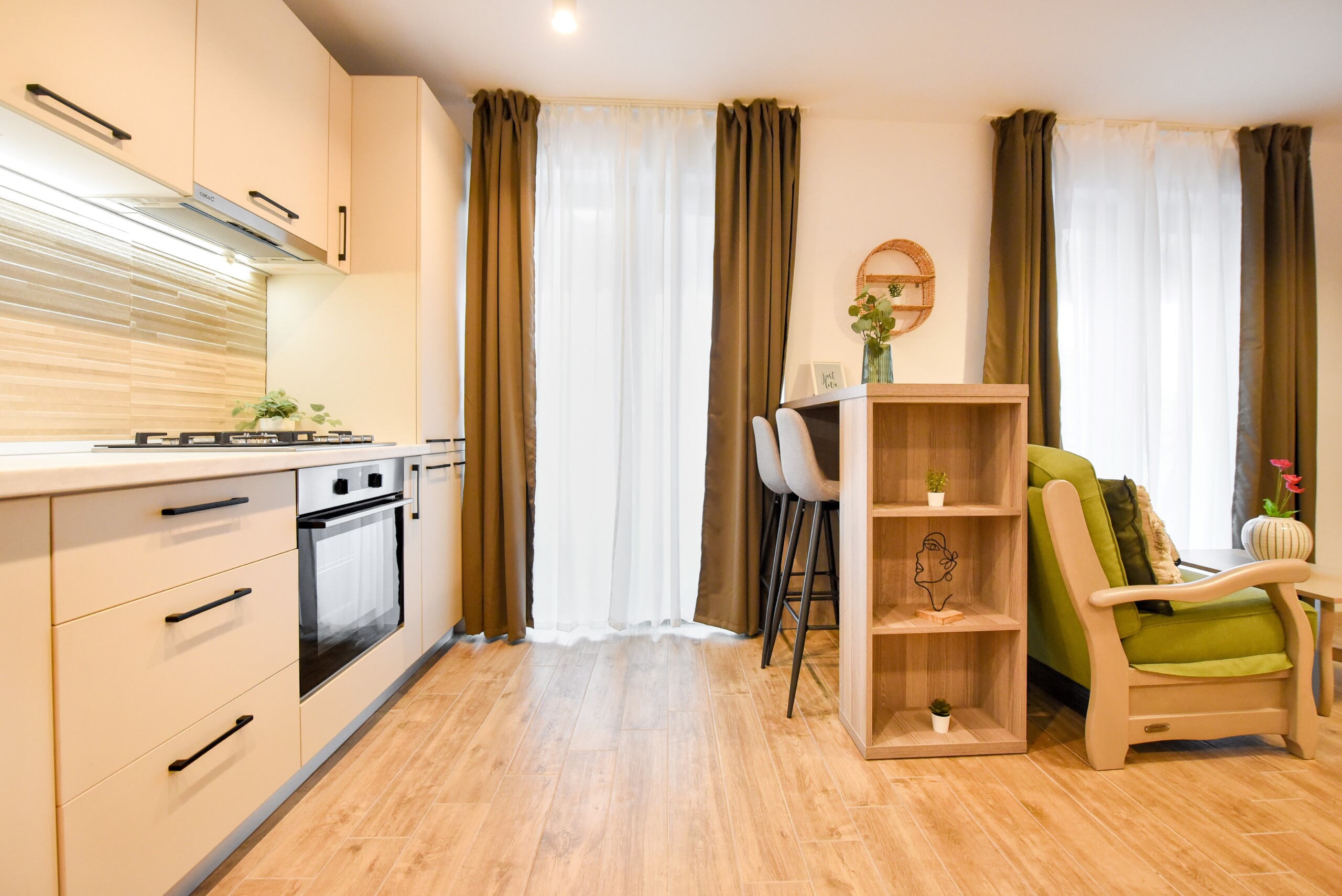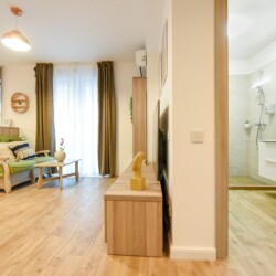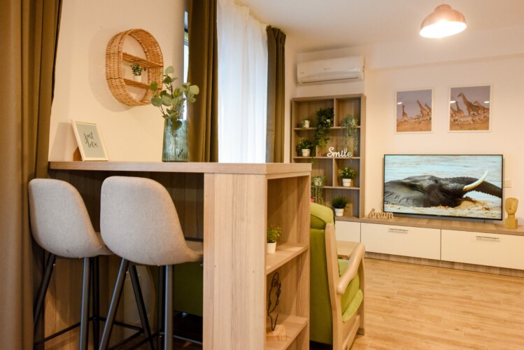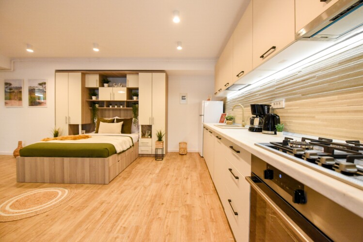The beautiful design, based on earth and bright tones, creates a perfect merge between elements of natural inspiration and modern decoration. The wide windows allow the sunlight to compliment the space and extend it into a beautiful balcony.