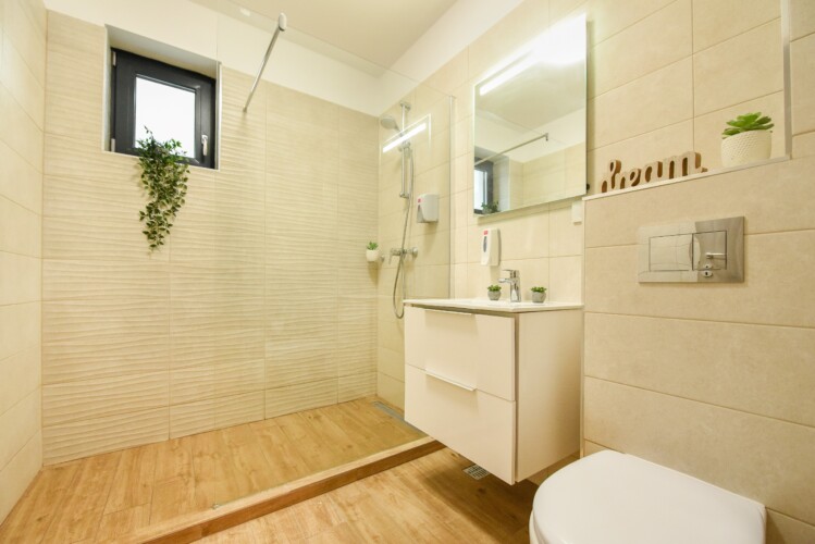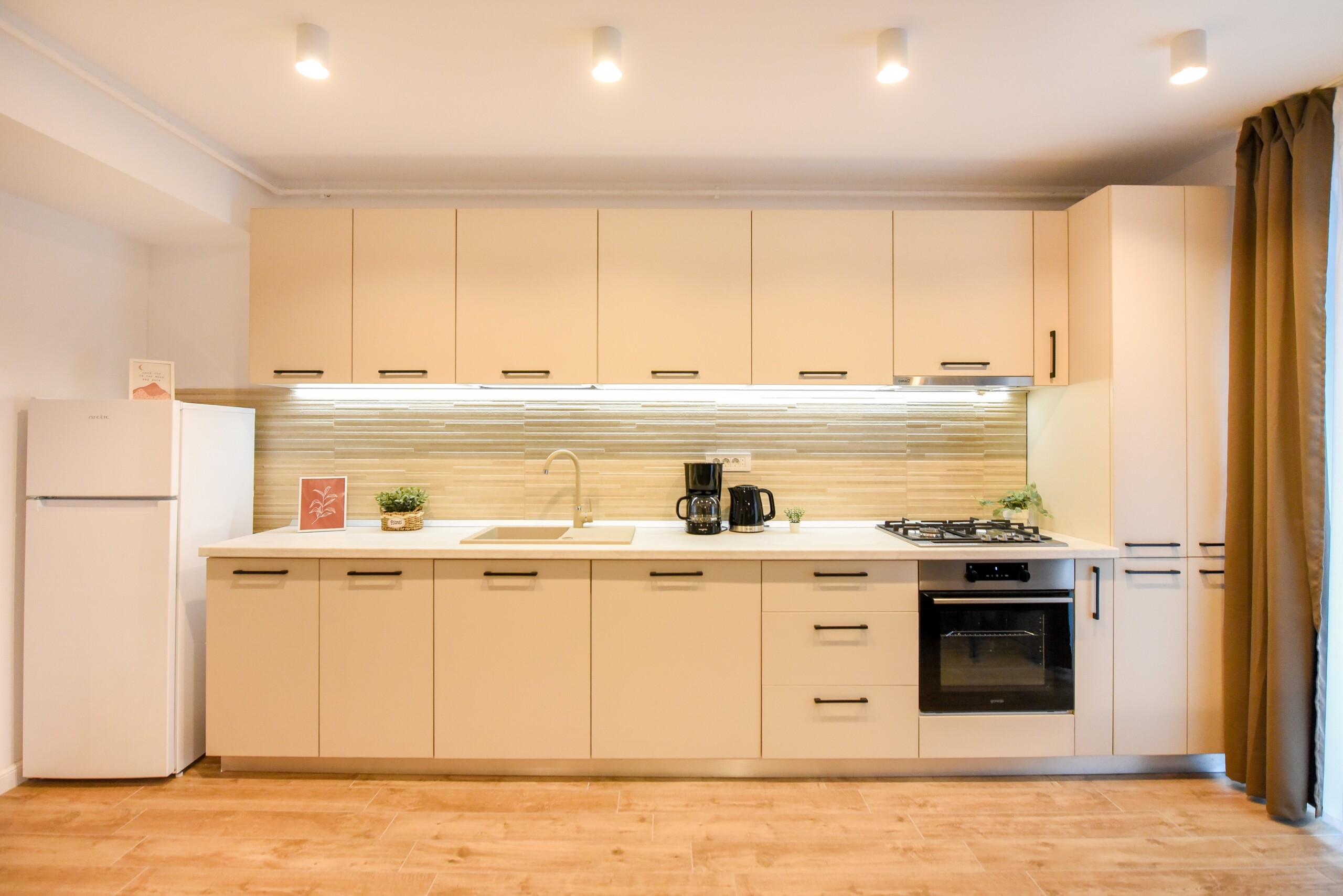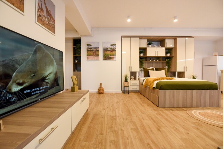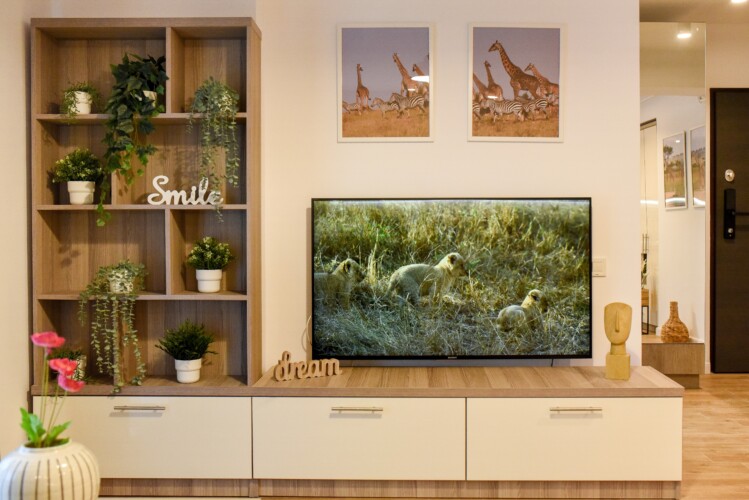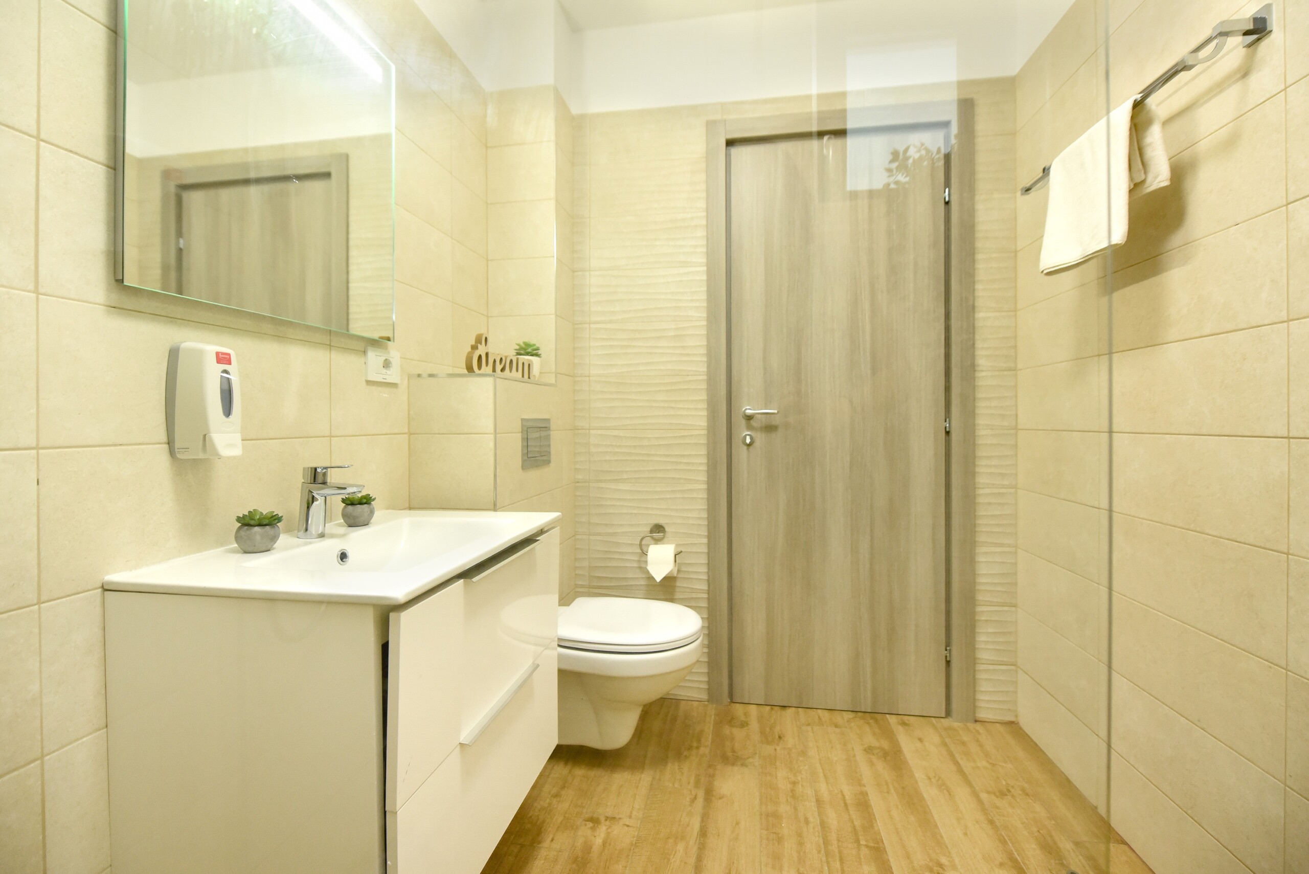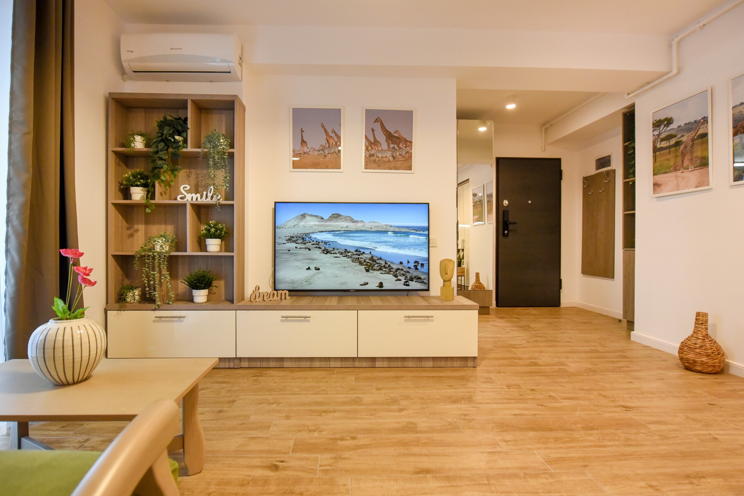 The beautiful design, based on earth and bright tones, creates a perfect merge between elements of natural inspiration and modern decoration. The wide windows allow the sunlight to compliment the space and extend it into a beautiful balcony.