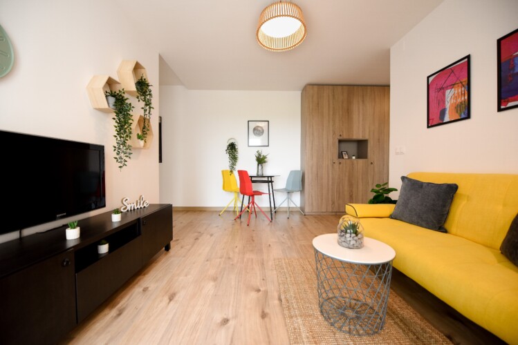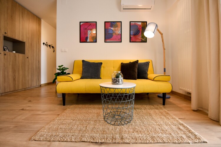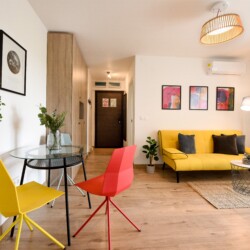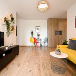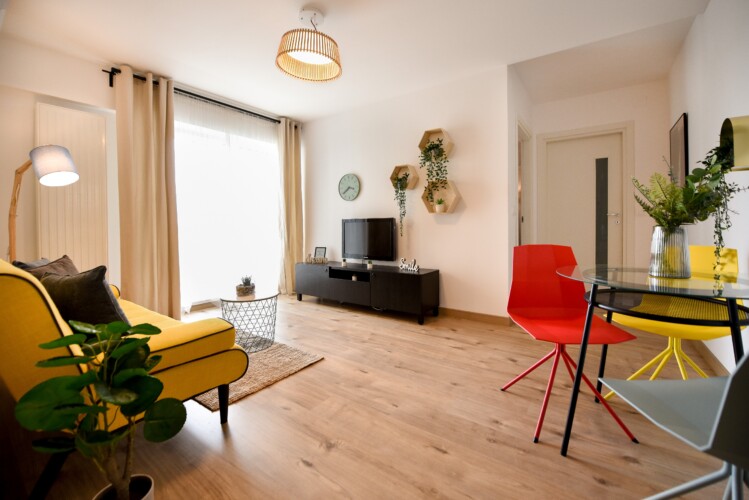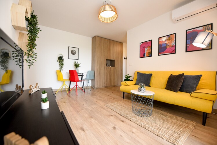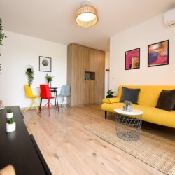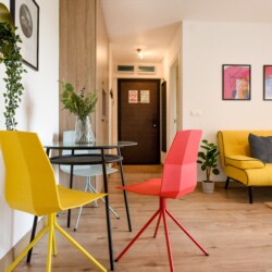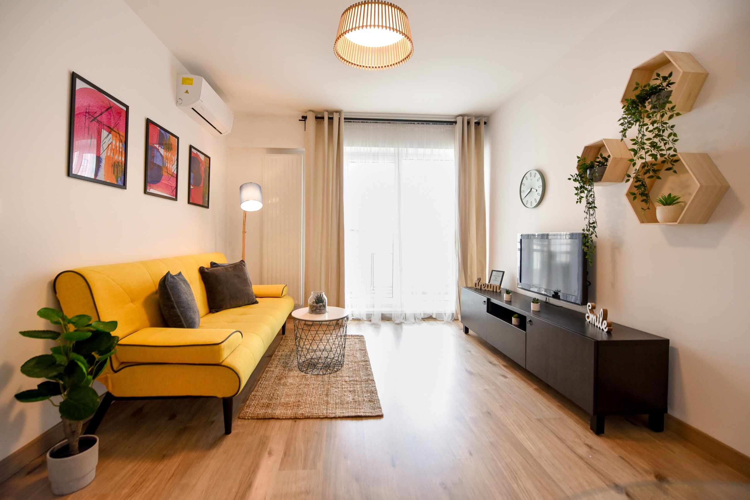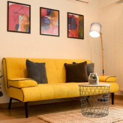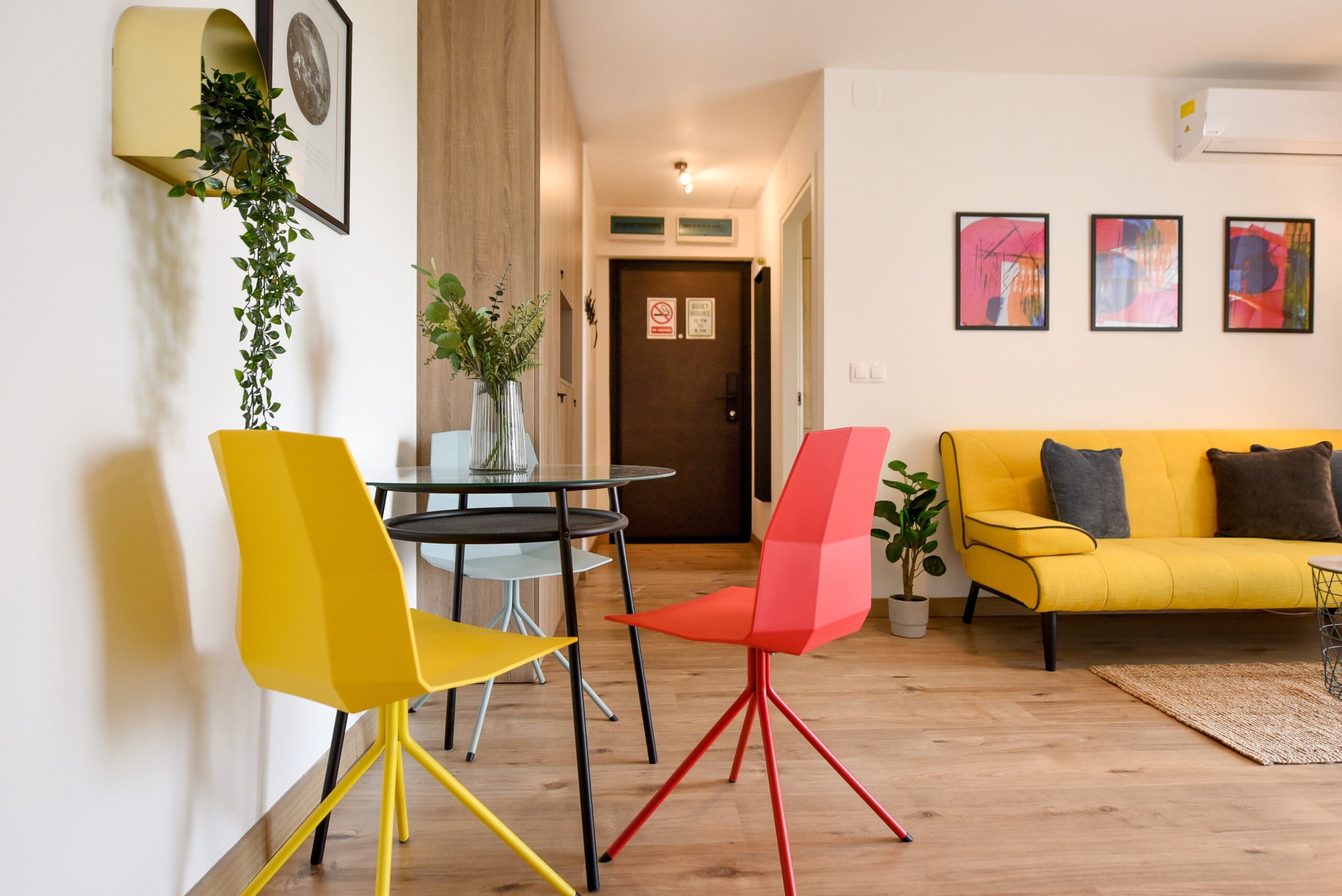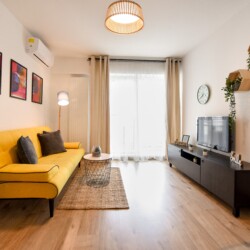 With a modern design, based on simple lines and neutral colors, this home complies all the needed requests for a comfortable stay. The color spots ingeniously created by the decoration elements and by the sofa break the simplicity and offer personality to this space. With a minimalist style and colorful touches, you will enjoy the best of both worlds.