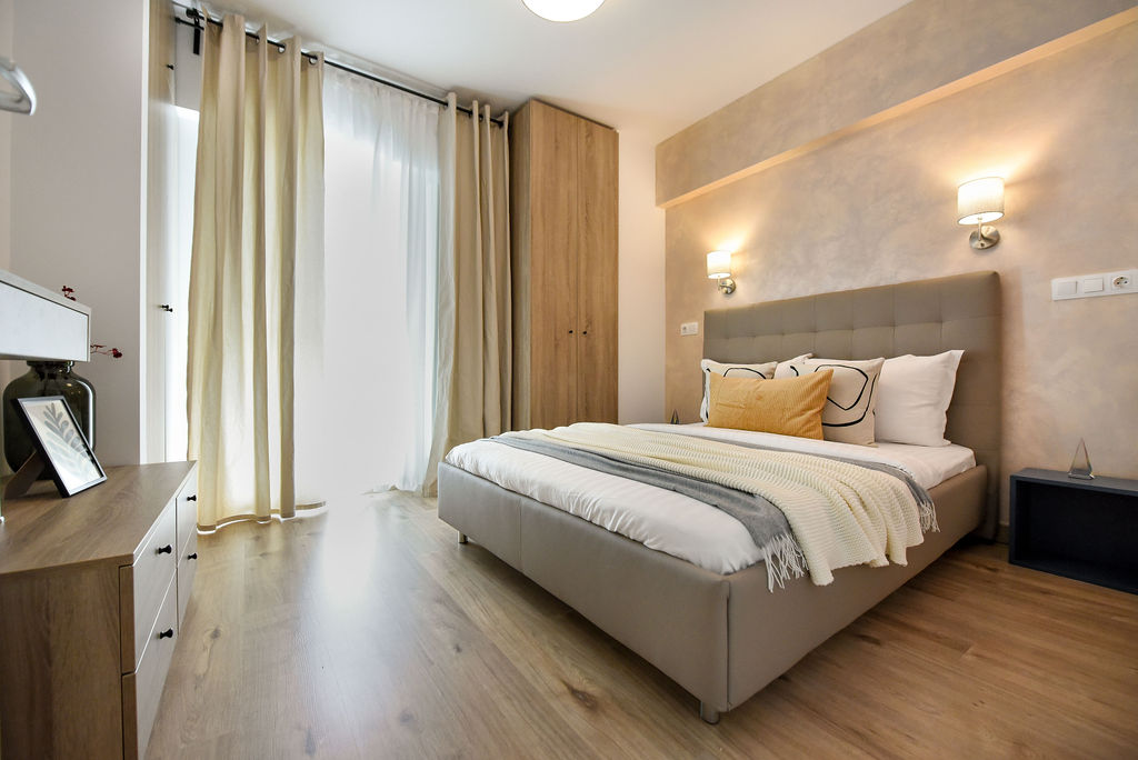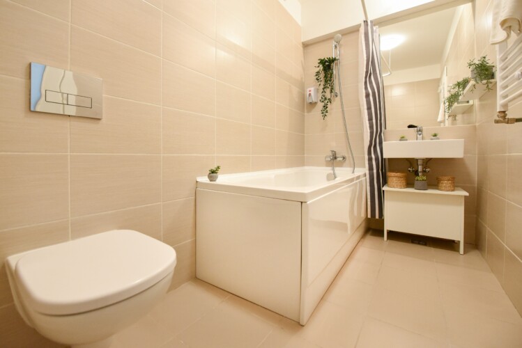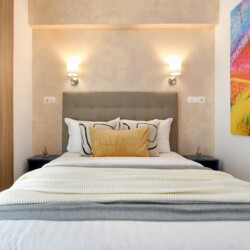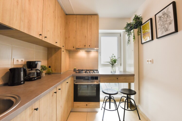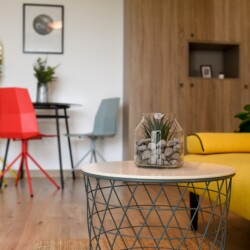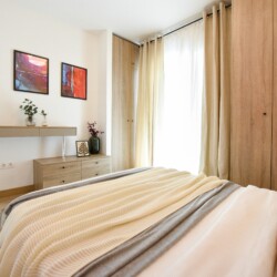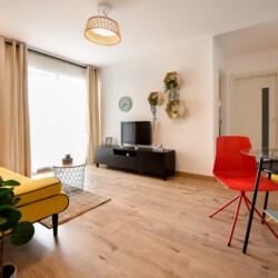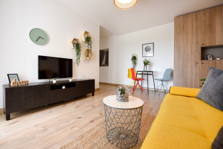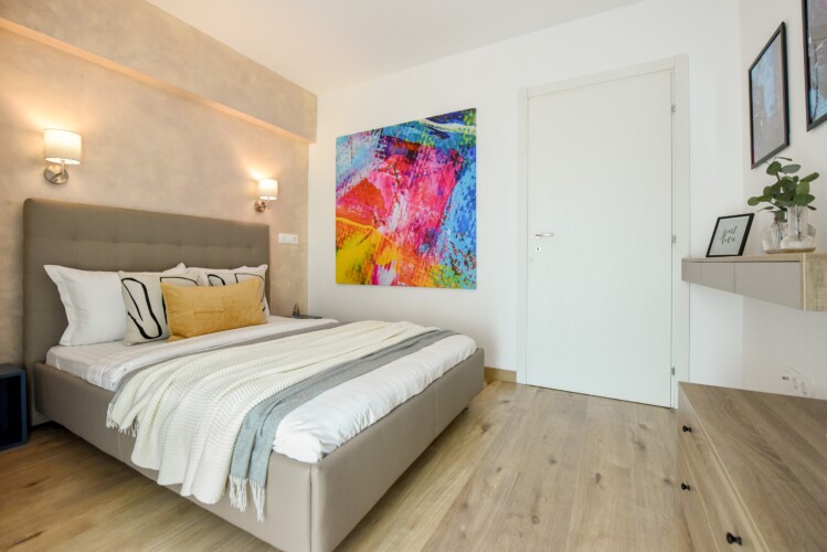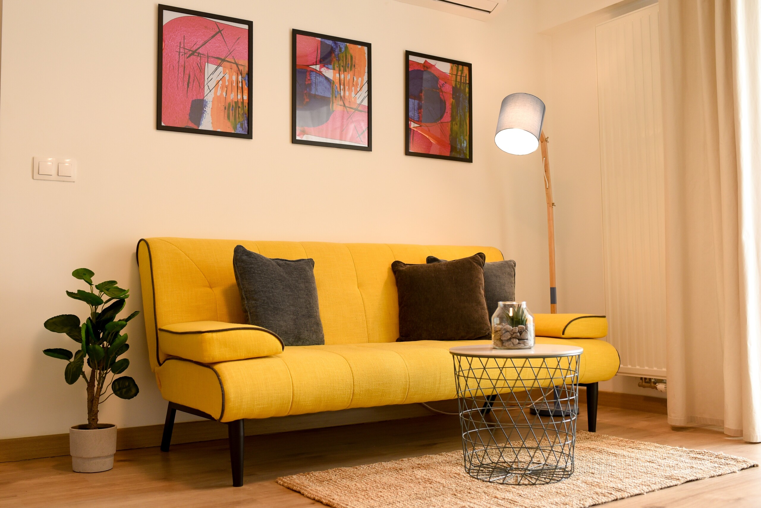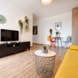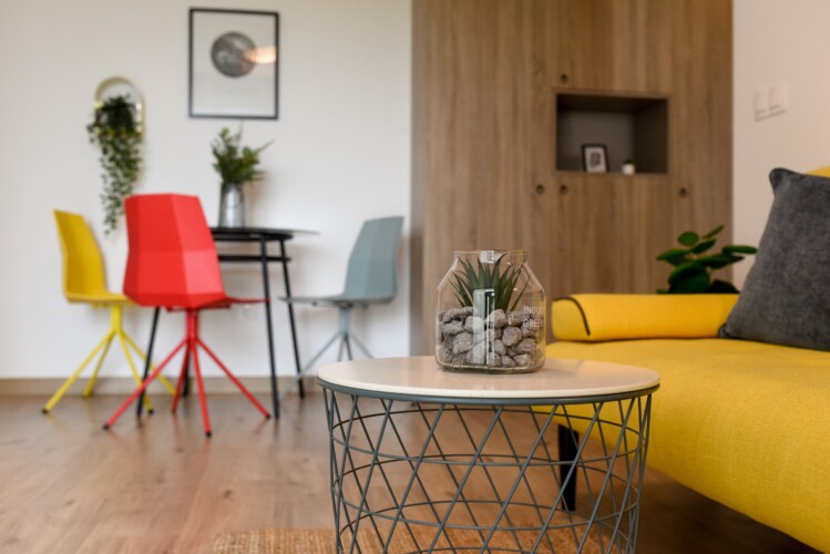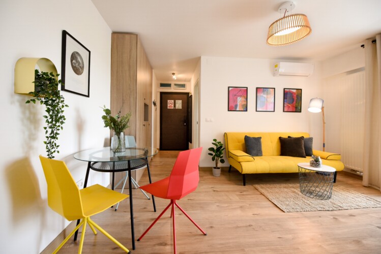 With a modern design, based on simple lines and neutral colors, this home complies all the needed requests for a comfortable stay. The color spots ingeniously created by the decoration elements and by the sofa break the simplicity and offer personality to this space. With a minimalist style and colorful touches, you will enjoy the best of both worlds.
