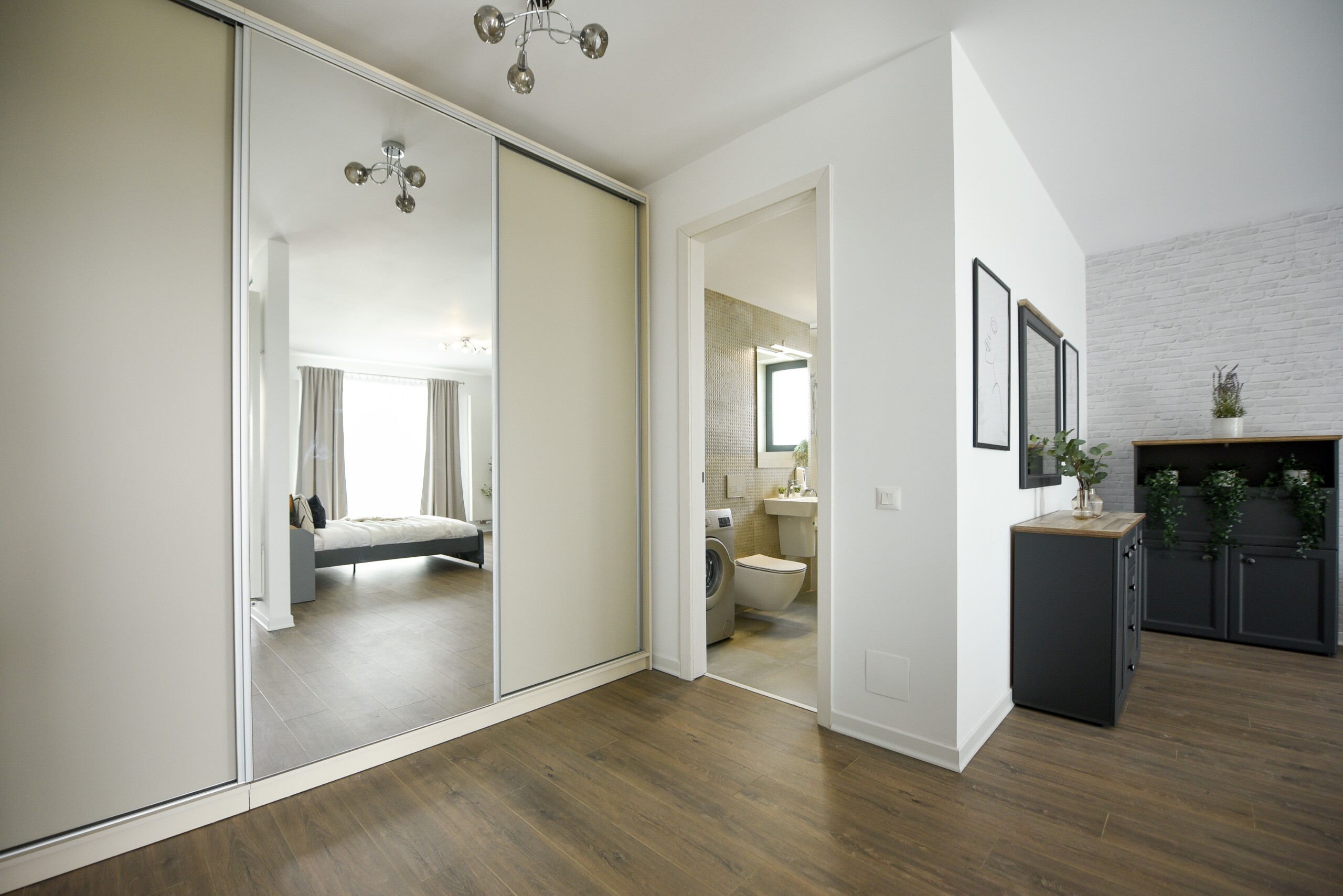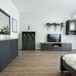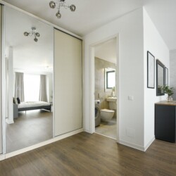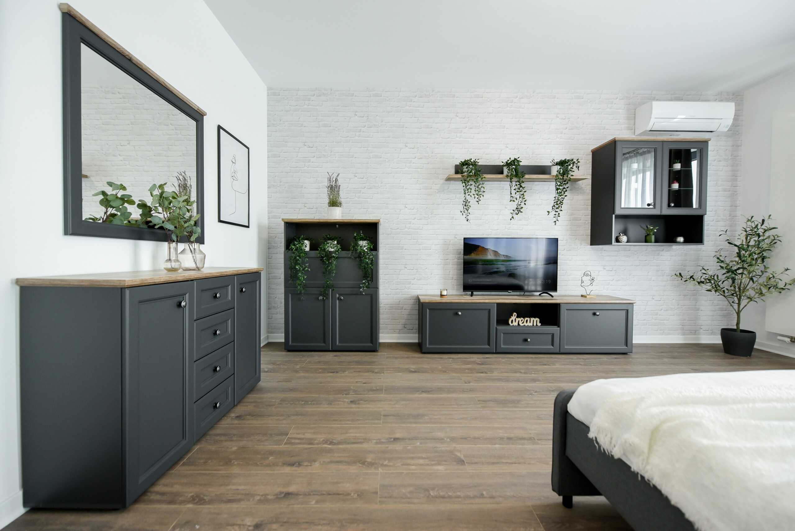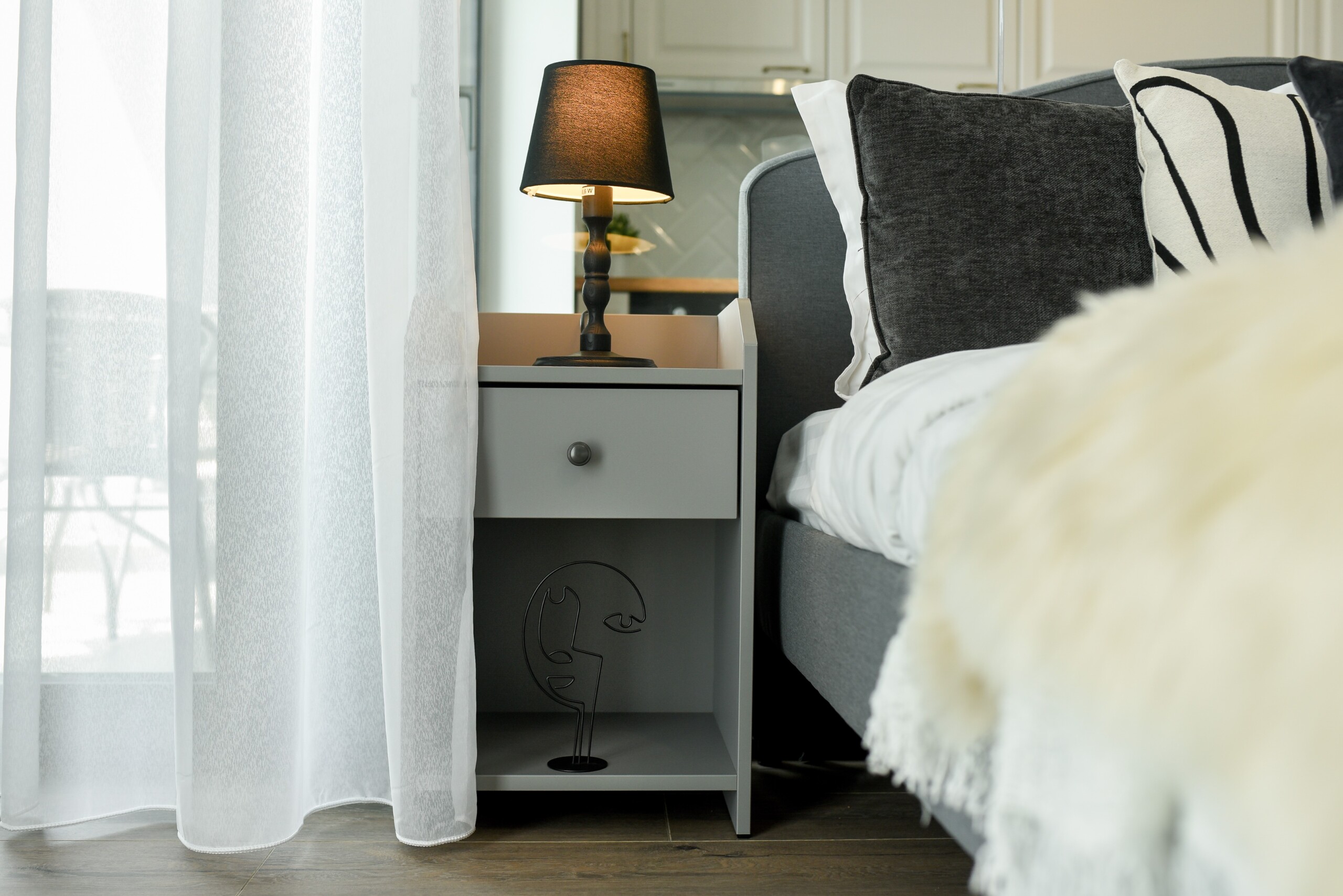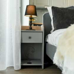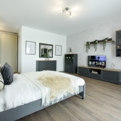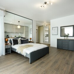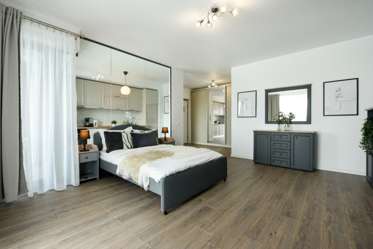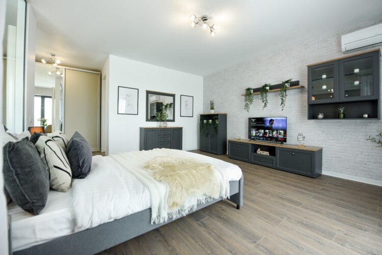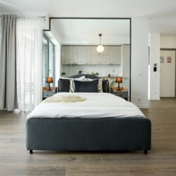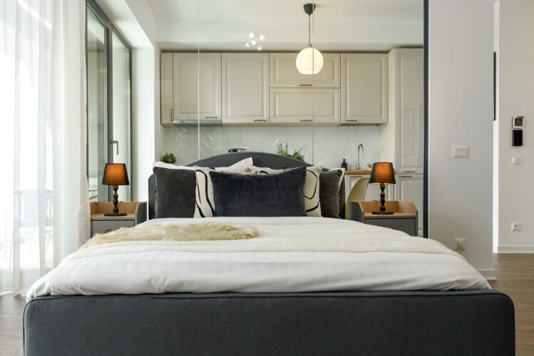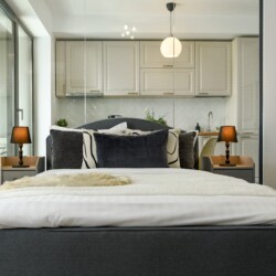 The sleeping area is characterized by its elegant and warm atmosphere achieved through the use of pastel and cream tones, suitably accompanied by elegant grey furniture.