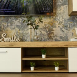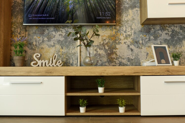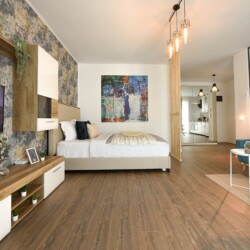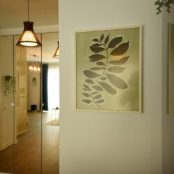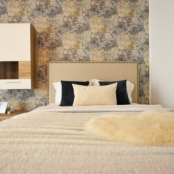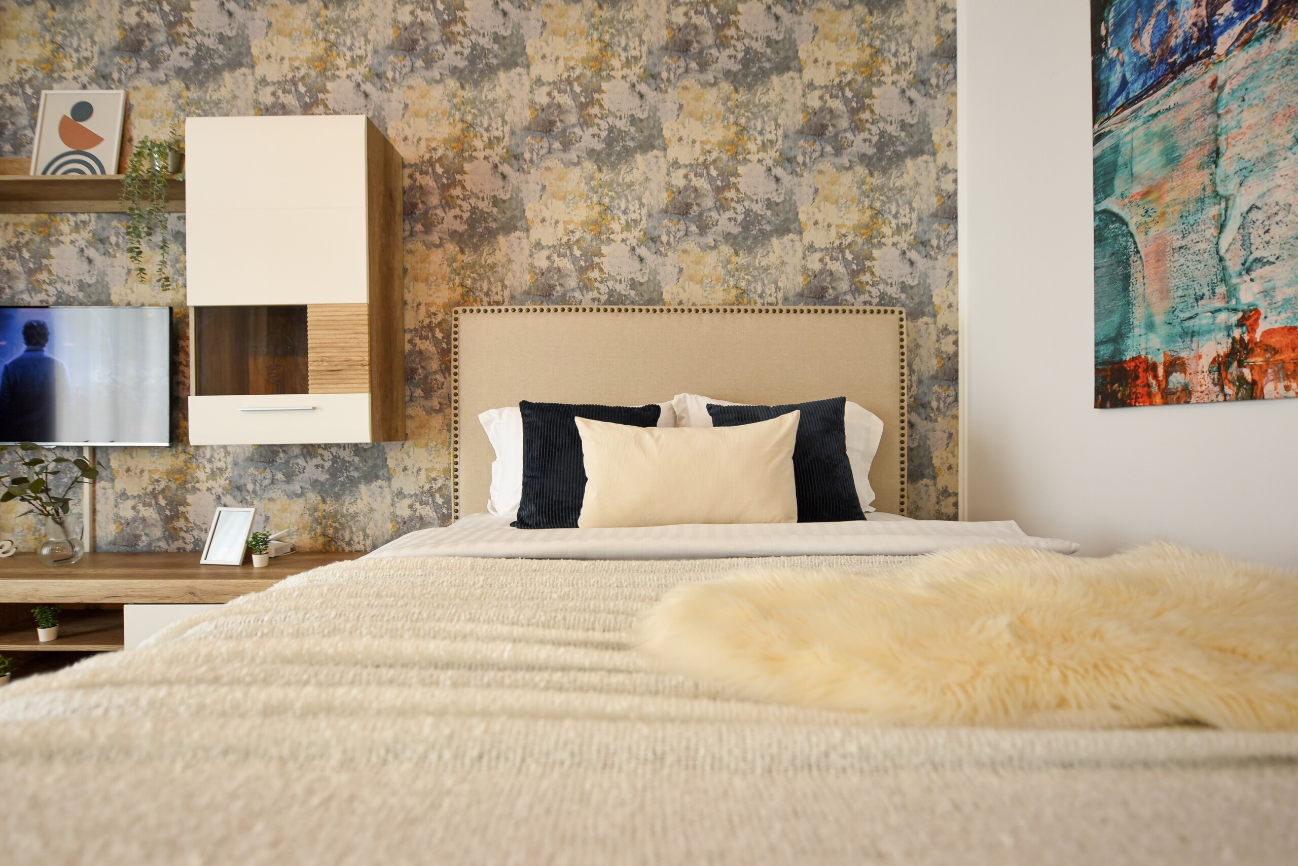 The wallpaper looks like a huge abstract picture, and mixed perfectly with the decoration elements and the earth tones of the furniture, offers the elegance of an art museum.