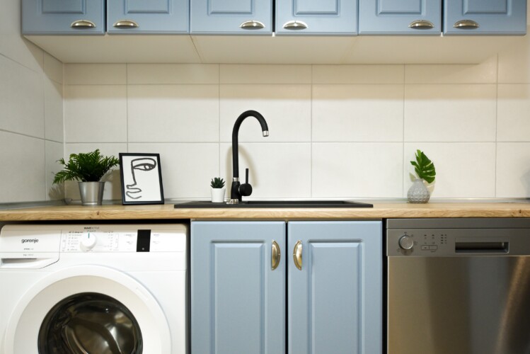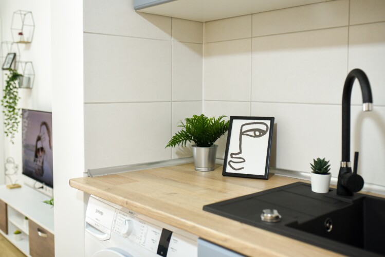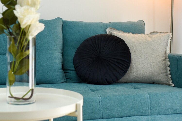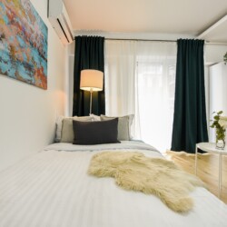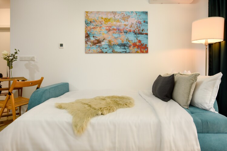 This apartment invites you to curl up in the cozy bed and relax. The clever use of bright tones, along with white furnishings and velvety textures of upholstery and curtains, creates a warm and welcoming atmosphere.