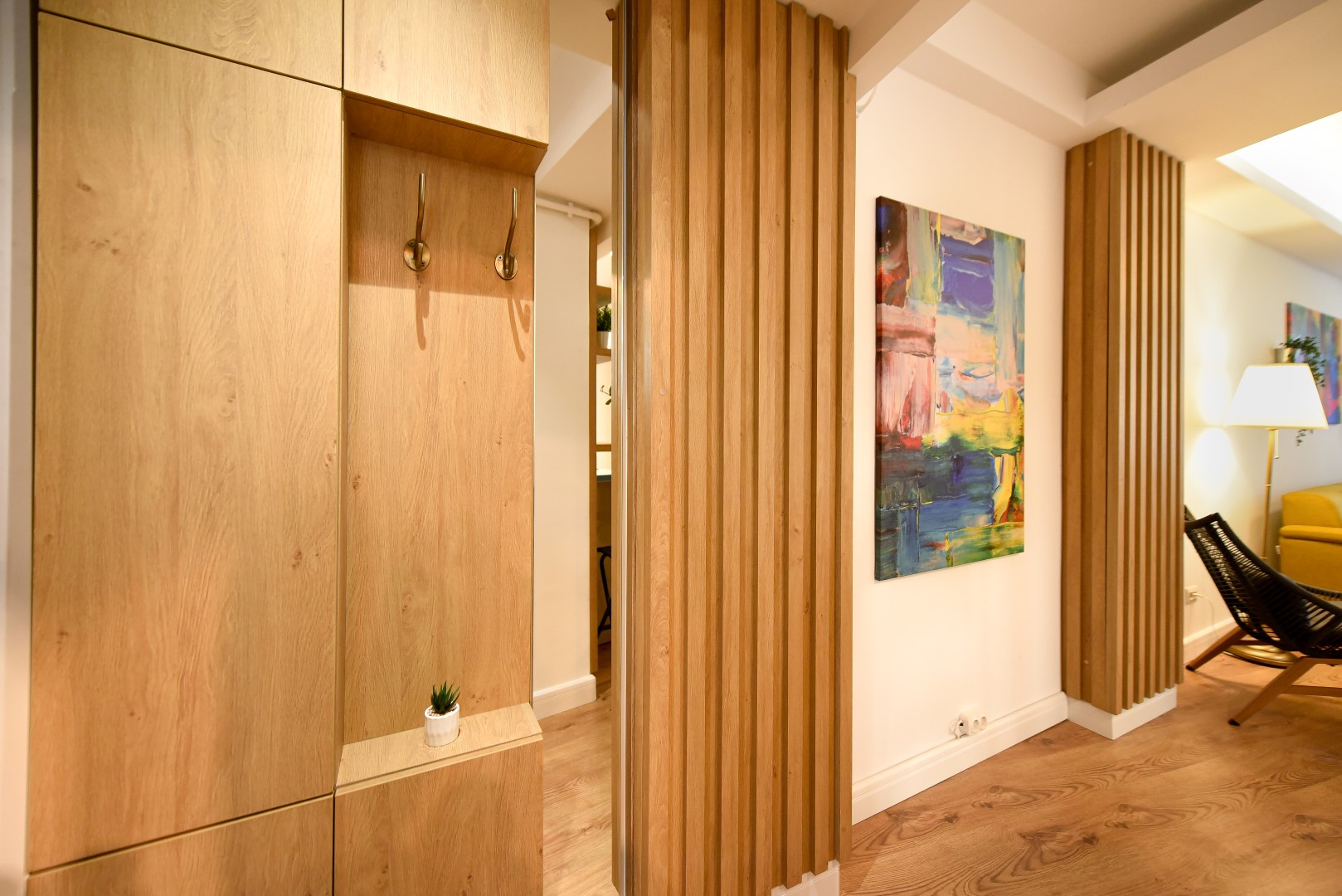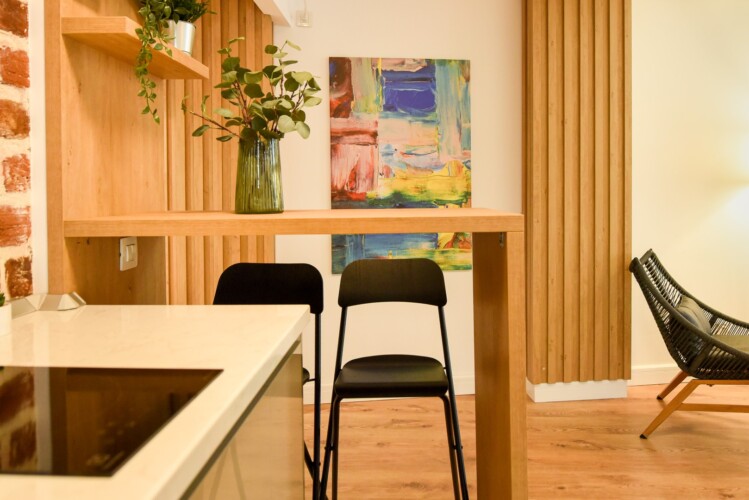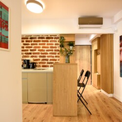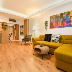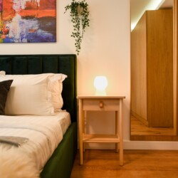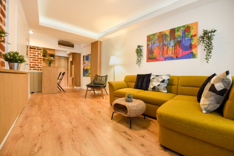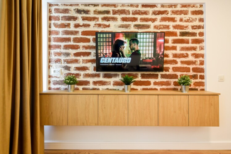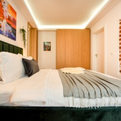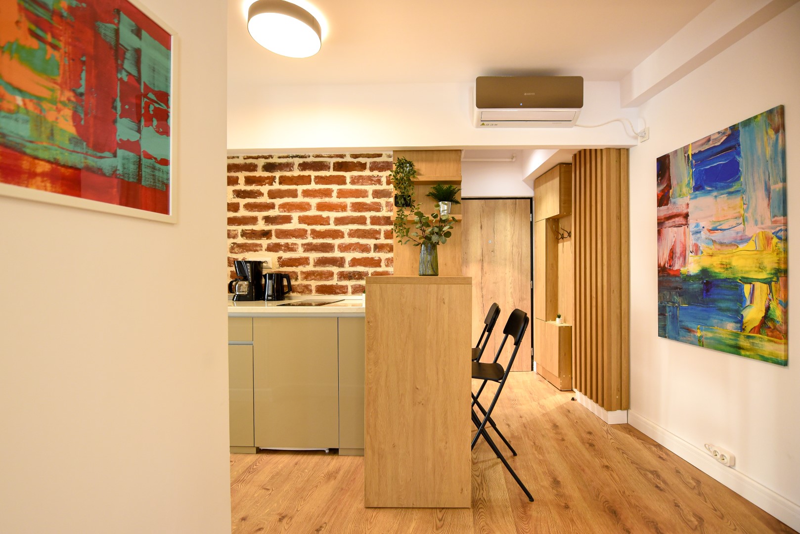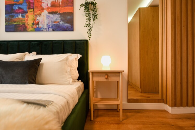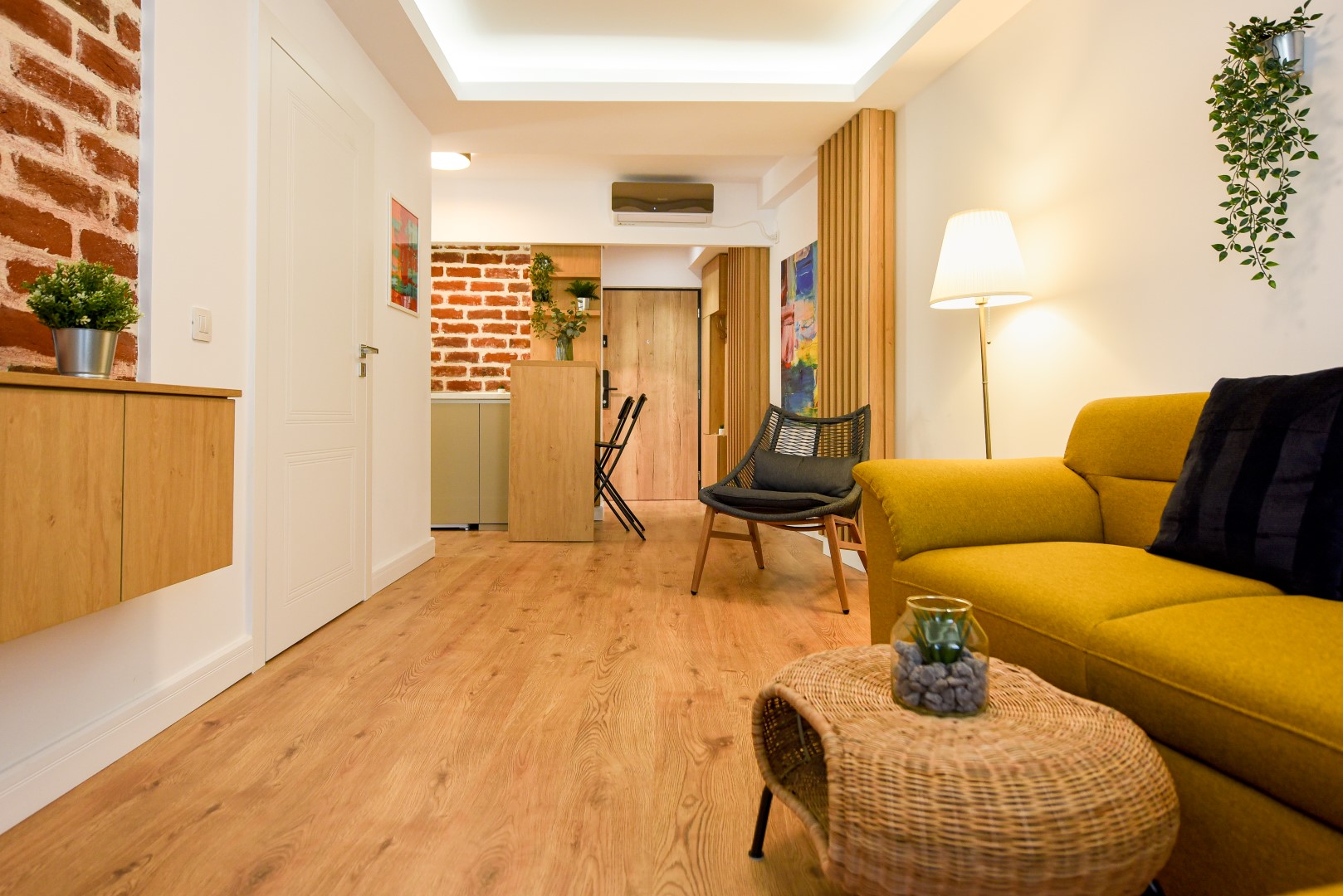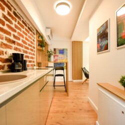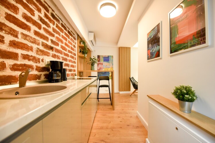Even if the design is minimalist, following a contemporary style, the warm tones create a cozy feeling. The home is fully equipped and comfortable. The living room is an open space shared with a modern kitchen, ready for guests to use. The bedroom has a wardrobe and a double sized bed for a perfect sleep.