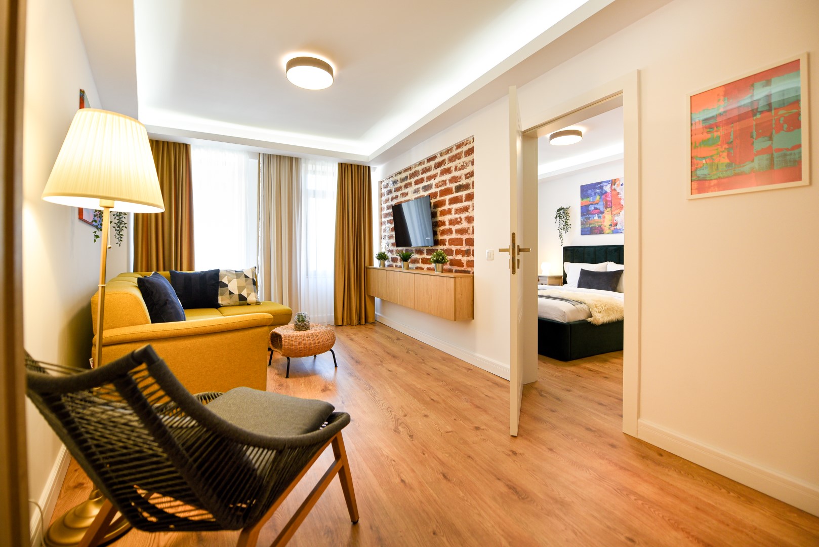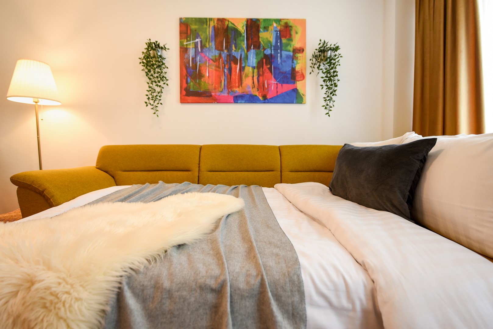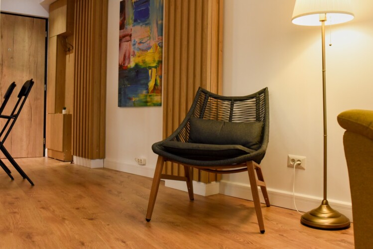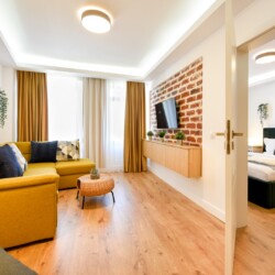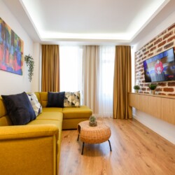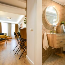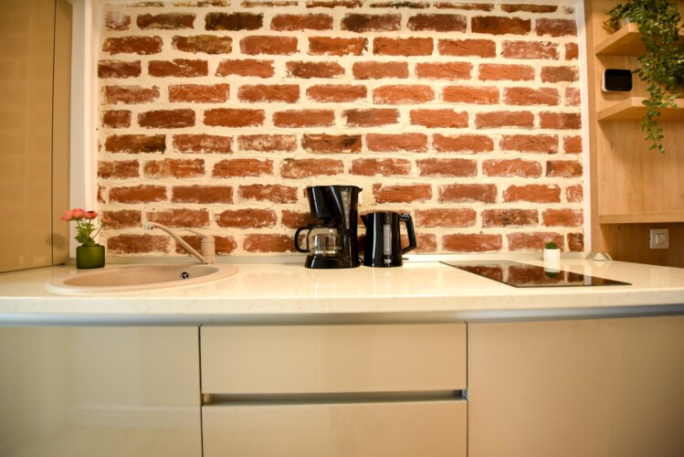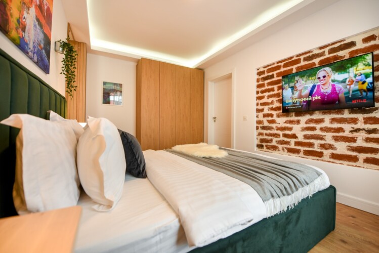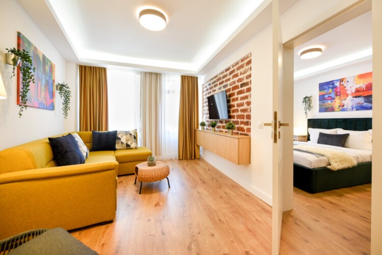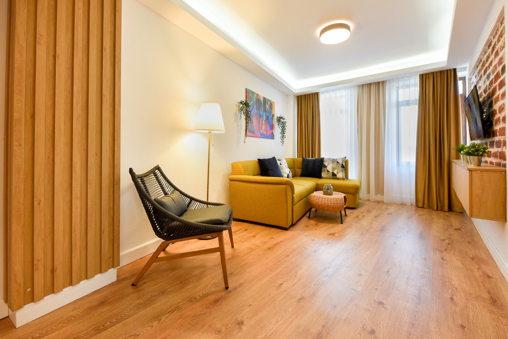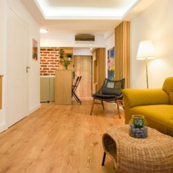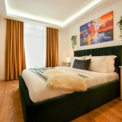 Even if the design is minimalist, following a contemporary style, the warm tones create a cozy feeling. The home is fully equipped and comfortable. The living room is an open space shared with a modern kitchen, ready for guests to use. The bedroom has a wardrobe and a double sized bed for a perfect sleep.