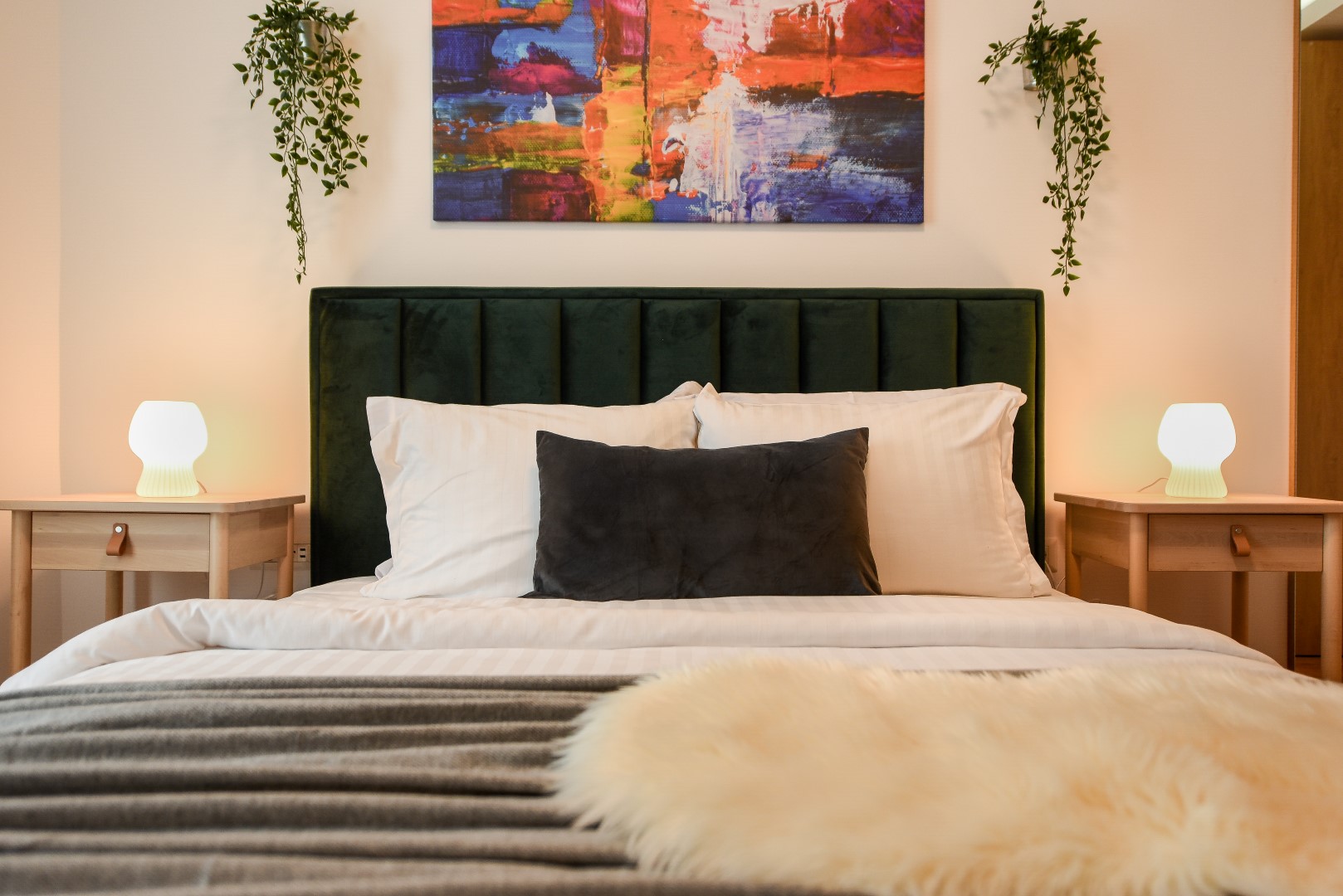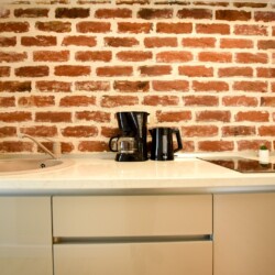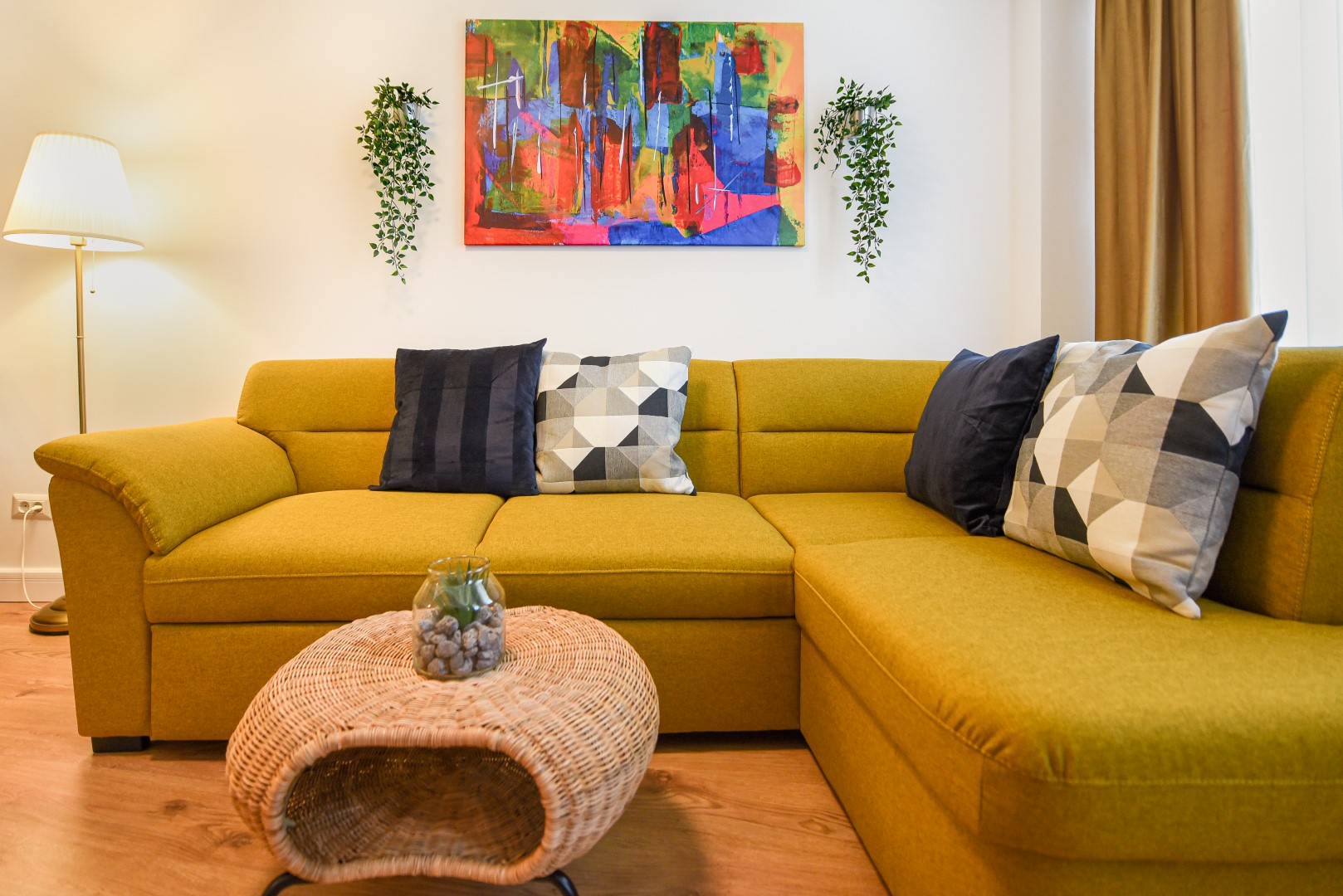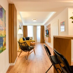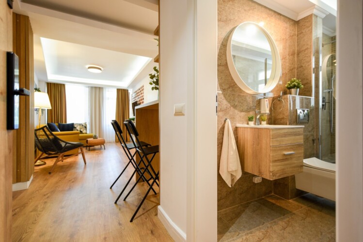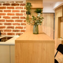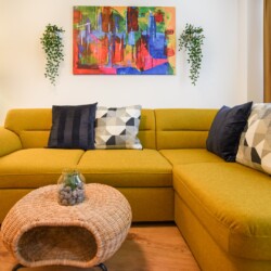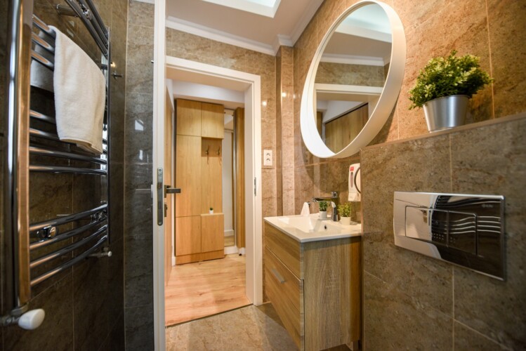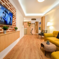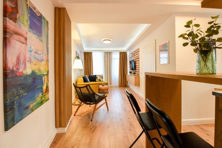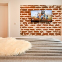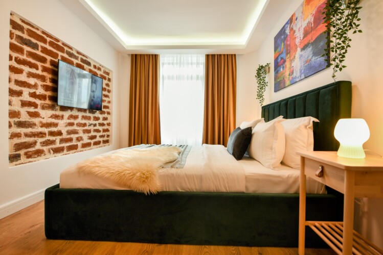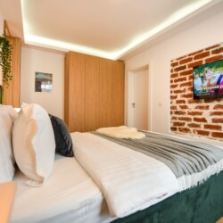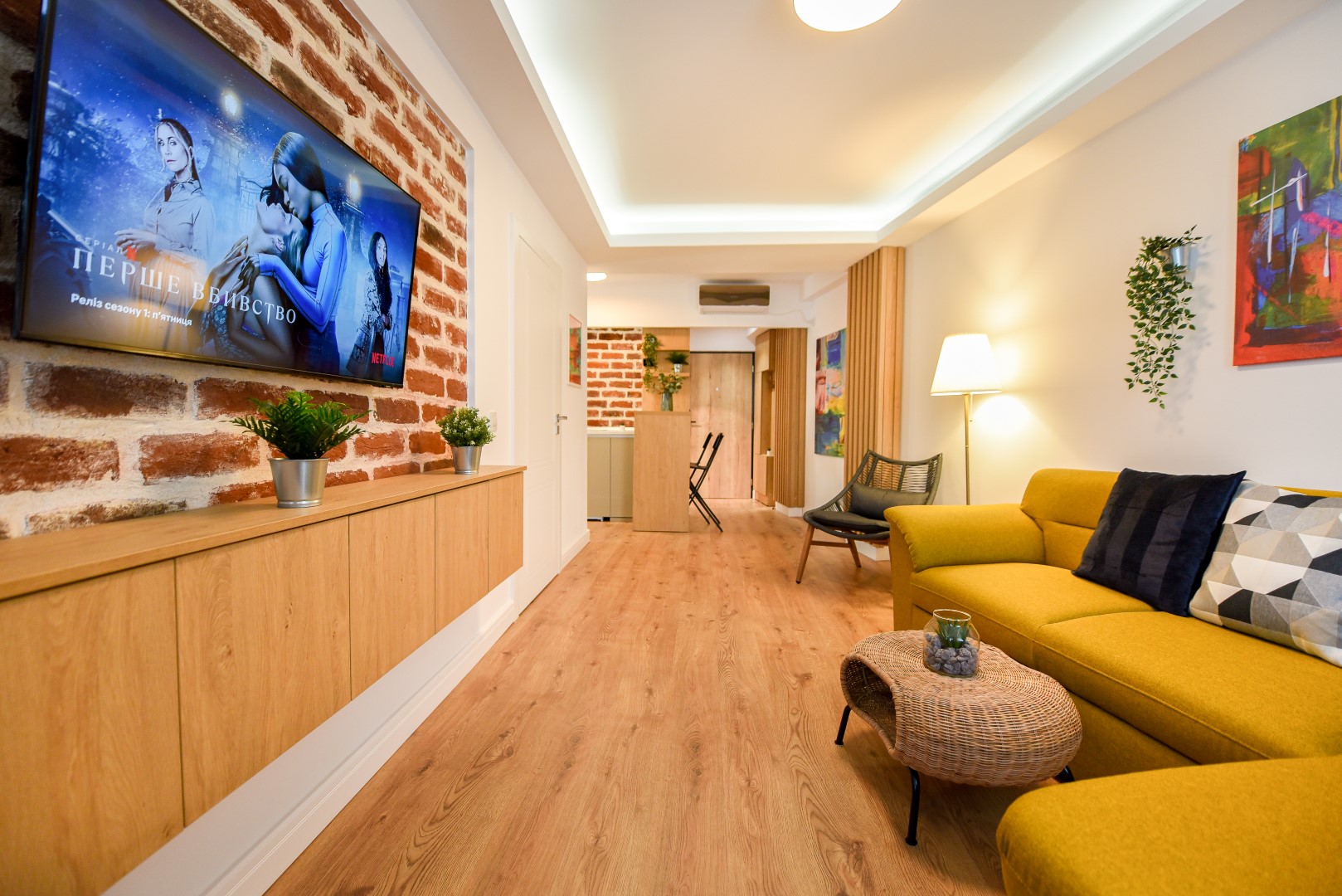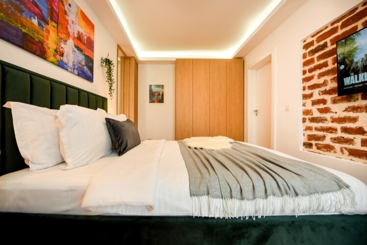 Even if the design is minimalist, following a contemporary style, the warm tones create a cozy feeling. The home is fully equipped and comfortable. The living room is an open space shared with a modern kitchen, ready for guests to use. The bedroom has a wardrobe and a double sized bed for a perfect sleep.