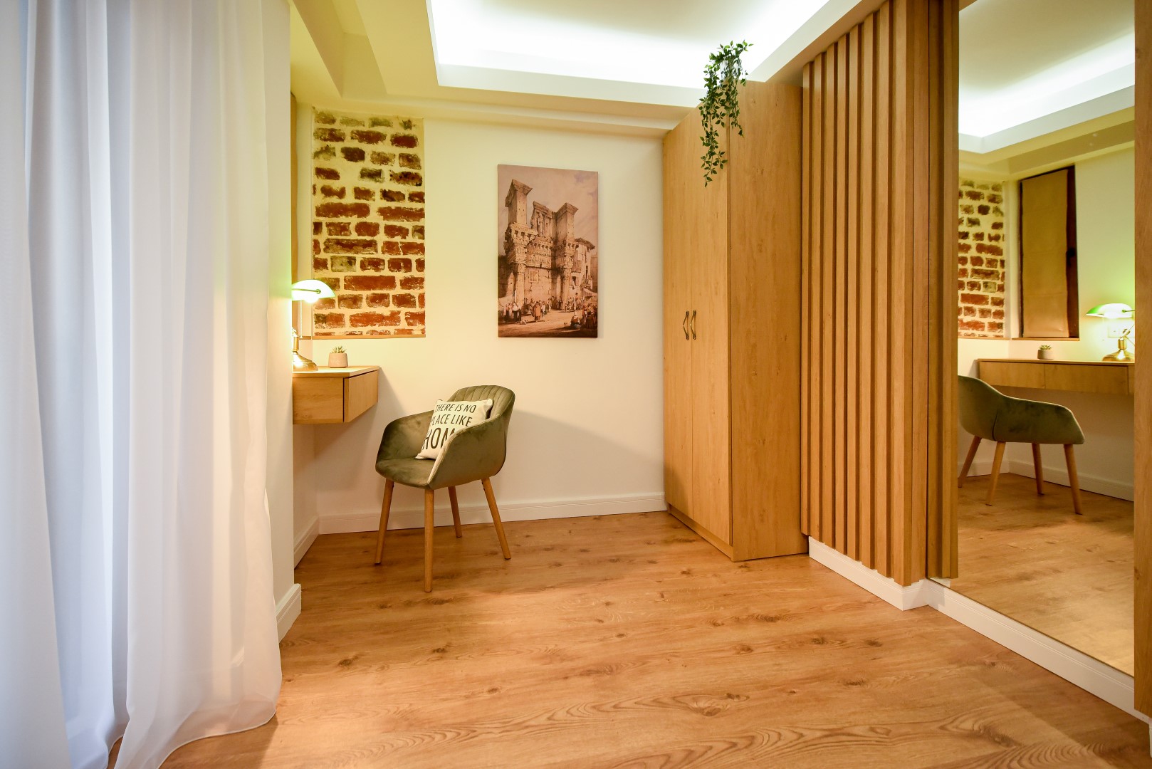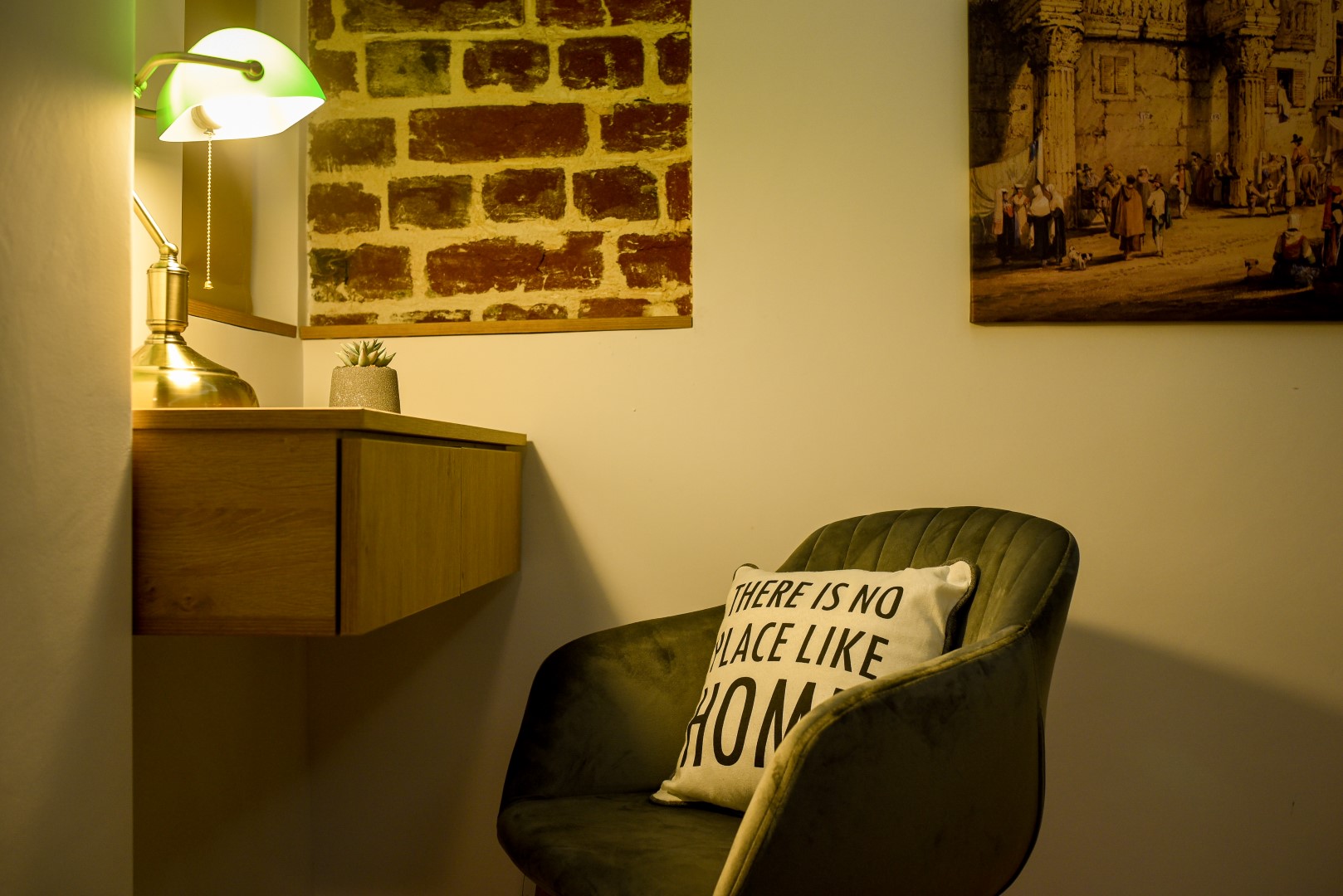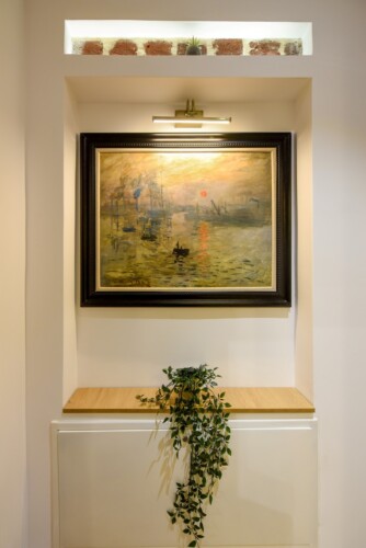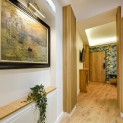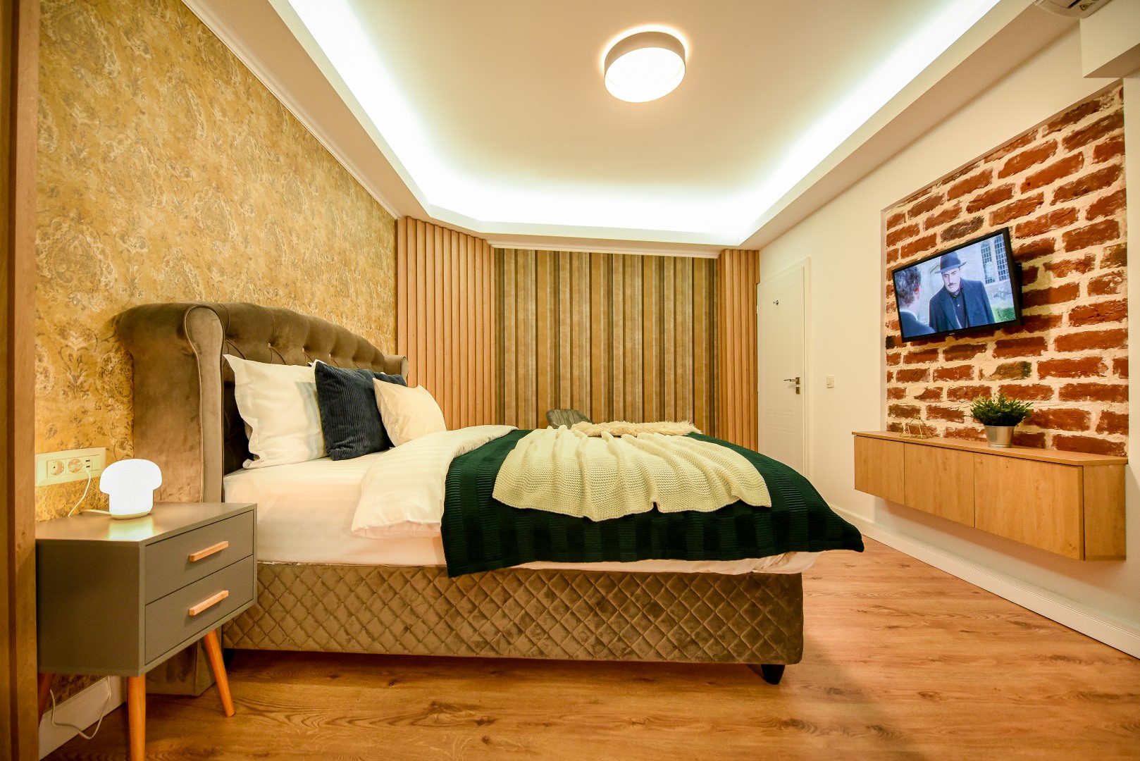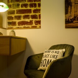 This home will surprise you! Combining a variety of patterns, the ingenious design manages to create a unitary whole abounding in warmth and elegance. The exposed red bricks contrast beautifully against wooden elements and artistic wallpapers, creating a unique aesthetic.