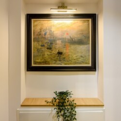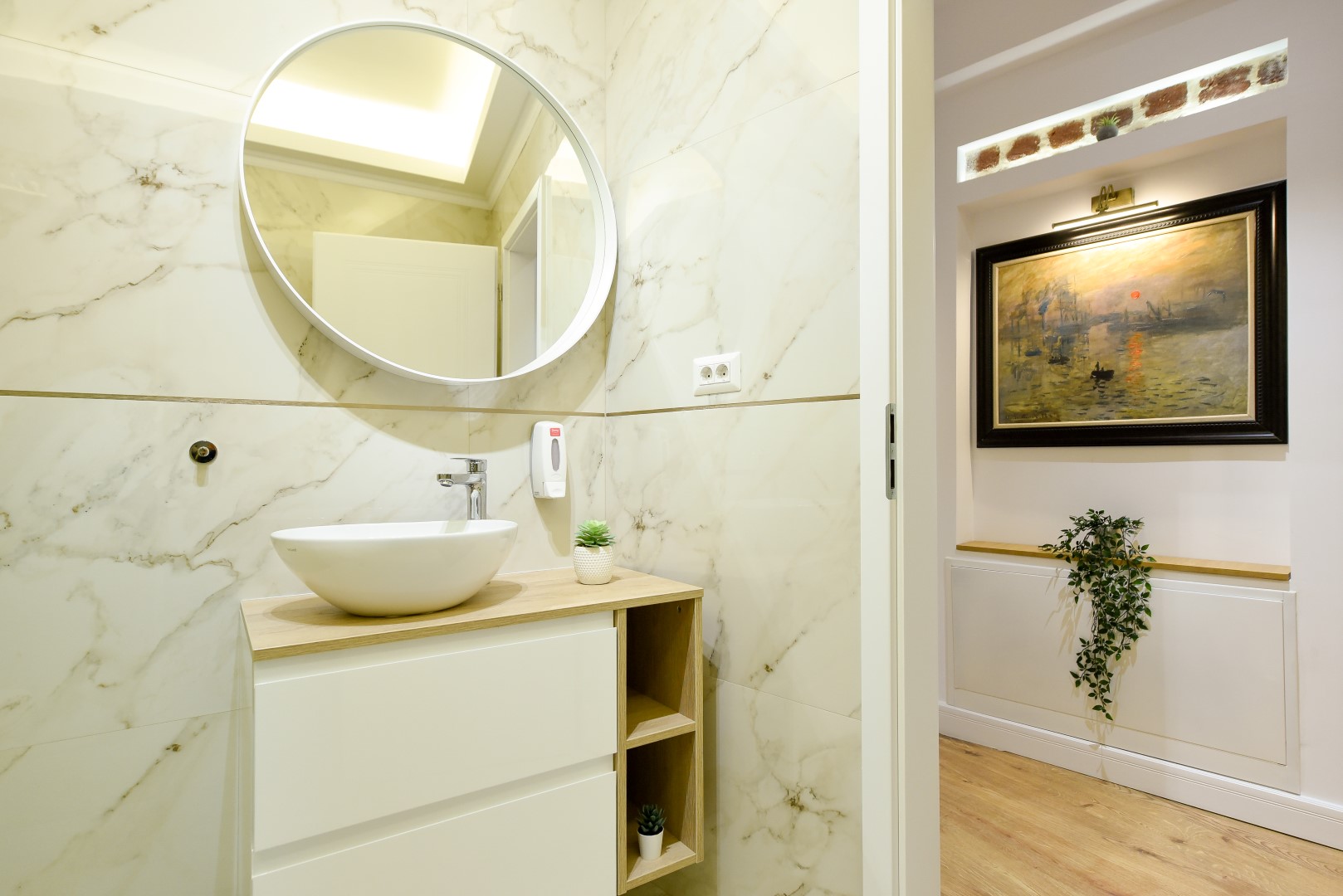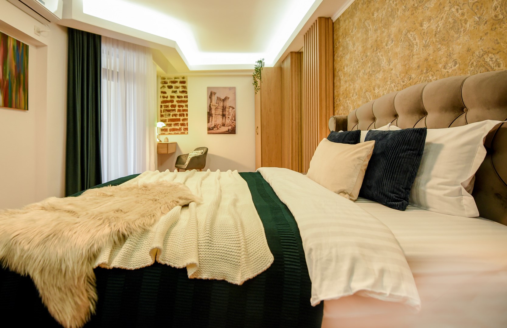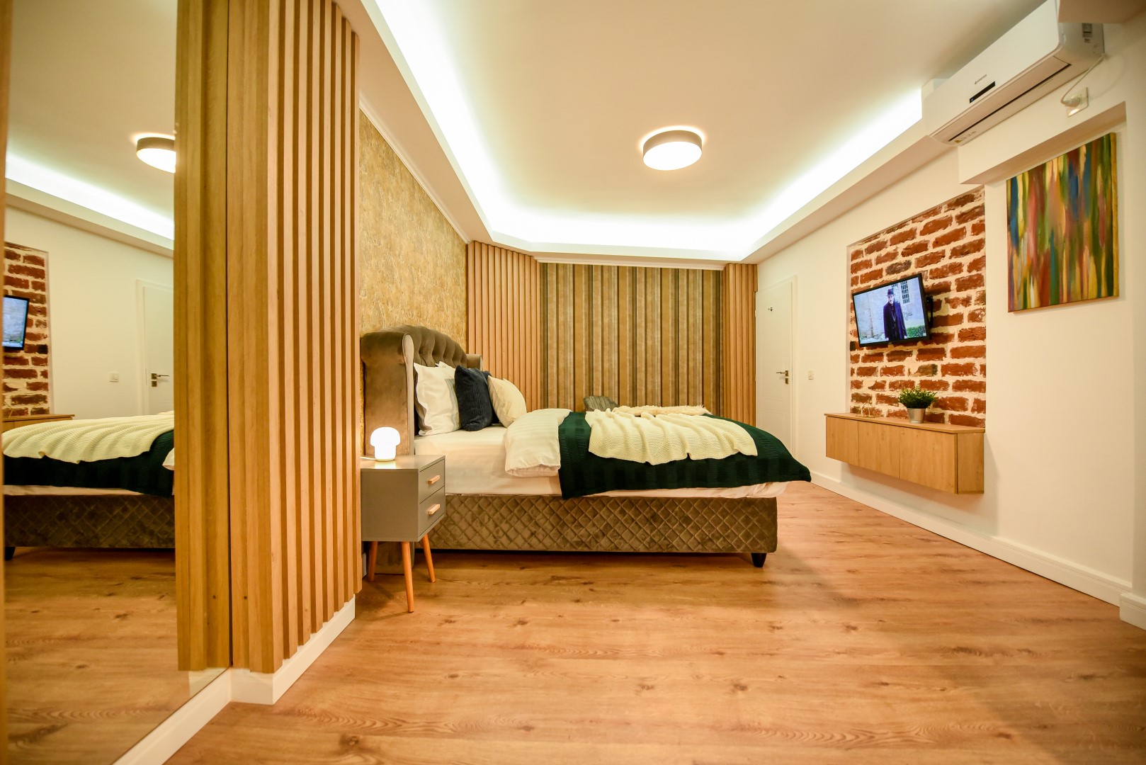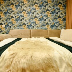 This home will surprise you! Combining a variety of patterns, the ingenious design manages to create a unitary whole abounding in warmth and elegance. The exposed red bricks contrast beautifully against wooden elements and artistic wallpapers, creating a unique aesthetic.