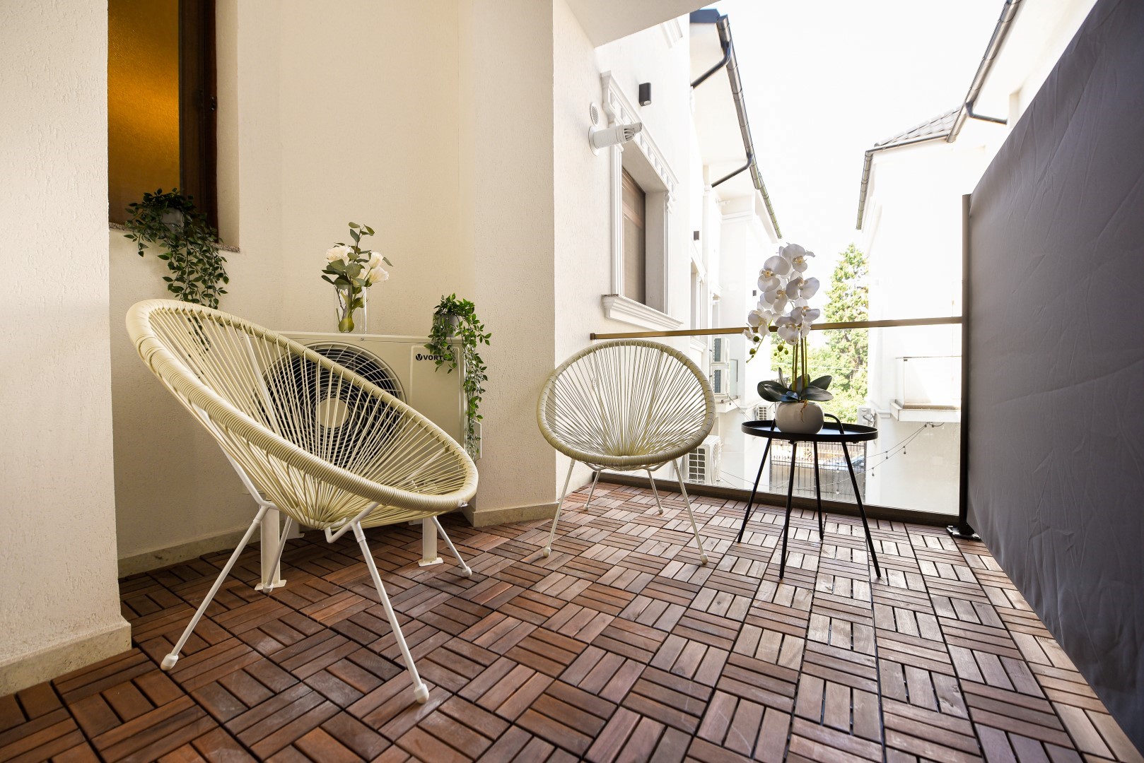 This stylish apartment has a balcony overlooking the inner patio, great for having a glass of wine or enjoying some fresh air in privacy. The home is amazingly quiet, offering a oasis of peace after a long day of activities.