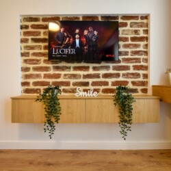 The home is perfect as a cozy base and has a lovely stylish and welcoming feel to it, offered by the bright tones. The brick wall in the living room and the patterns get the design out of the routine and give a modern note.