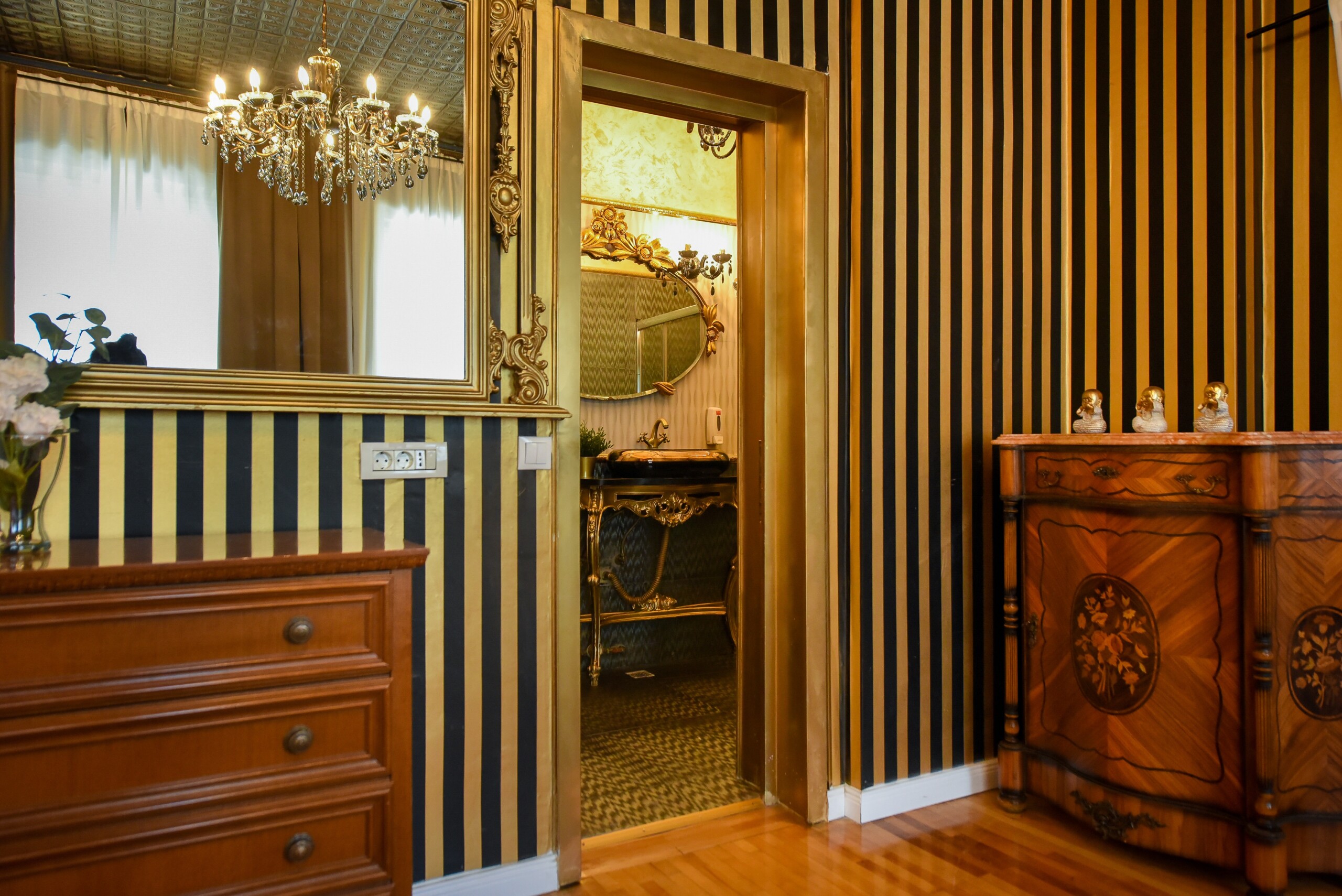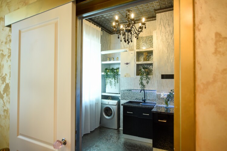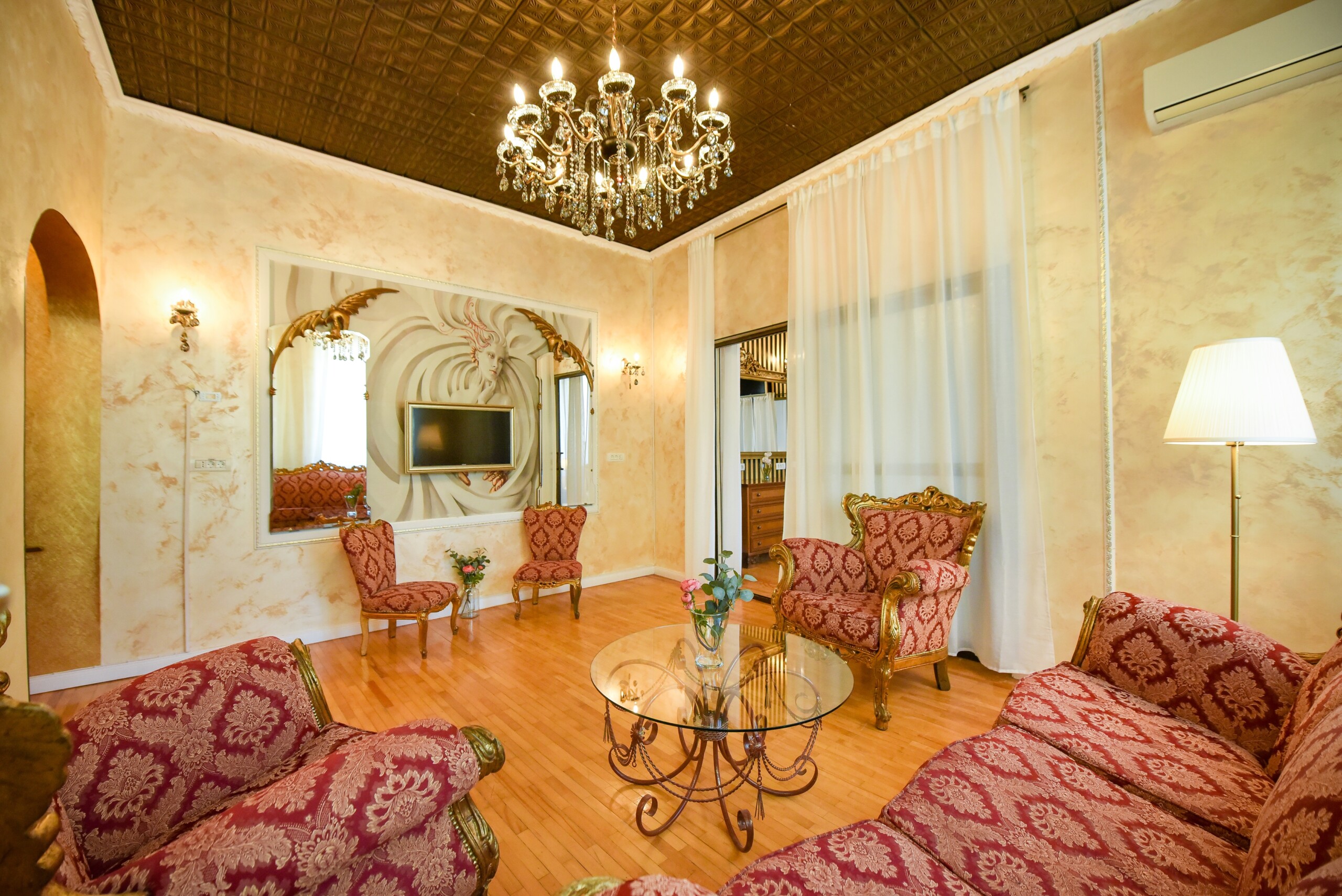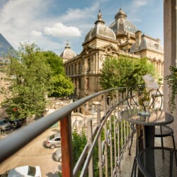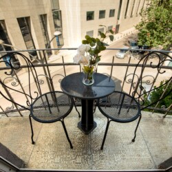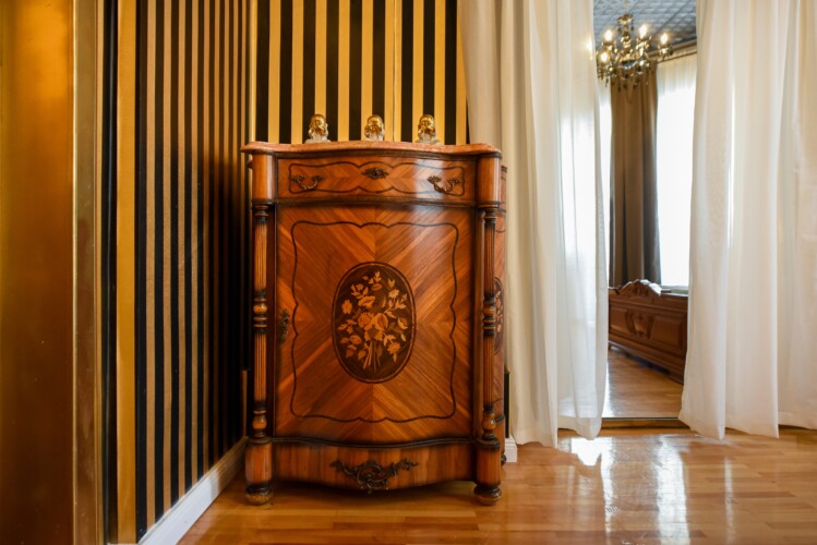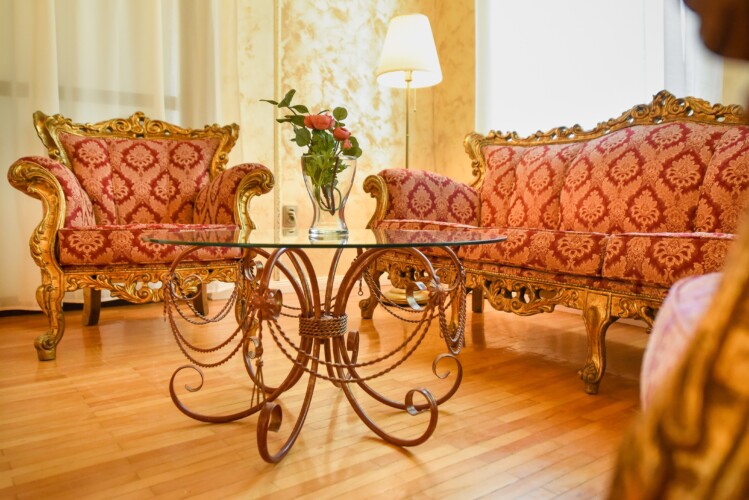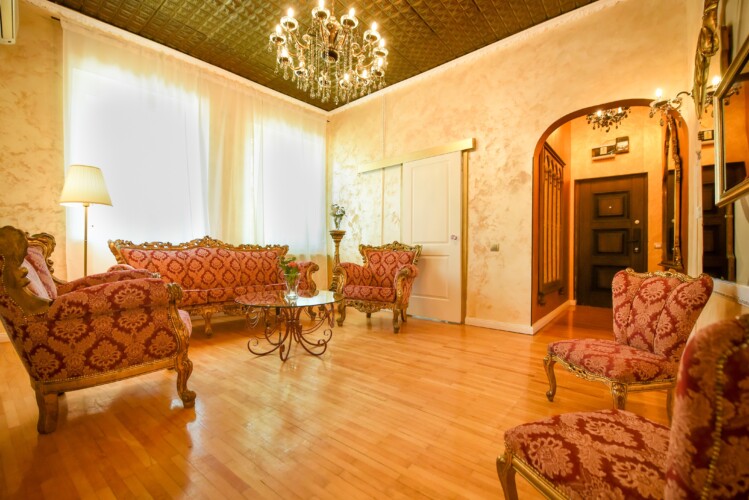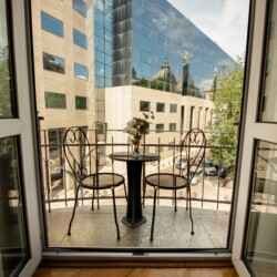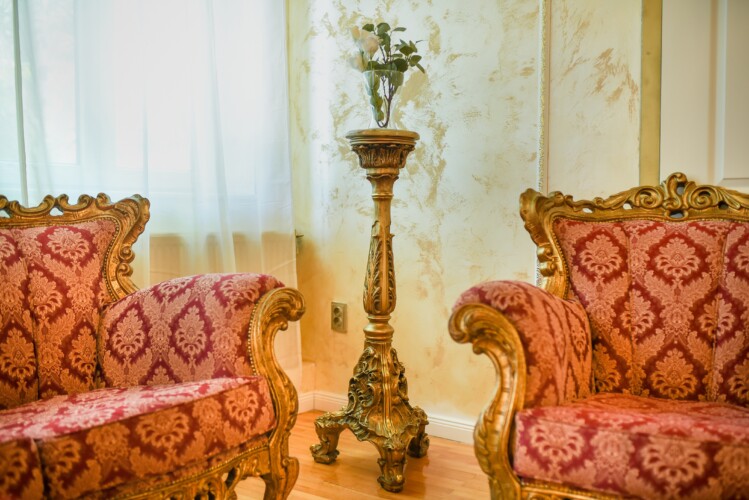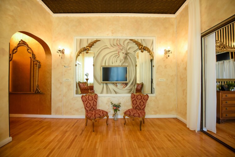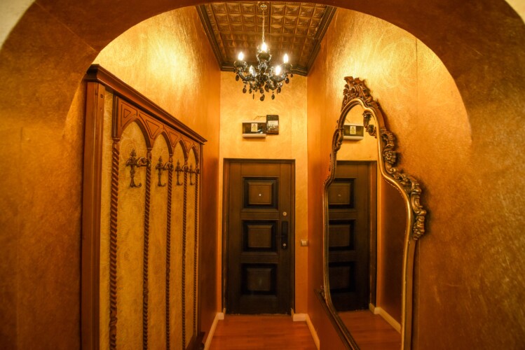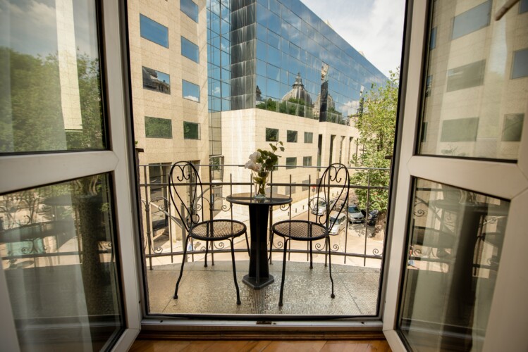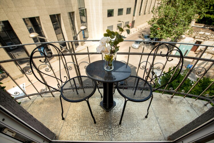 The fascinating incorporation of the baroque furnishings and decorations in a modern functional space creates an amazing home that is an absolute pleasure to be in. The cozy balcony with vintage furniture is a delight.