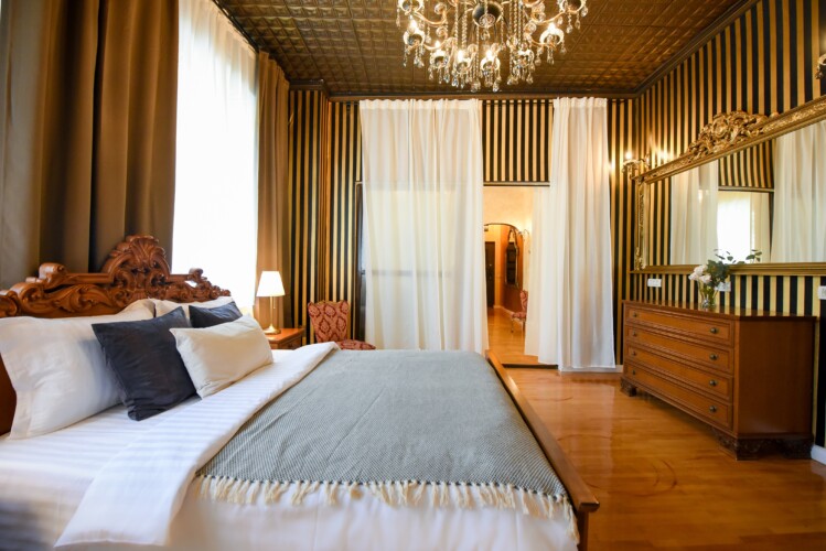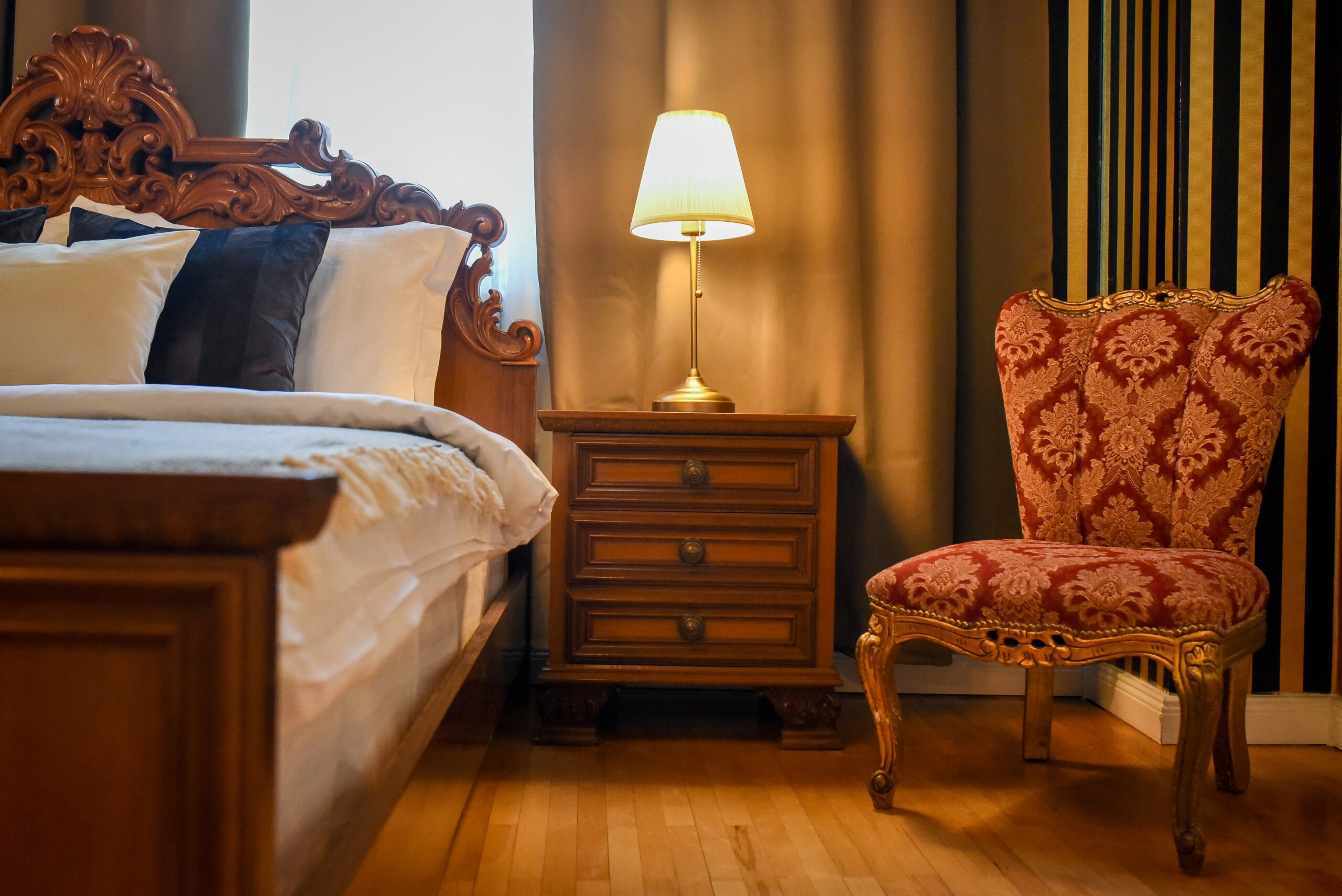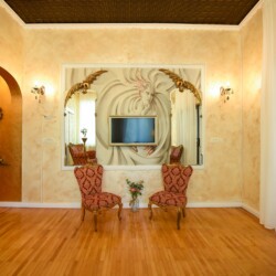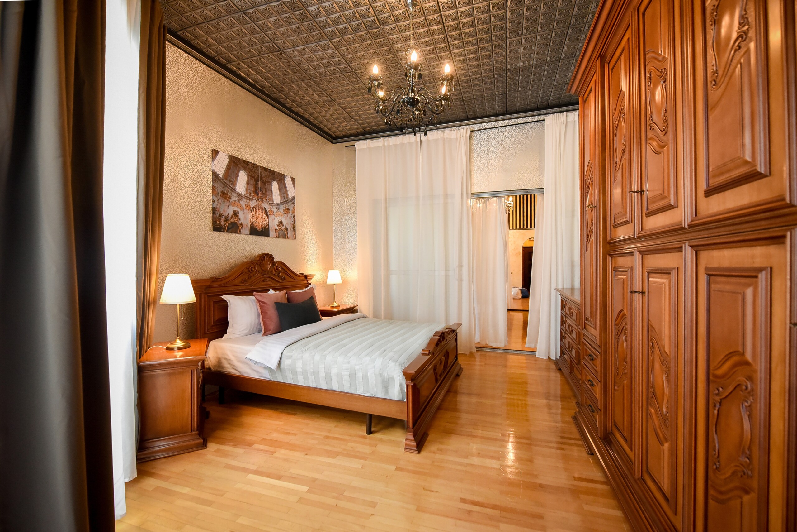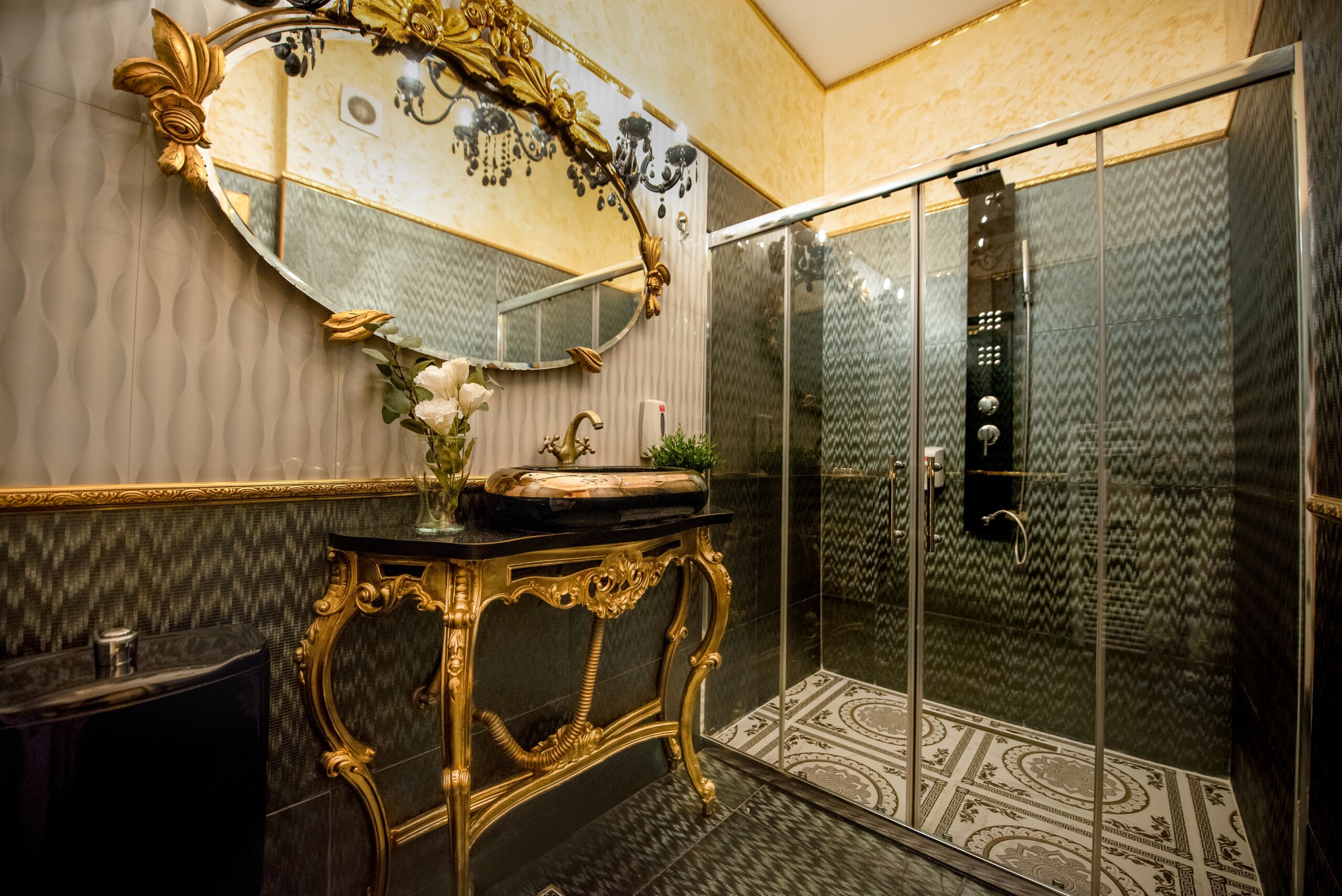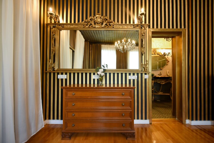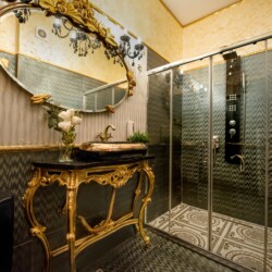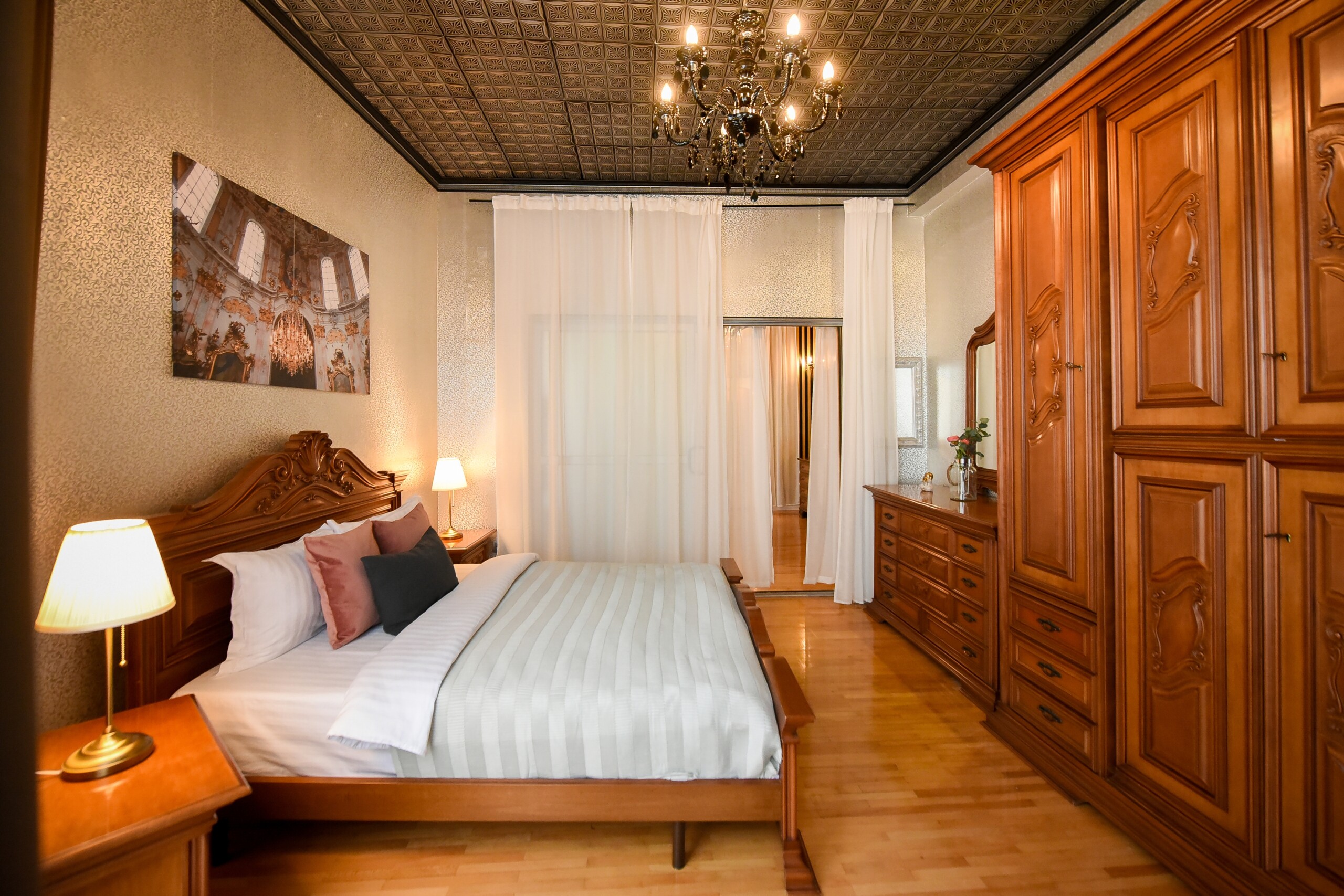 The fascinating incorporation of the baroque furnishings and decorations in a modern functional space creates an amazing home that is an absolute pleasure to be in. The cozy balcony with vintage furniture is a delight.