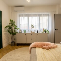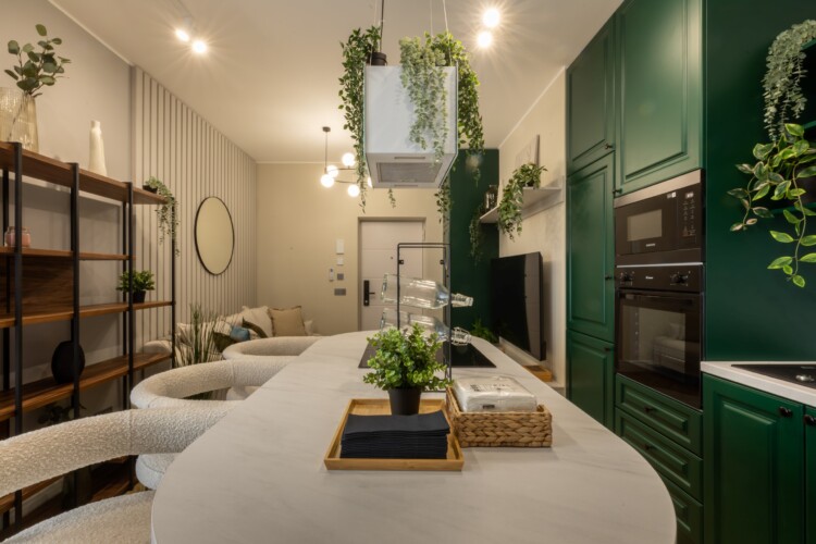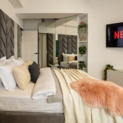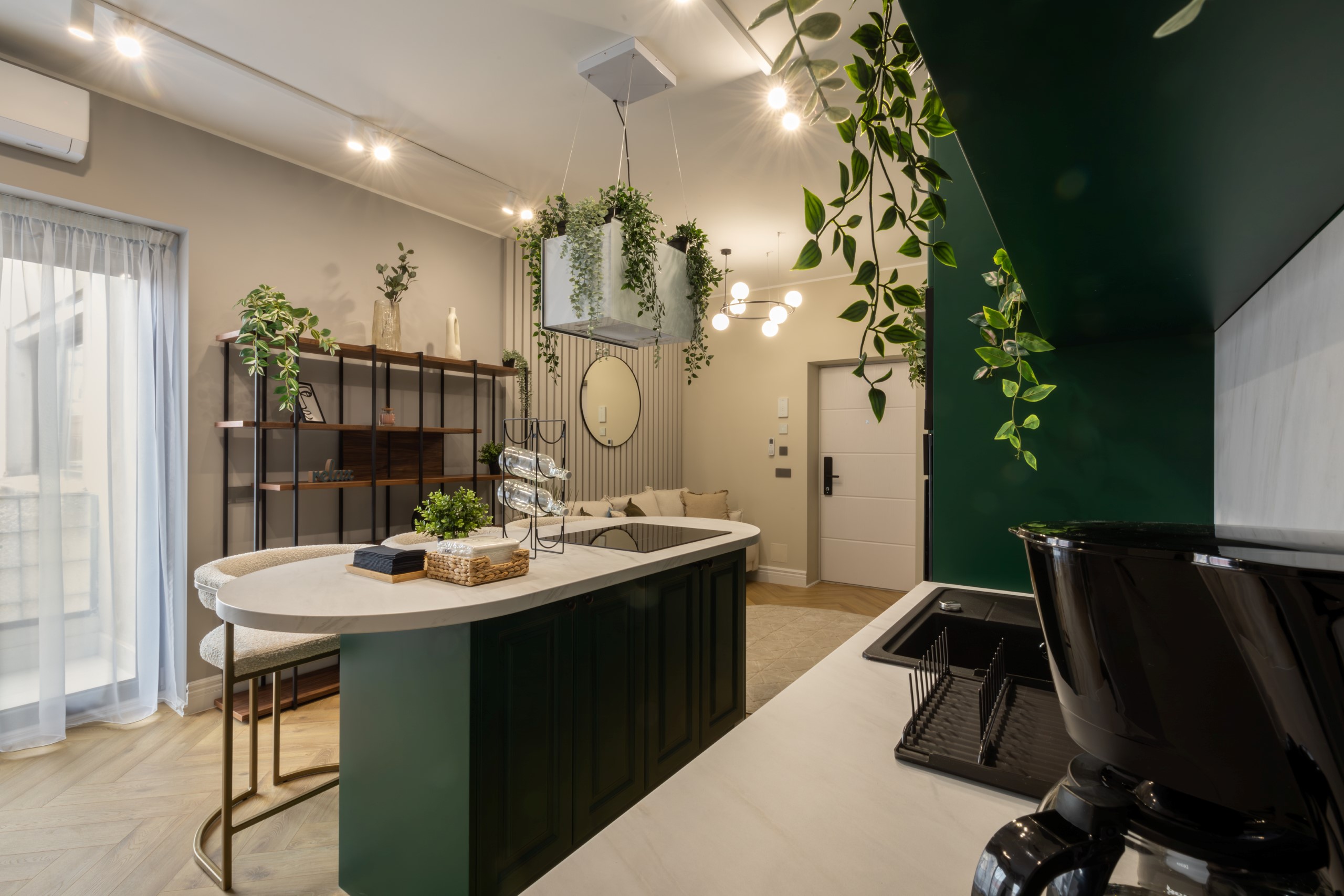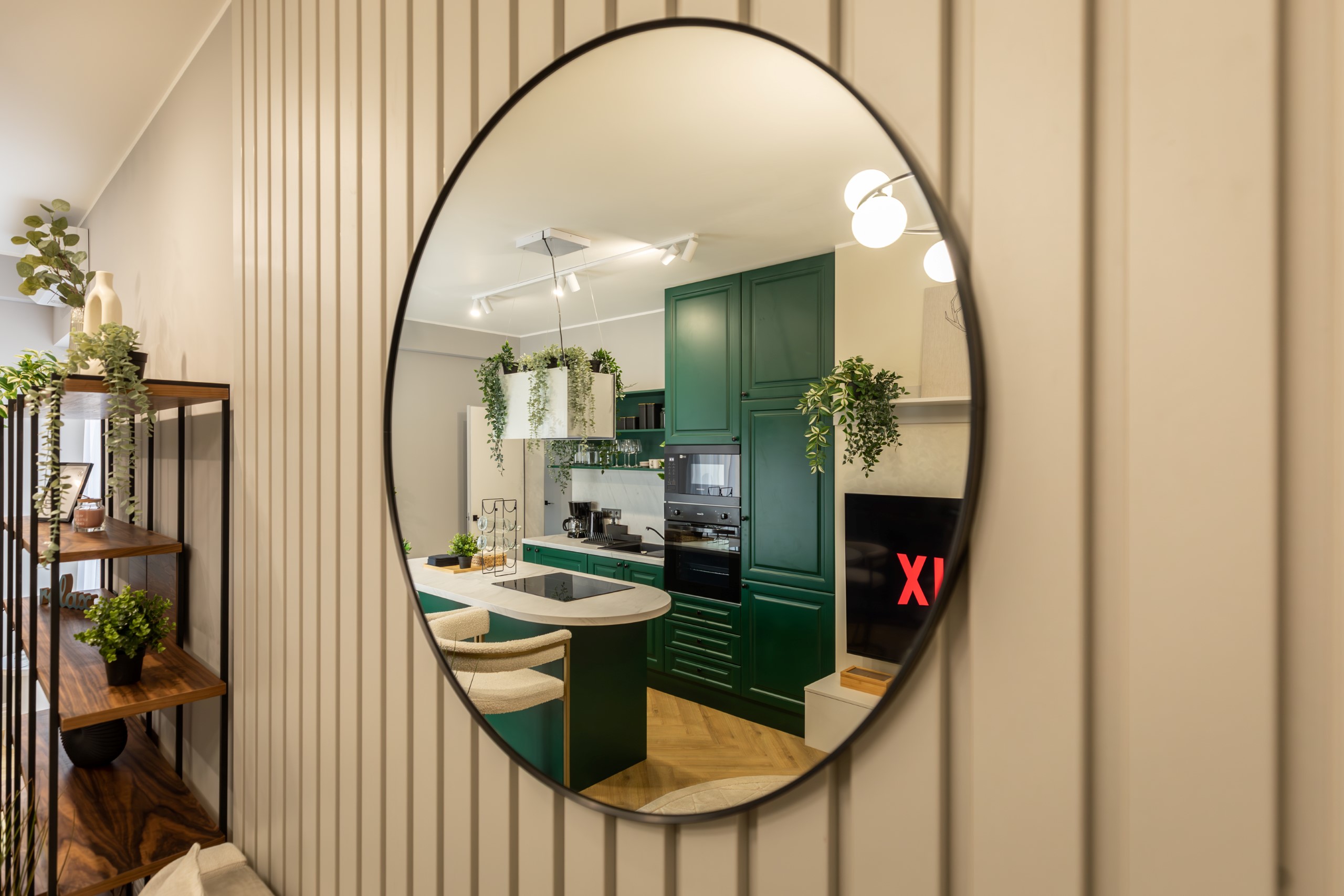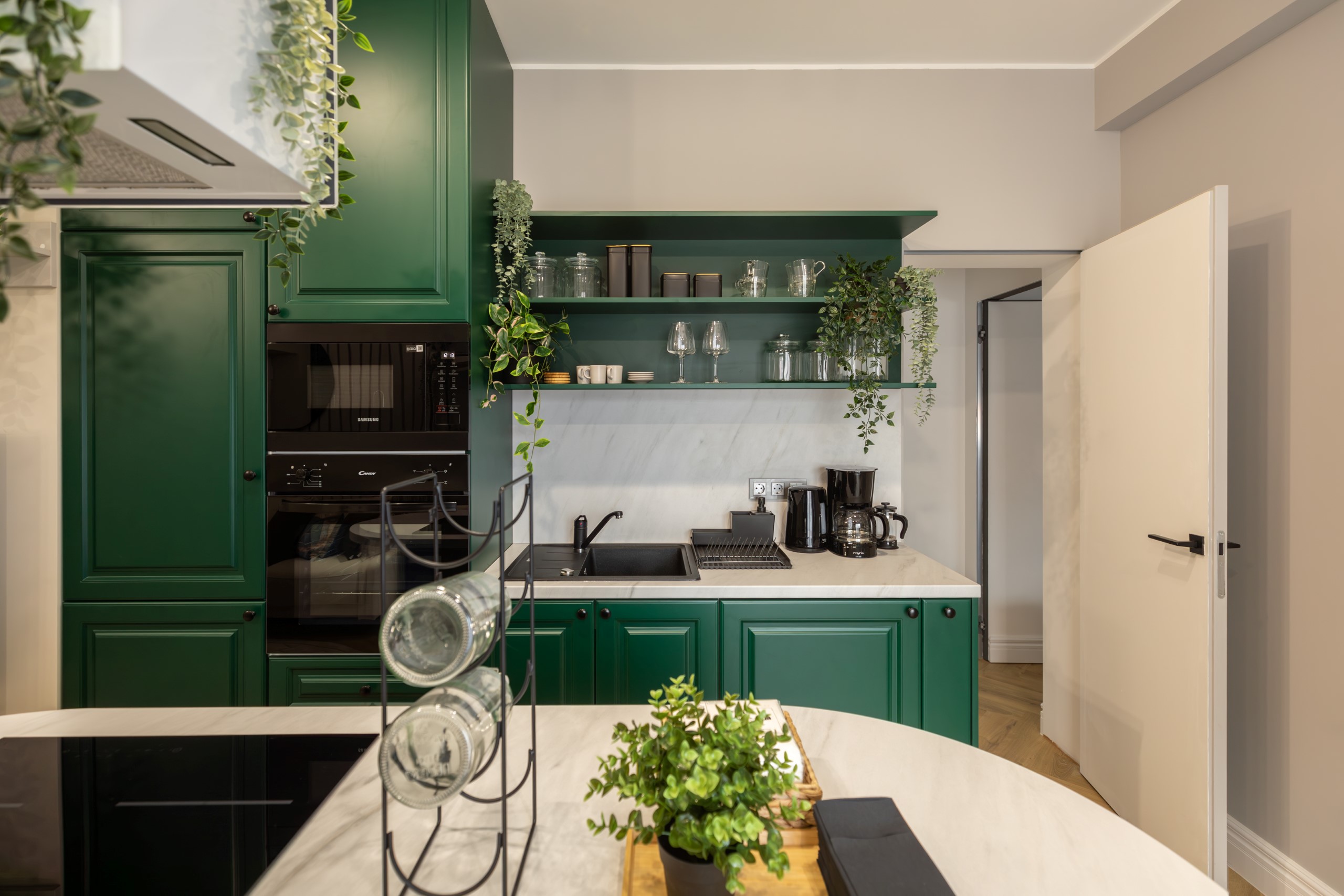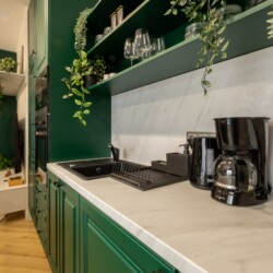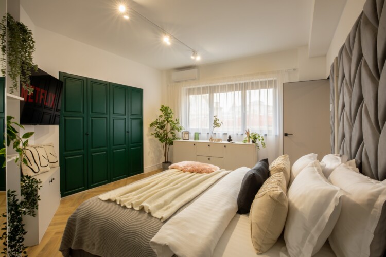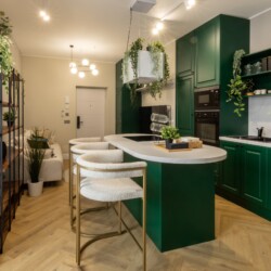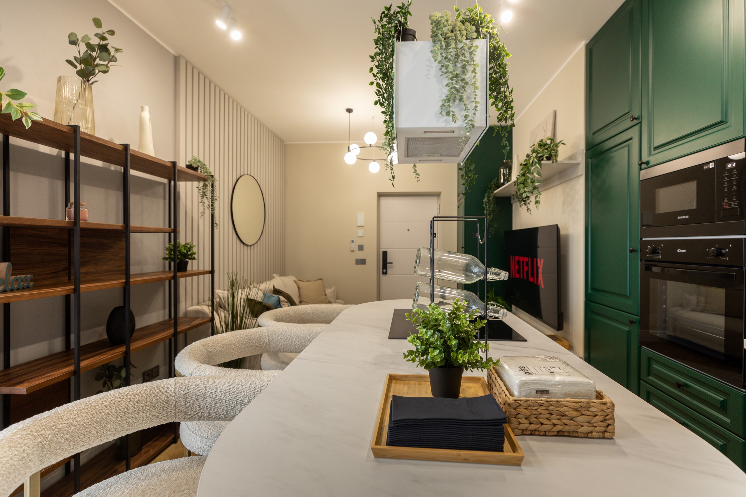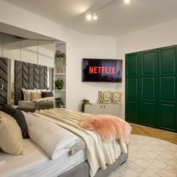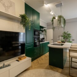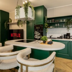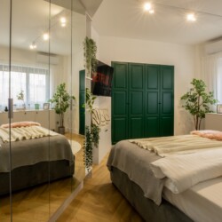 Immerse yourself in a space adorned with modern furniture and state-of-the-art appliances, ensuring utmost comfort and convenience during your stay. The mirror wardrobe adds a touch of elegance, while green elements throughout the apartment create a refreshing ambiance.