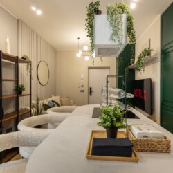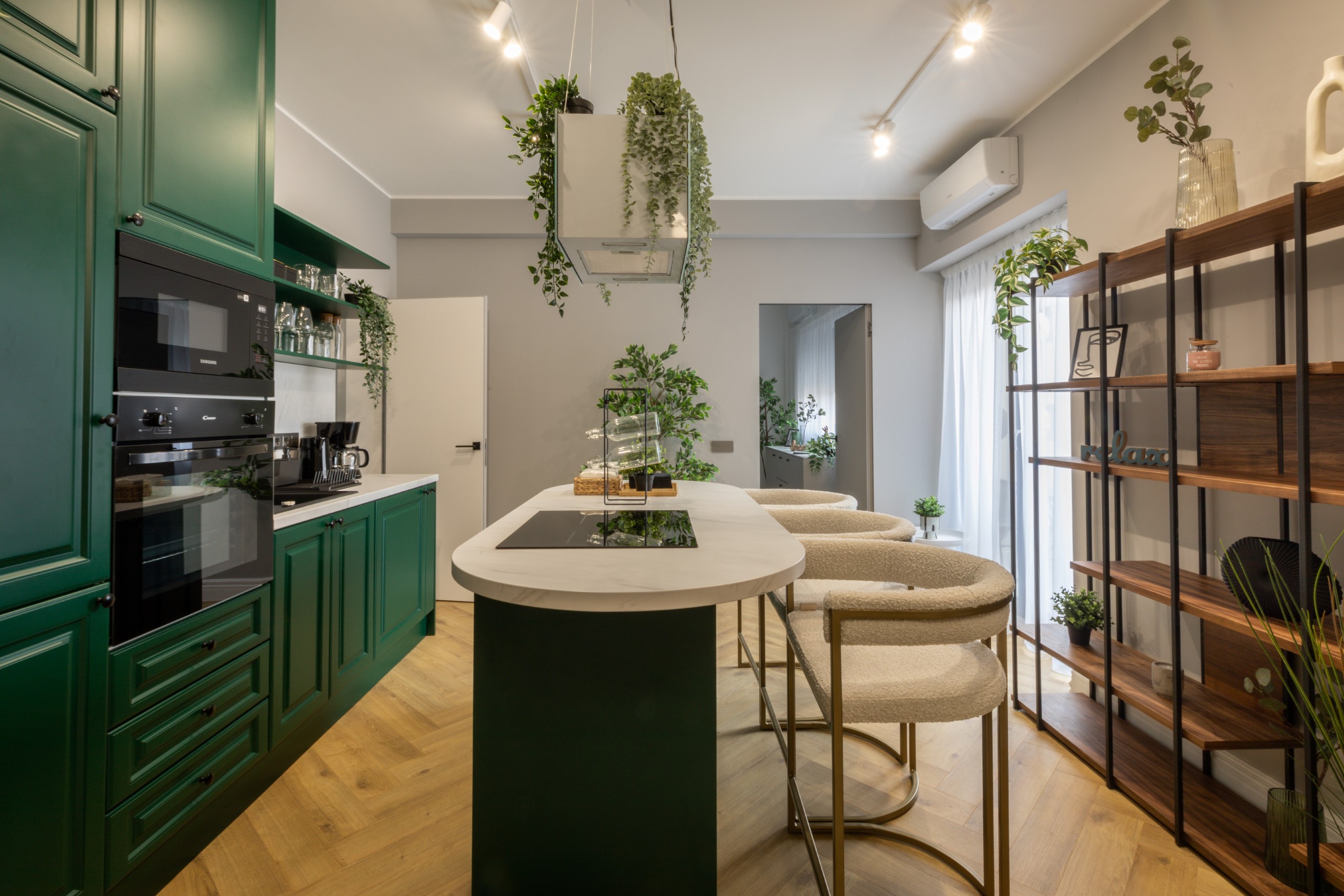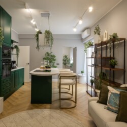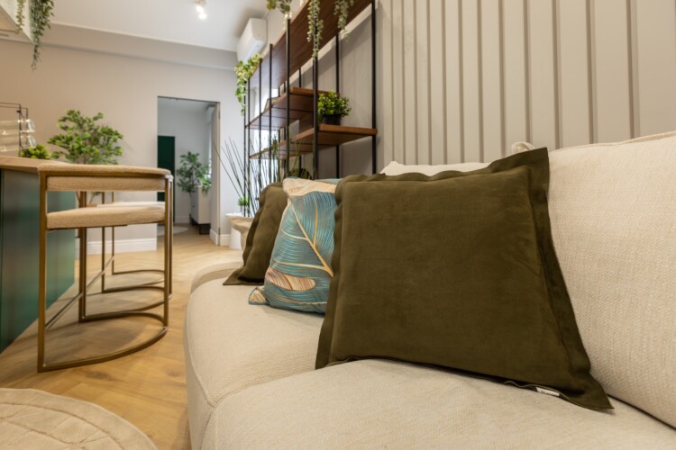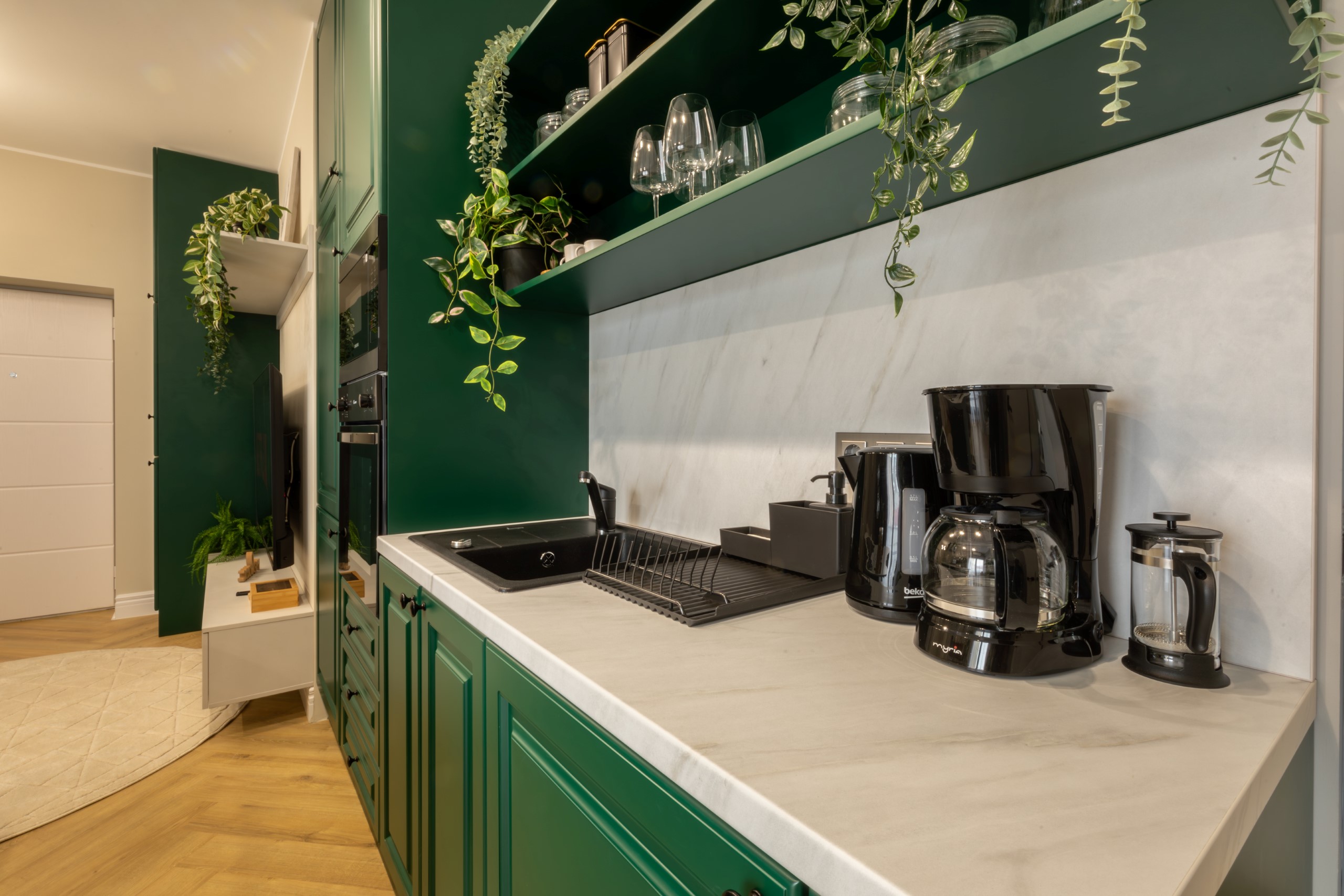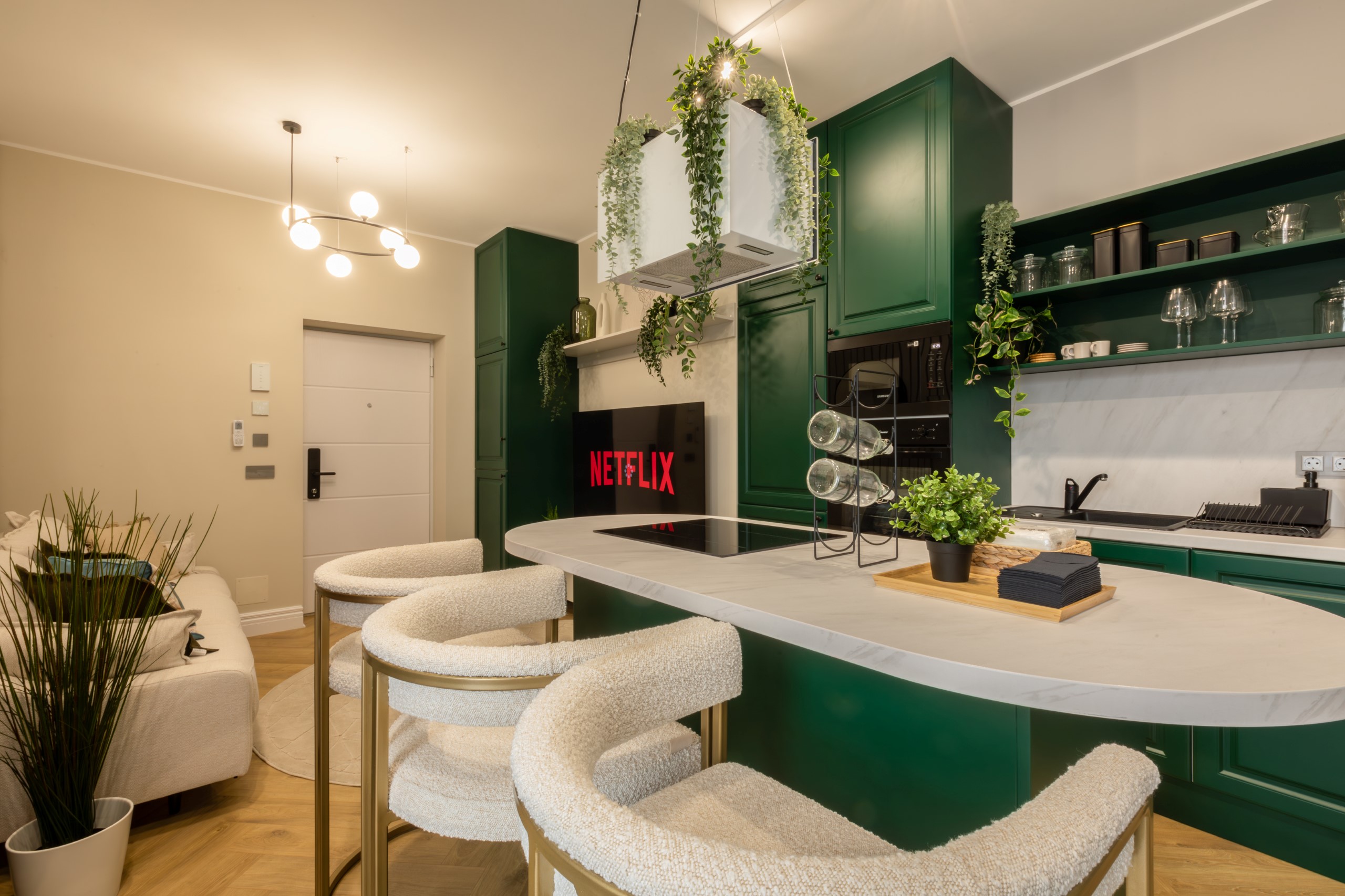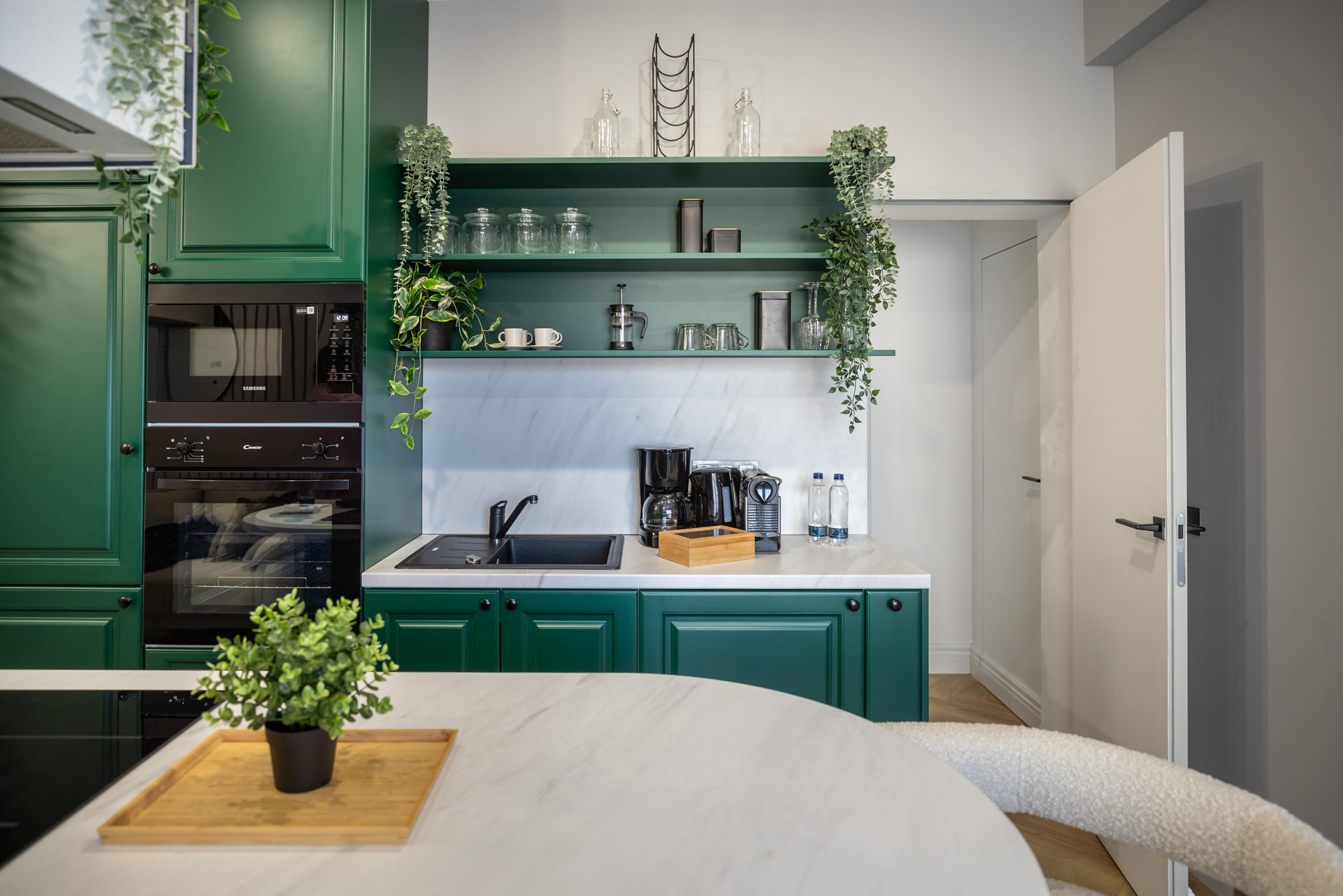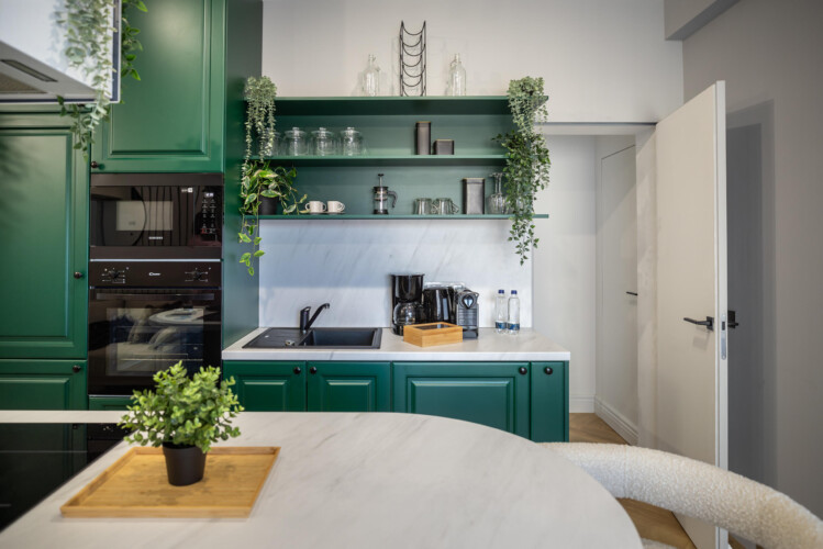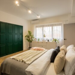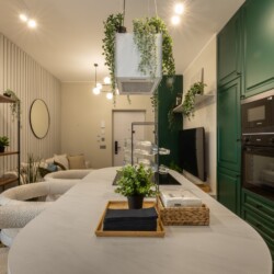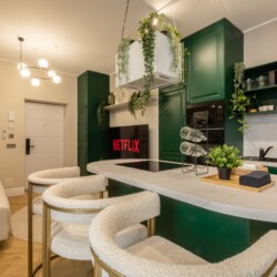 Immerse yourself in a space adorned with modern furniture and state-of-the-art appliances, ensuring utmost comfort and convenience during your stay. The mirror wardrobe adds a touch of elegance, while green elements throughout the apartment create a refreshing ambiance.
