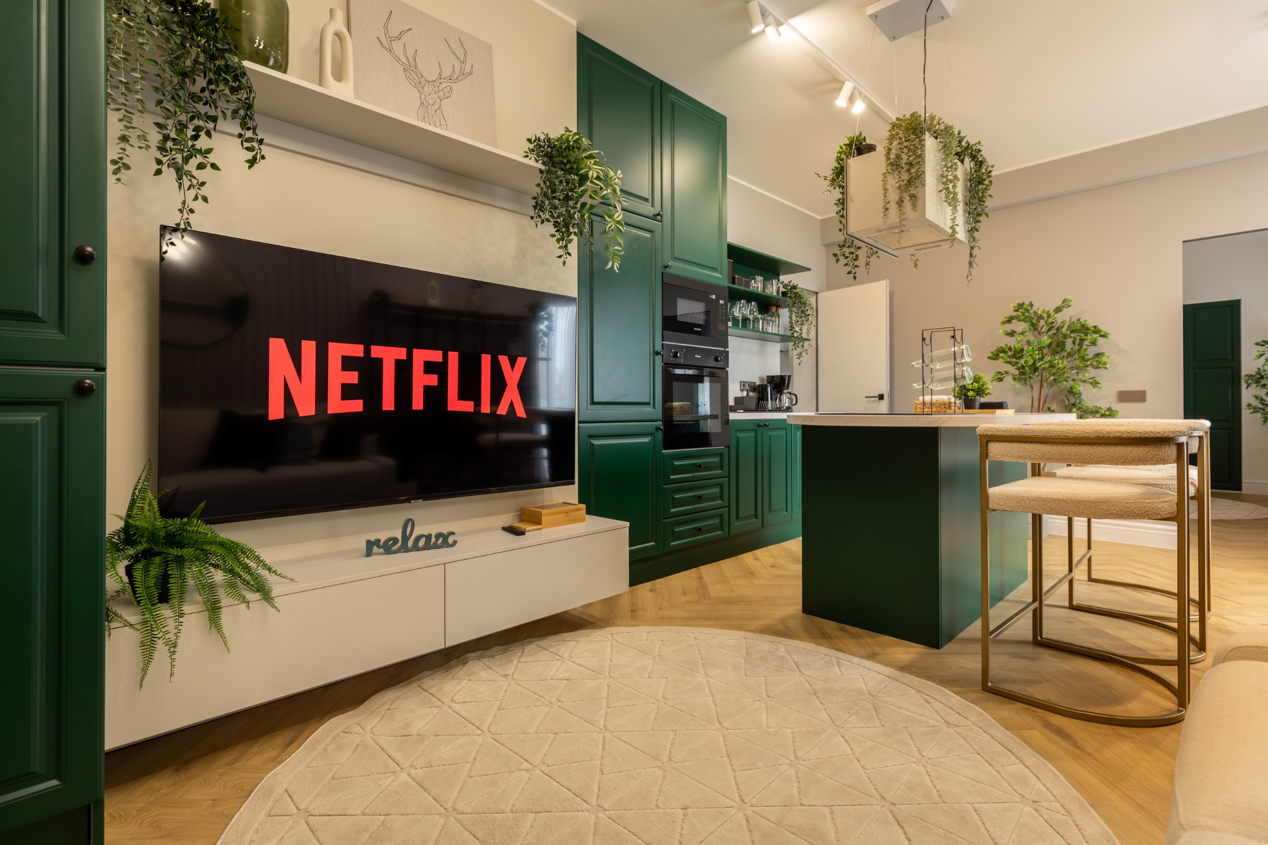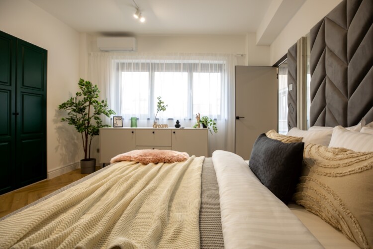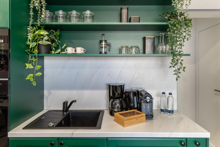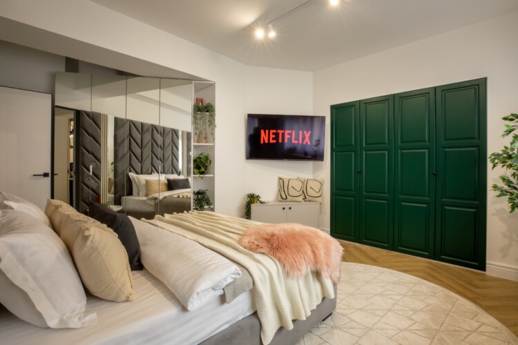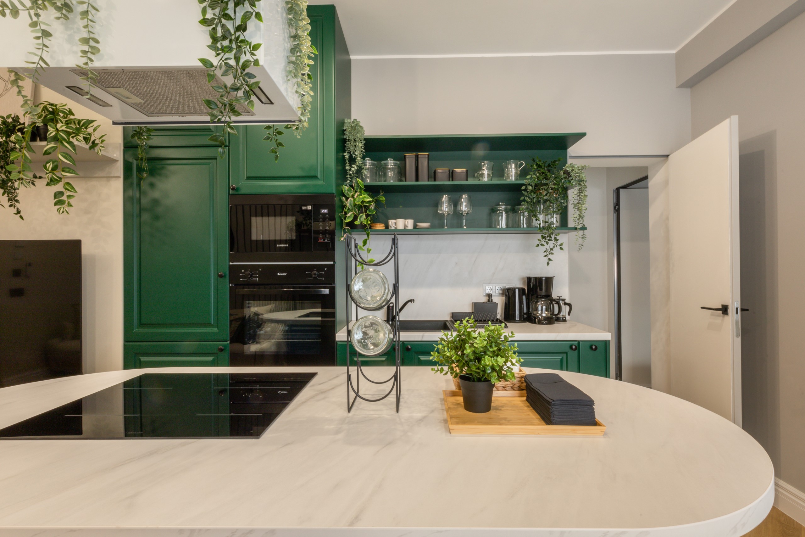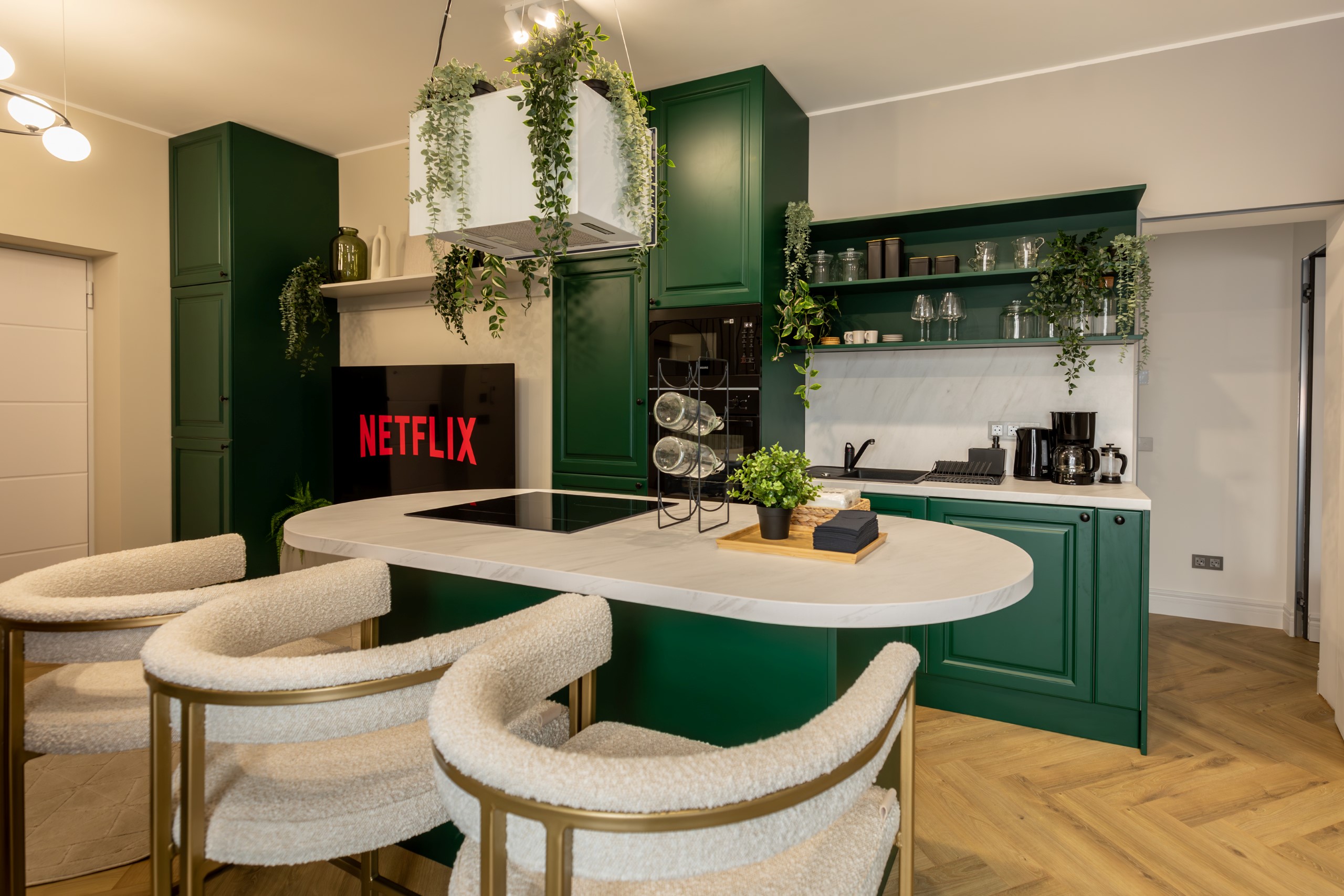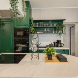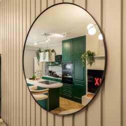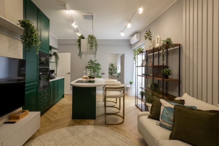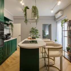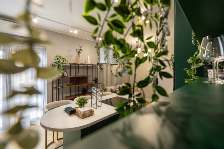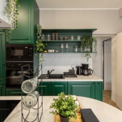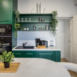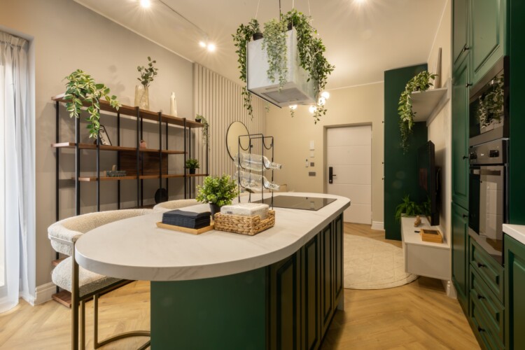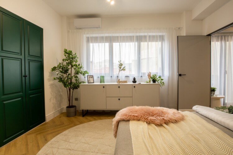 Immerse yourself in a space adorned with modern furniture and state-of-the-art appliances, ensuring utmost comfort and convenience during your stay. The mirror wardrobe adds a touch of elegance, while green elements throughout the apartment create a refreshing ambiance.